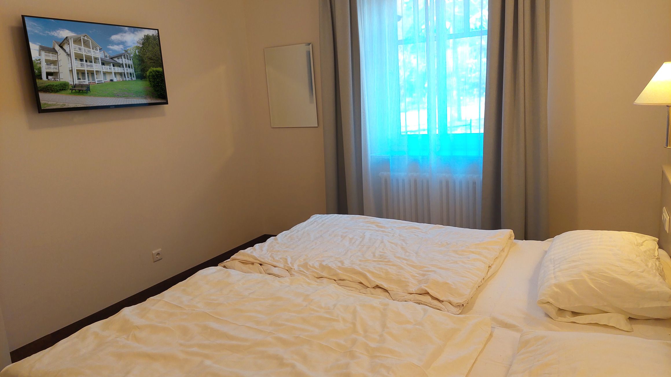 Von dort aus gelangen Sie auch ins Schlafzimmer, welches mit einem Doppelbett und einem zusätzlichen TV ausgestattet ist.