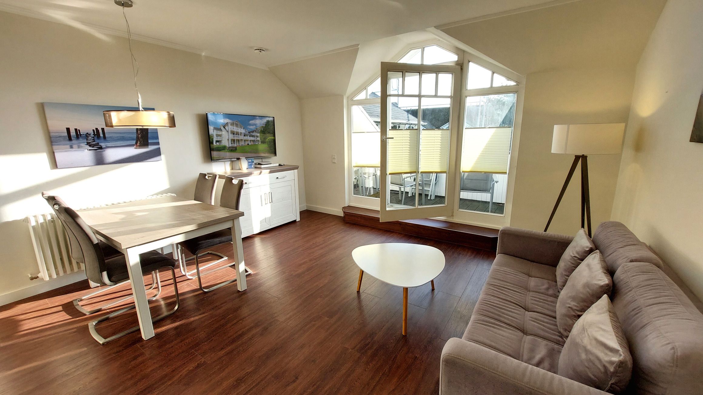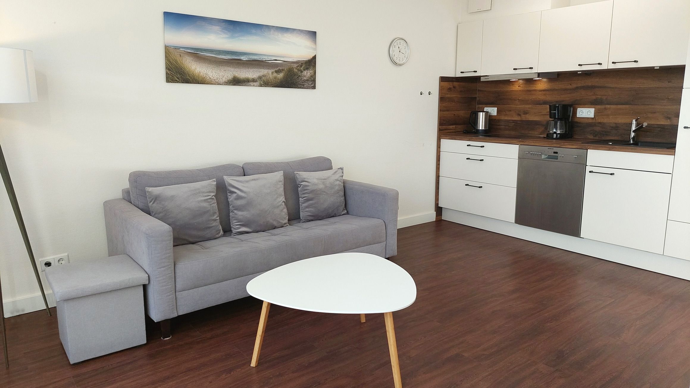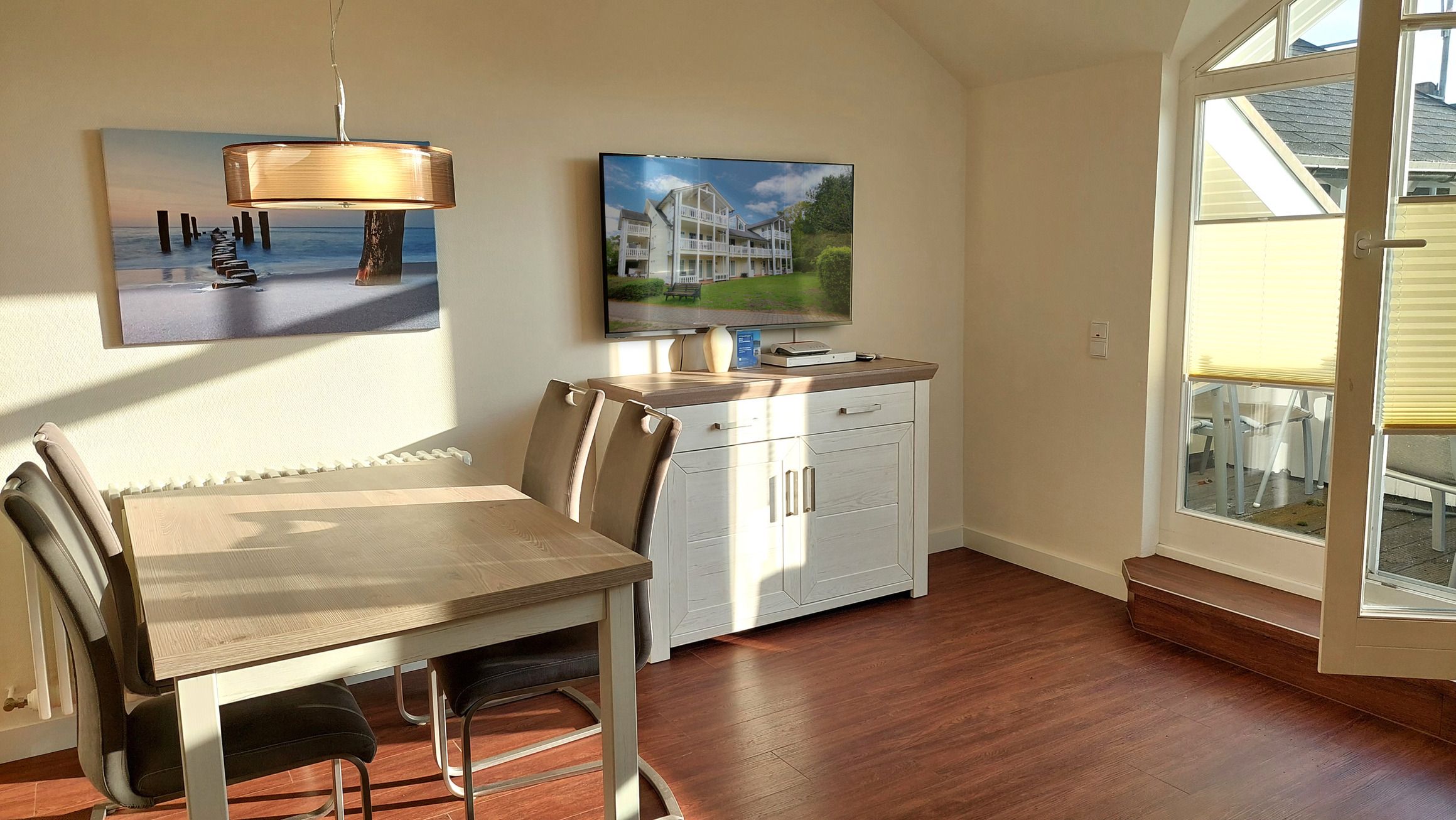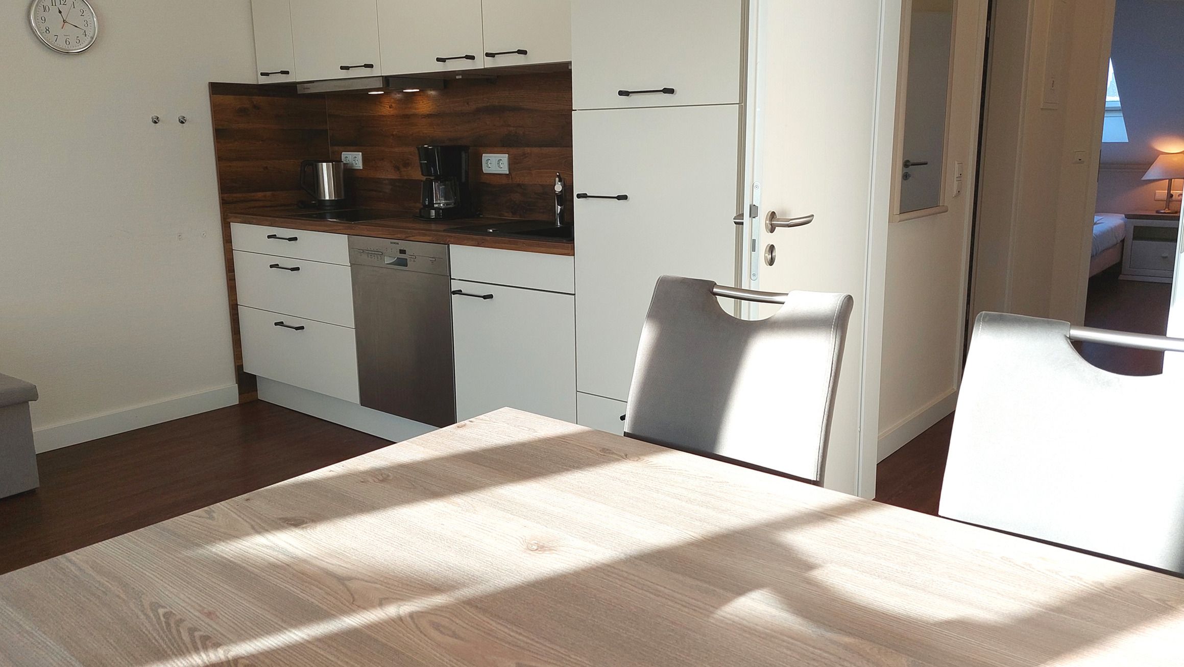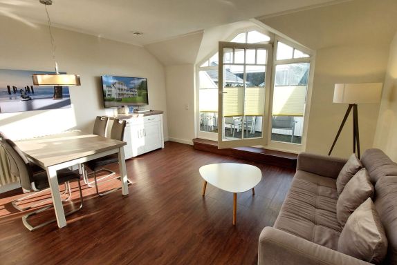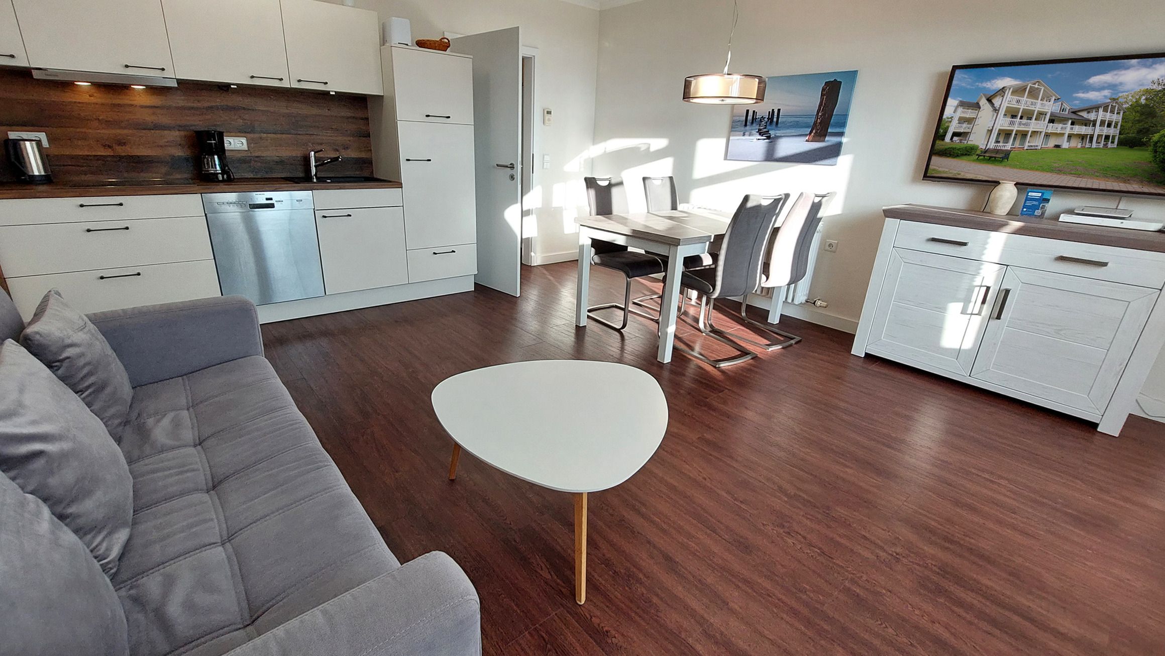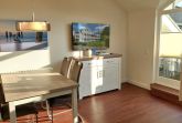 Der Wohn- und Essbereich beherbergt eine moderne Küchenzeile mit Ceran-Kochfeldern, einem Geschirrspüler, einem Kühlschrank mit Gefrierfach, einer Mikrowelle und verschiedenen Küchenutensilien. Der Essbereich bietet sogar Platz für 4 Personen und eine gemütliche Sitzlandschaft lädt zum Verweilen ein. Zur technischen Ausstattung gehören kostenfreies WLAN, ein Smart-TV samt Blu-ray-Player und eine kleine Musikanlage.