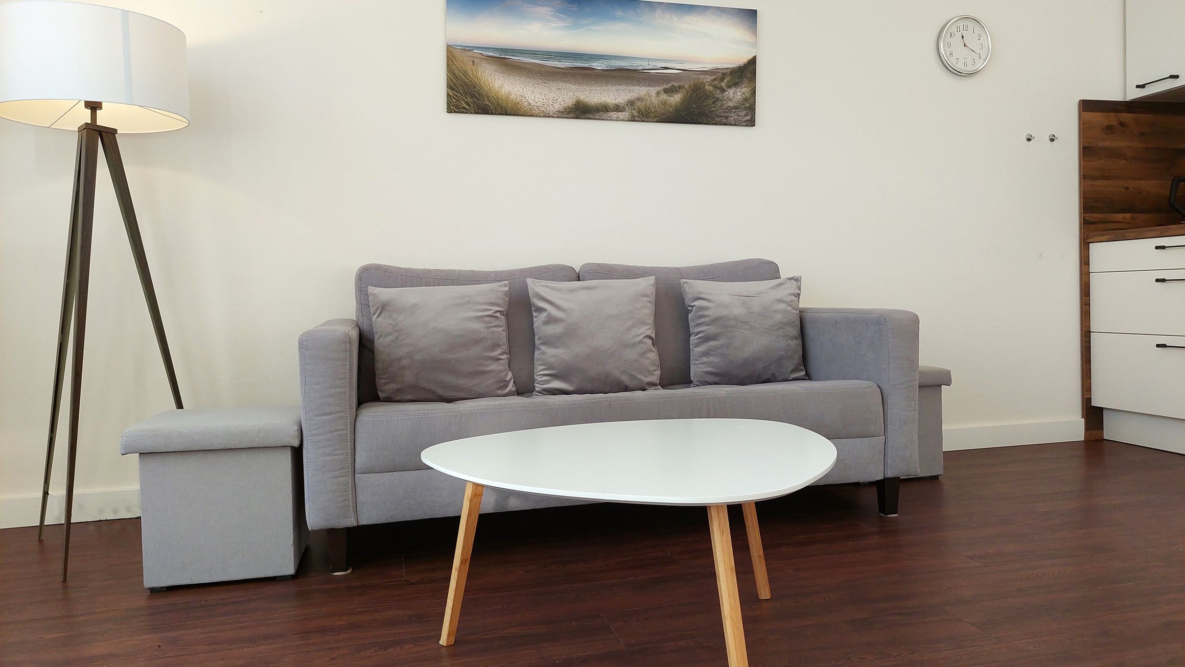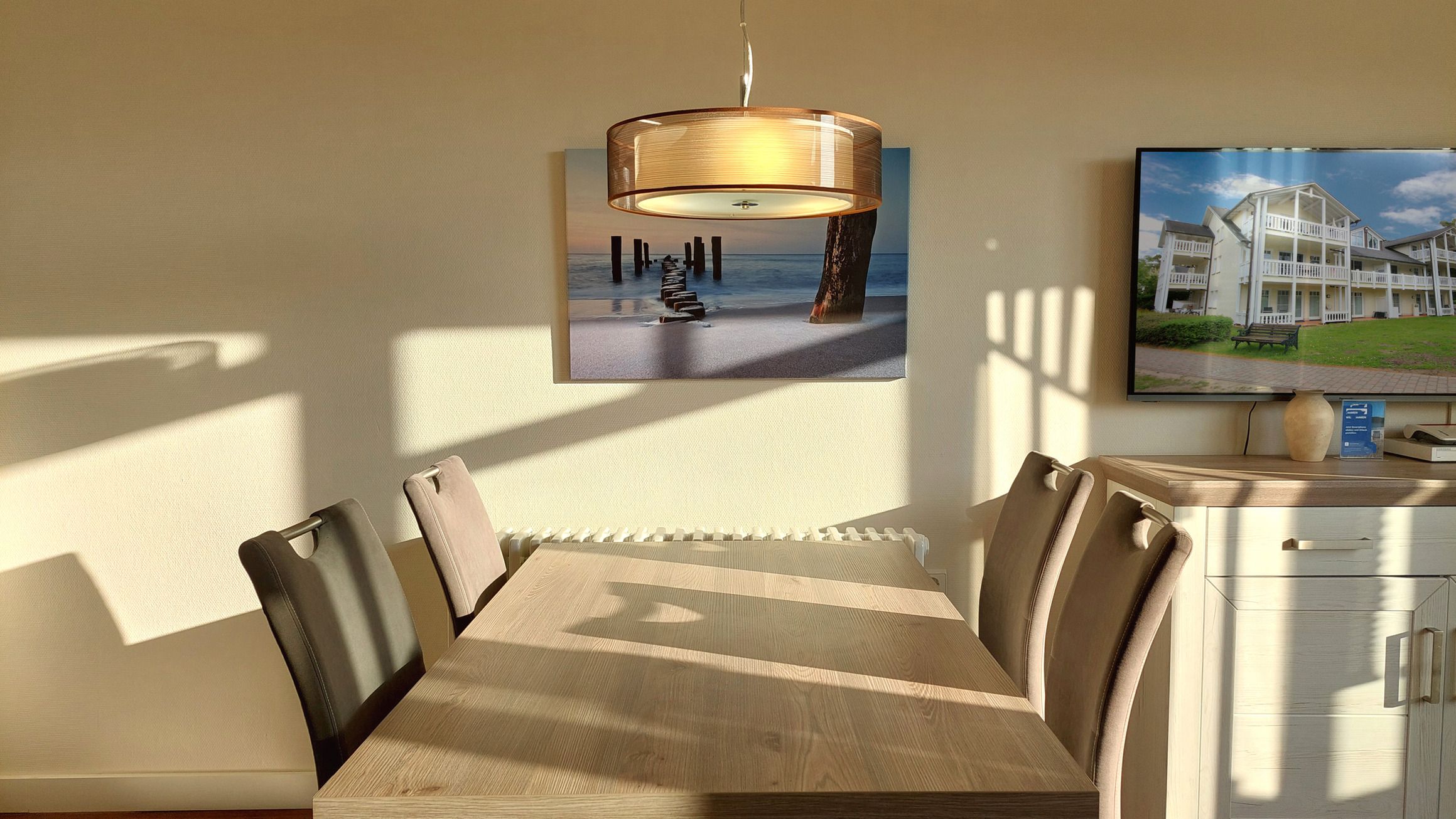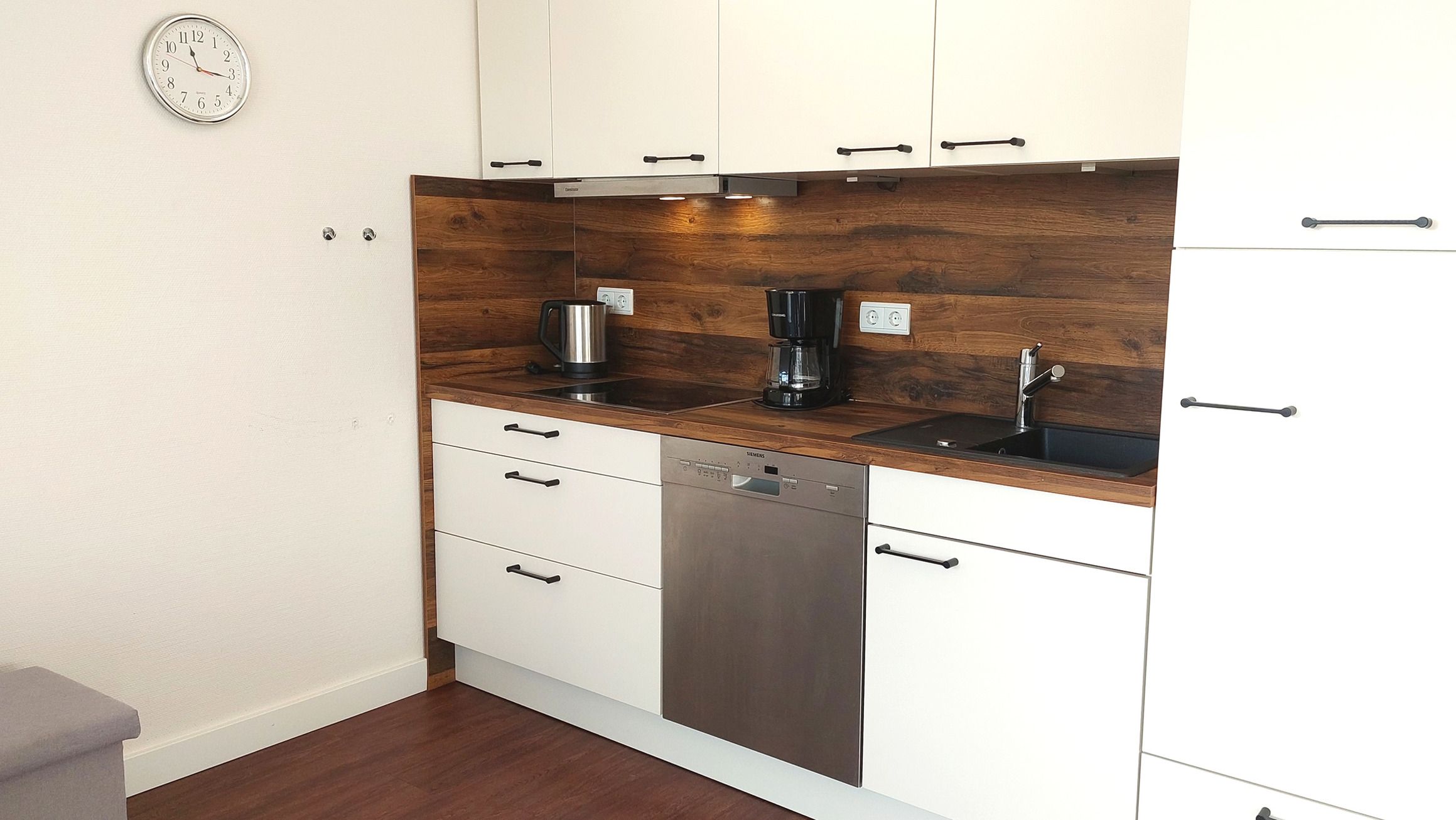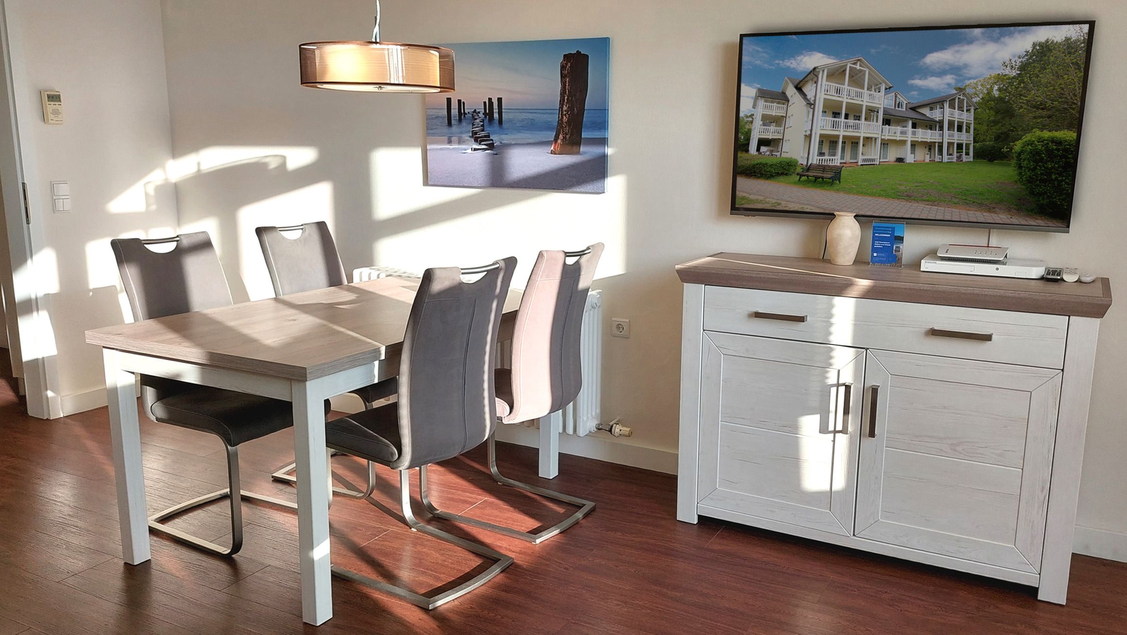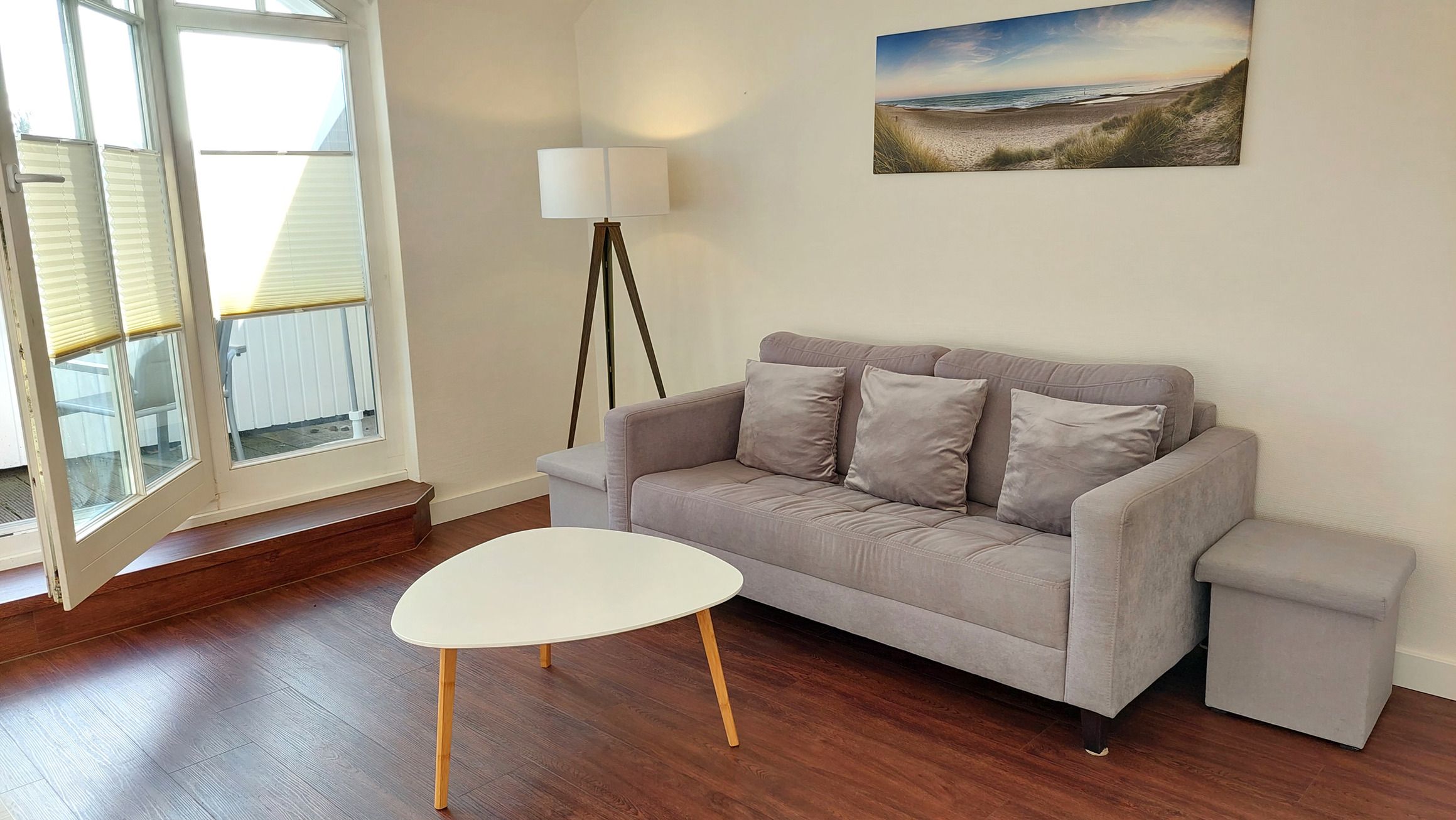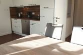 Der Wohn- und Essbereich beherbergt eine moderne Küchenzeile mit Ceran-Kochfeldern, einem Geschirrspüler, einem Kühlschrank mit Gefrierfach, einer Mikrowelle und verschiedenen Küchenutensilien. Der Essbereich bietet sogar Platz für 4 Personen und eine gemütliche Sitzlandschaft lädt zum Verweilen ein. Zur technischen Ausstattung gehören kostenfreies WLAN, ein Smart-TV samt Blu-ray-Player und eine kleine Musikanlage.