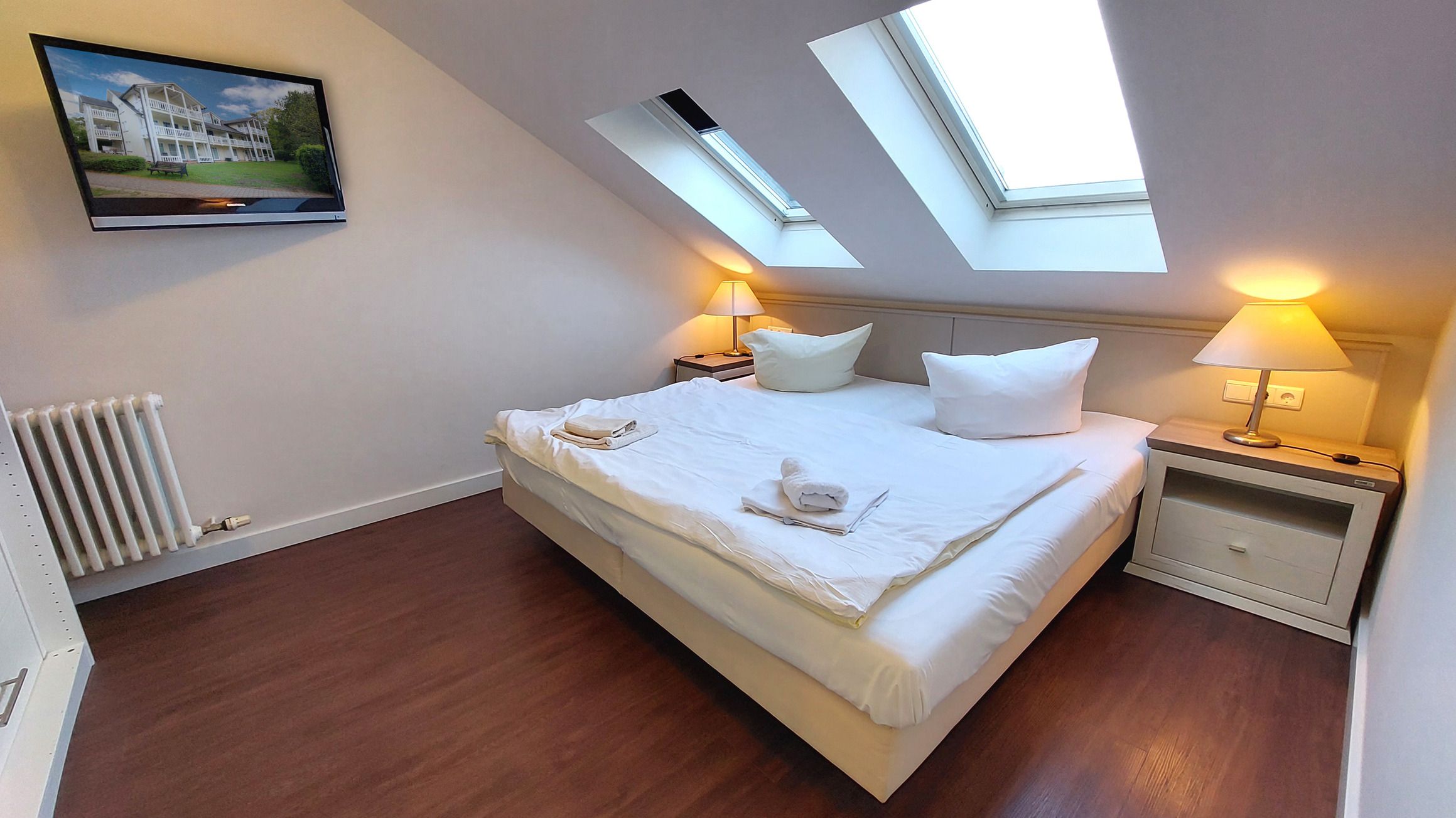 Von dort aus gelangen Sie auch ins Schlafzimmer, welches mit einem Doppelbett und einem zusätzlichen TV ausgestattet ist.