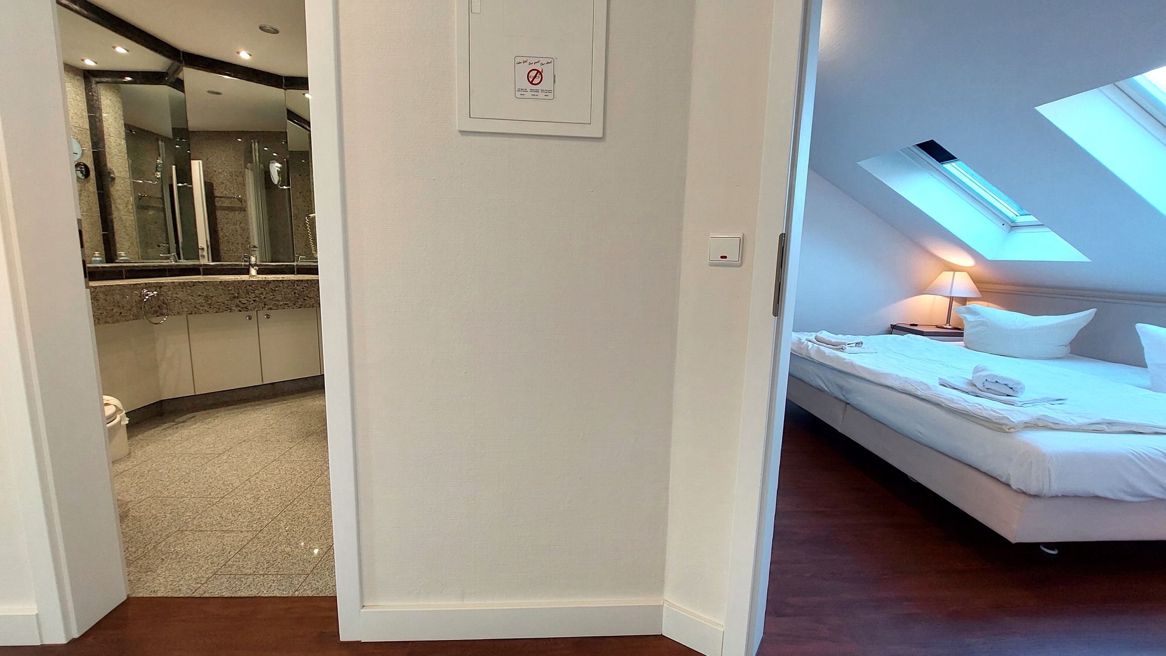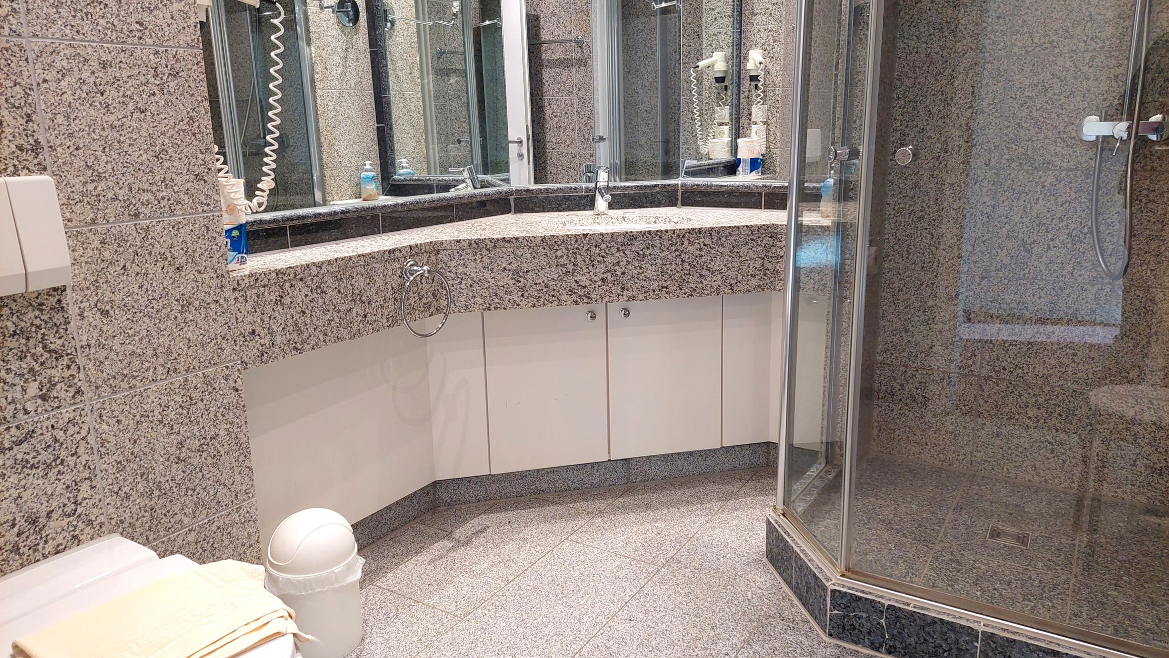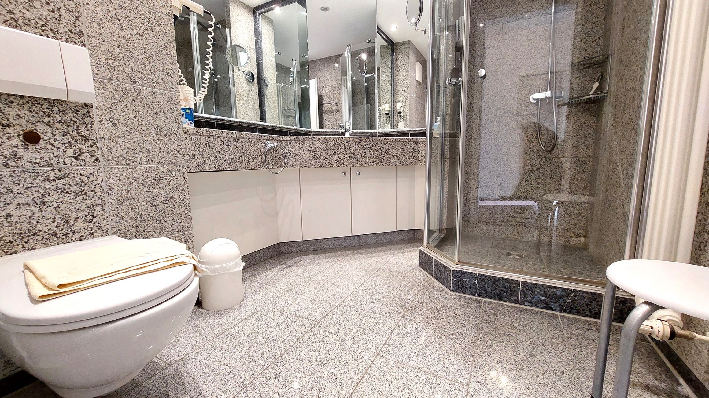 Das Badezimmer ist in Marmoroptik gehalten und verfügt über eine Toilette, einen Waschtisch, eine Dusche, einen Kosmetikspiegel, Fön und Zugang zum Ankleidezimmer mit viel Stauraum.
