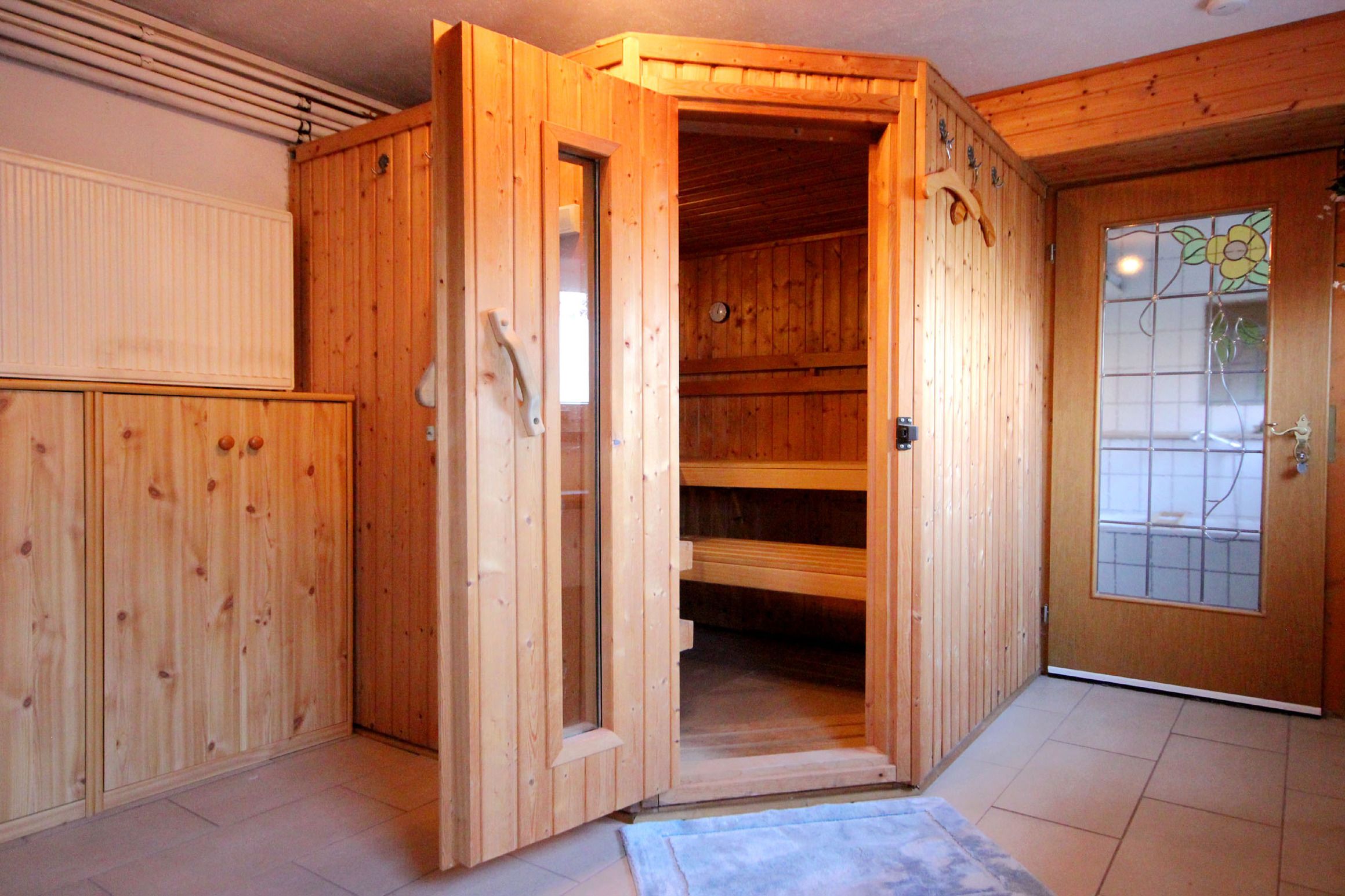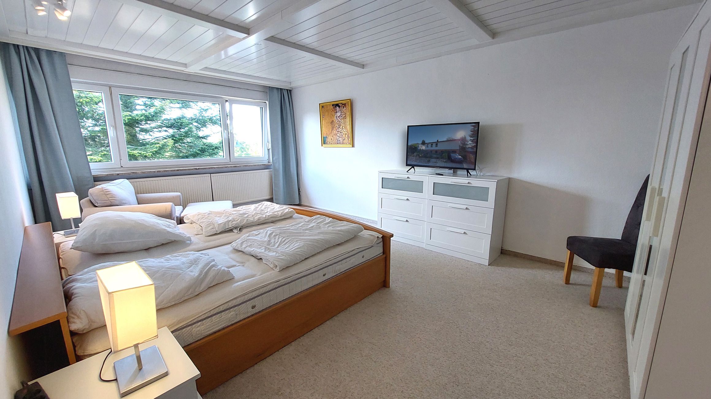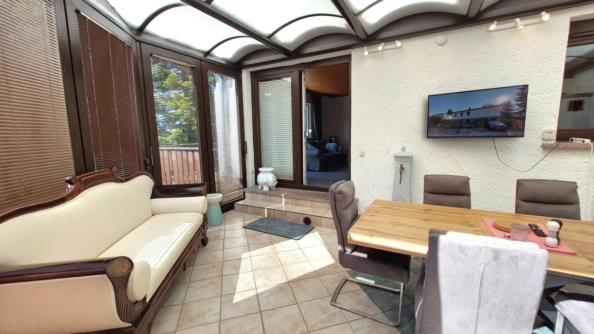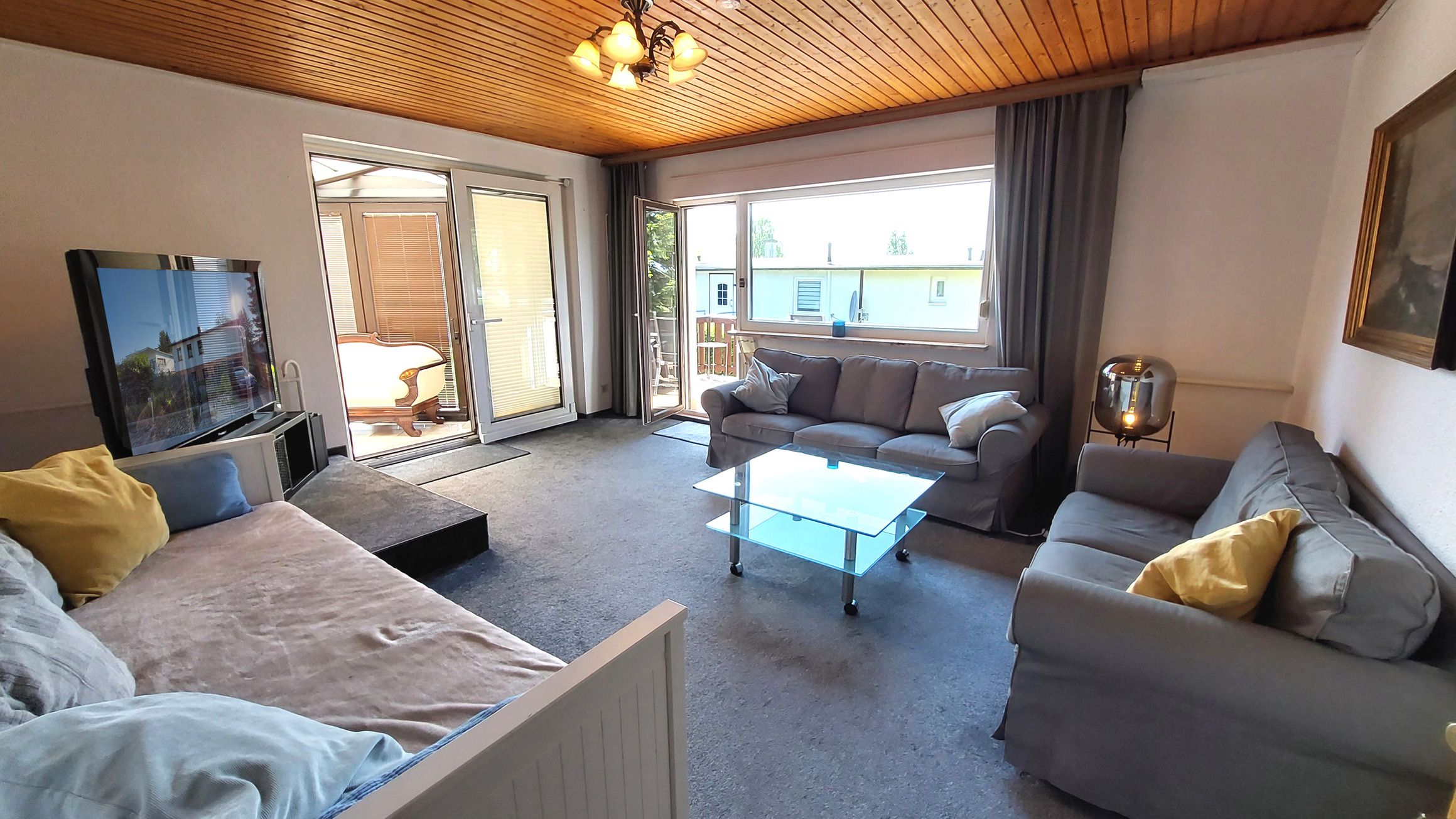 Diese gemütliche und großzügige 3-Raumwohnung 90808 David erwartet Sie mit ca. 125 qm und bietet viel Platz für bis zu 6 Personen. Es erwartet Sie nicht nur ein Wintergarten mit Kamin für behagliche Stunden, sondern auch eine hauseigene Sauna sowie ein eingezäuntes Grundstück für eine private Atmosphäre während des Aufenthaltes. Die Wohnung liegt im Erdgeschoß und teilt sich auf in einen Flur mit Garderobe, von dem Sie alle Räume gut erreichen, ein Wohnzimmer mit angrenzendem Wintergarten, Balkon sowie Terrasse, eine separate Küche, Tageslichtbad sowie zwei Schlafzimmer. Im behaglichen Wohnraum erwartet Sie eine Sitzecke, ein Kojenbett als Schlafmöglichkeit für eine 5. und 6. Person sowie großem Flachbild-TV und WLAN. Die separate Küche verfügt über ein Cerankochfeld mit Backofen, Geschirrspüler, einen Kühlschrank, ein Gefrierfach, Kaffeemaschine, Mikrowelle und Wasserkocher. Im Badezimmer finden Sie eine Dusche, Doppelwaschtisch, eine Waschmaschine sowie WC. Beide Schlafzimmer sind mit einem Doppelbett, Kleiderschrank und zusätzlichem TV ausgestattet und verfügen zudem über Jalousien für eine angenehme Nachtruhe. Im, an zweite Schlafzimmer angrenzenden, Wintergarten können Sie nicht nur gemeinsam speisen, auch gemütliche Stunden durch den Kamin erleben. Ein PKW-Stellplatz steht Ihnen direkt am Haus zur Verfügung.