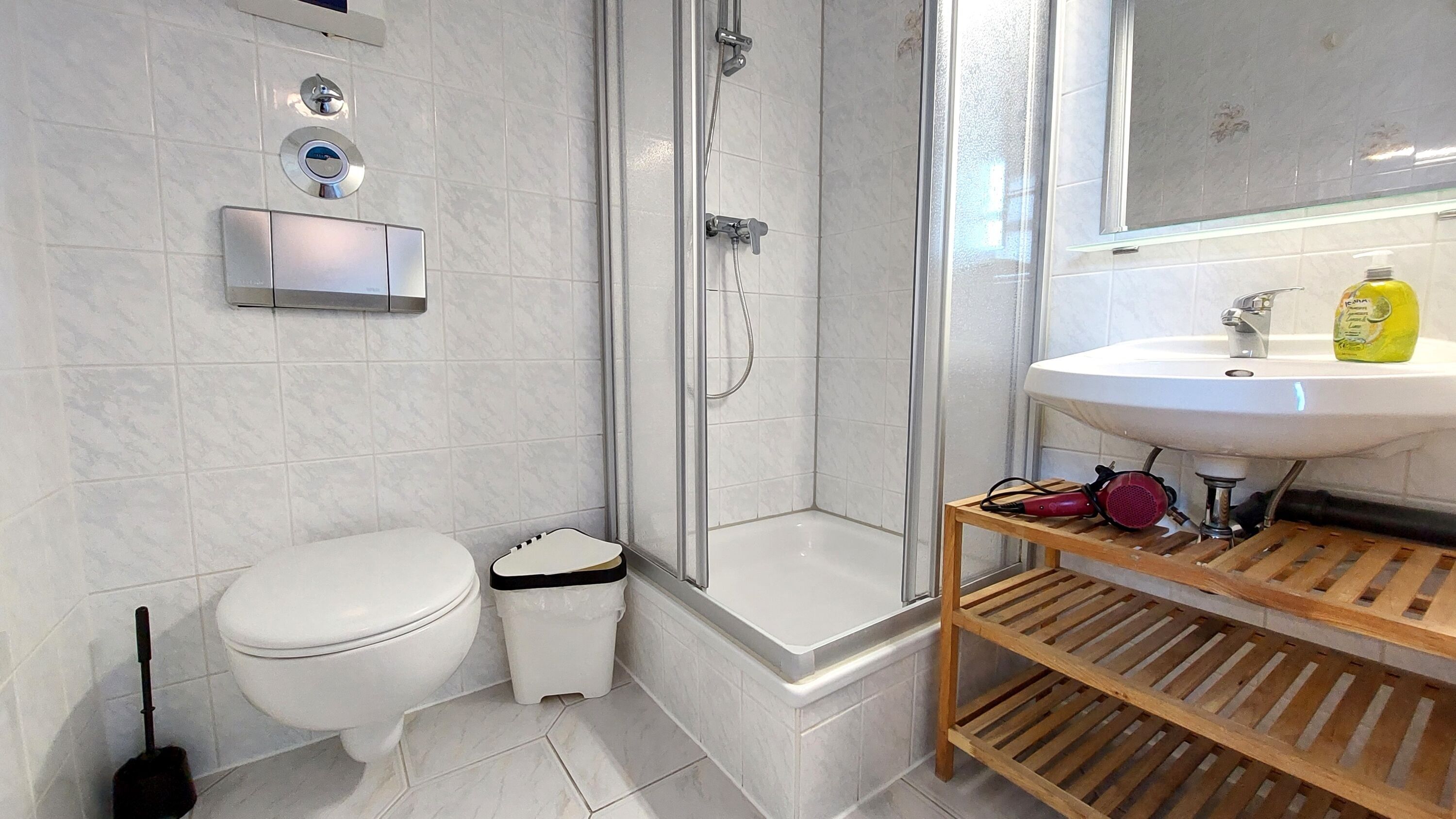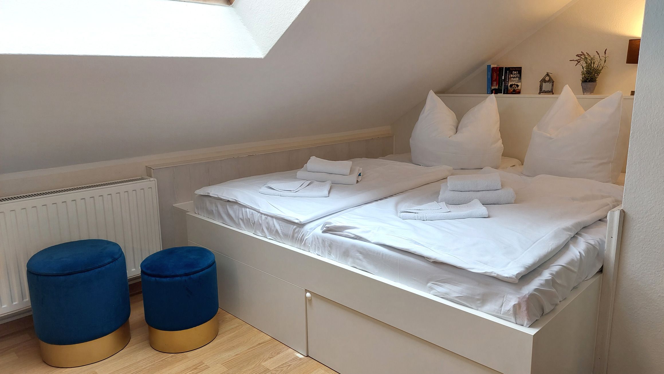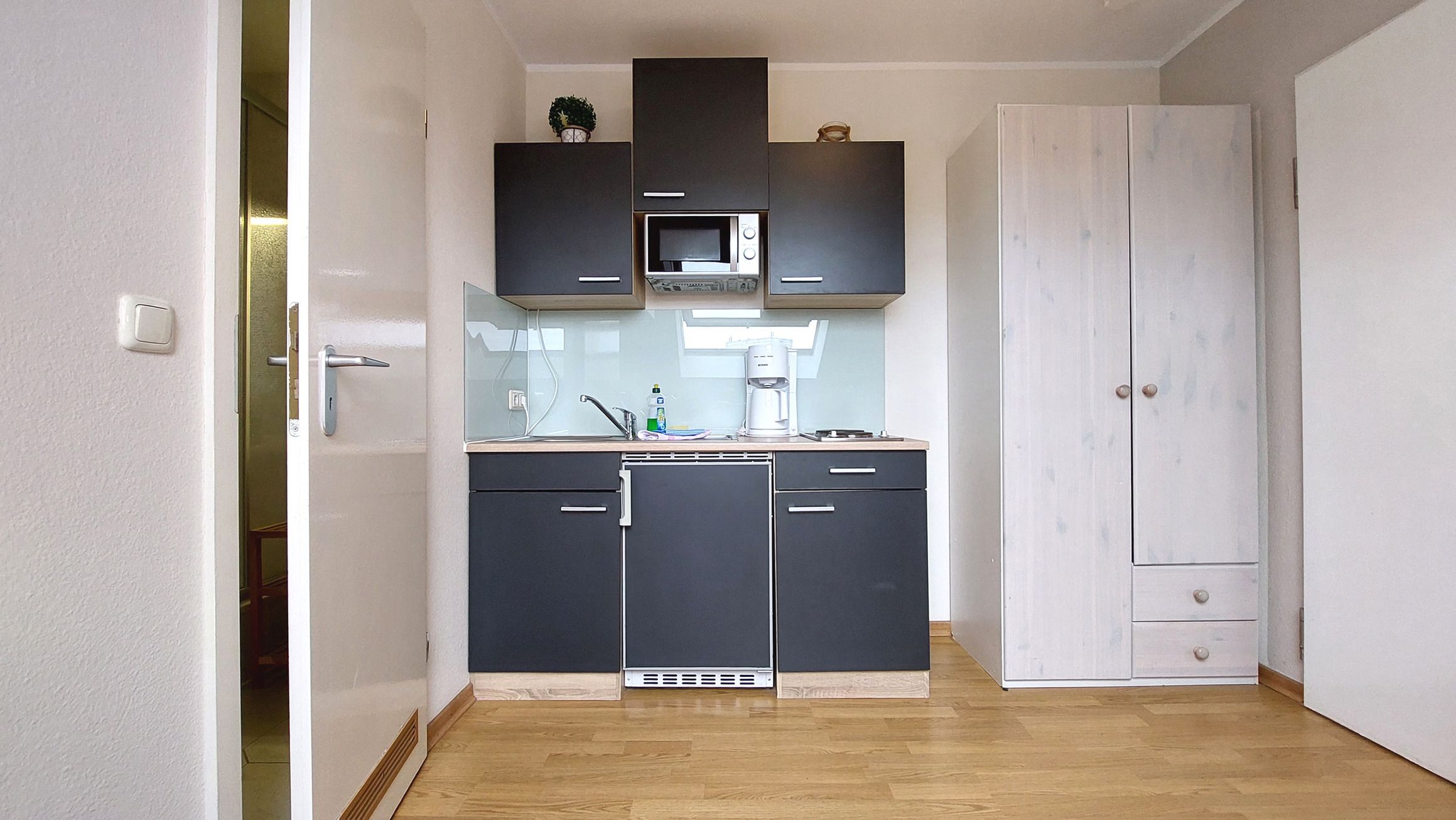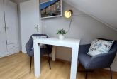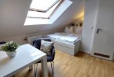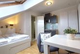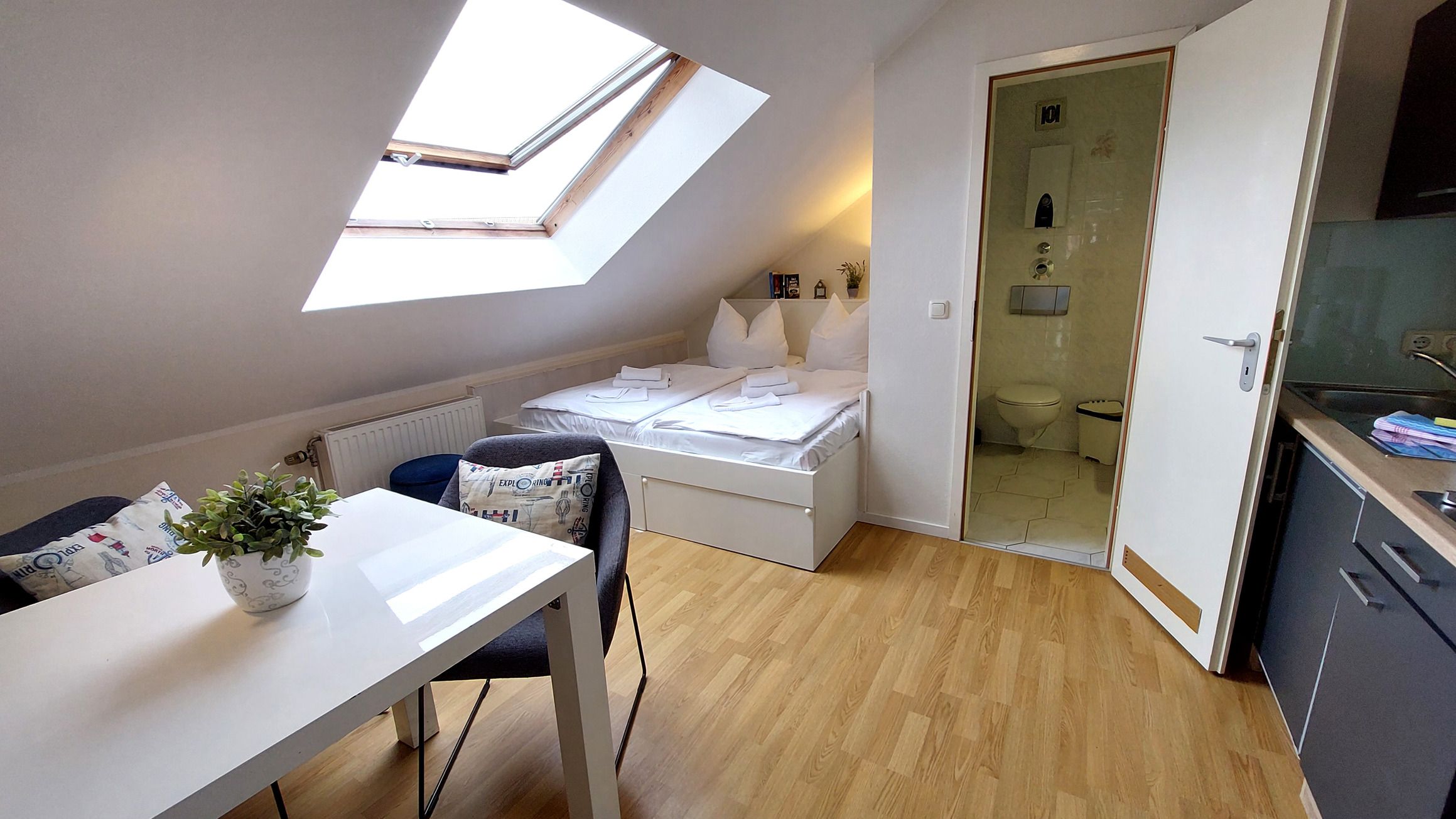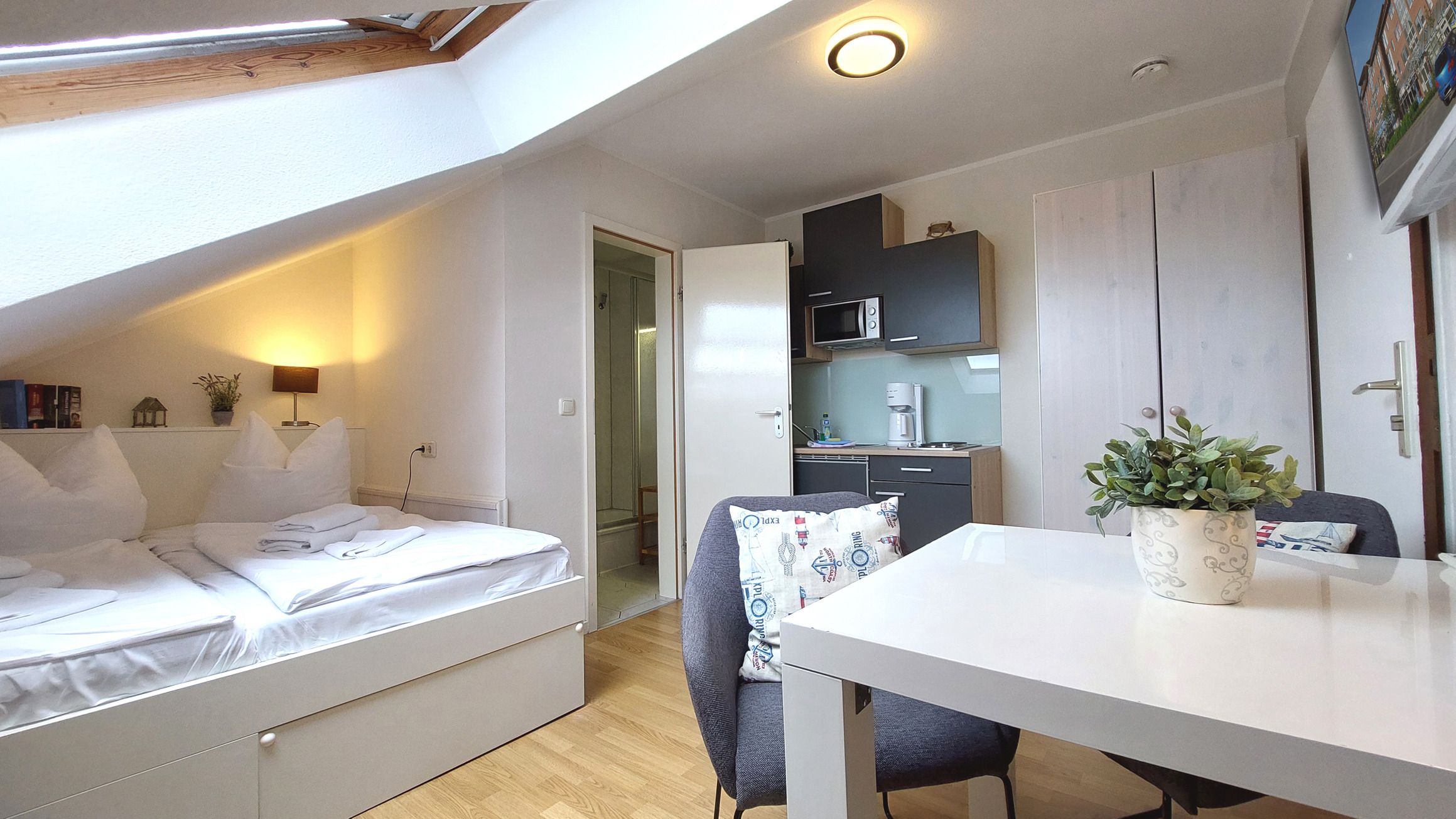 Das schicke Microappartement 90604 im 4. Obergeschoss wurde im Frühjahr 2019 komplett neu renoviert. Entstanden ist ein kleines gemütliches Wohnnest über den Dächern von Binz. Die Dachschrägen sind charakteristisch für das nur ca. 10 qm große Studio. Dennoch finden Sie alles vor, was man für einen gemütlichen Aufenthalt braucht. Das Studio verfügt maßgeschneidertes Doppelbett samt Stauraum, einen kleinen Ess- und Arbeitstisch mit zwei gemütlichen Stühlen und Fusshockern, sowie eine Miniküche mit Spüle, Kühlschrank mit Gefrierfach. 2-Plattenherd und Mikrowelle. Ein Kleiderschrank mit Safe und ein Flatscreen-TV runden das Angebot ab. Freies WLAN ist ebenfalls vorhanden. Das separate Duschbad mit Waschtisch und WC komplettiert das Studio.