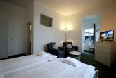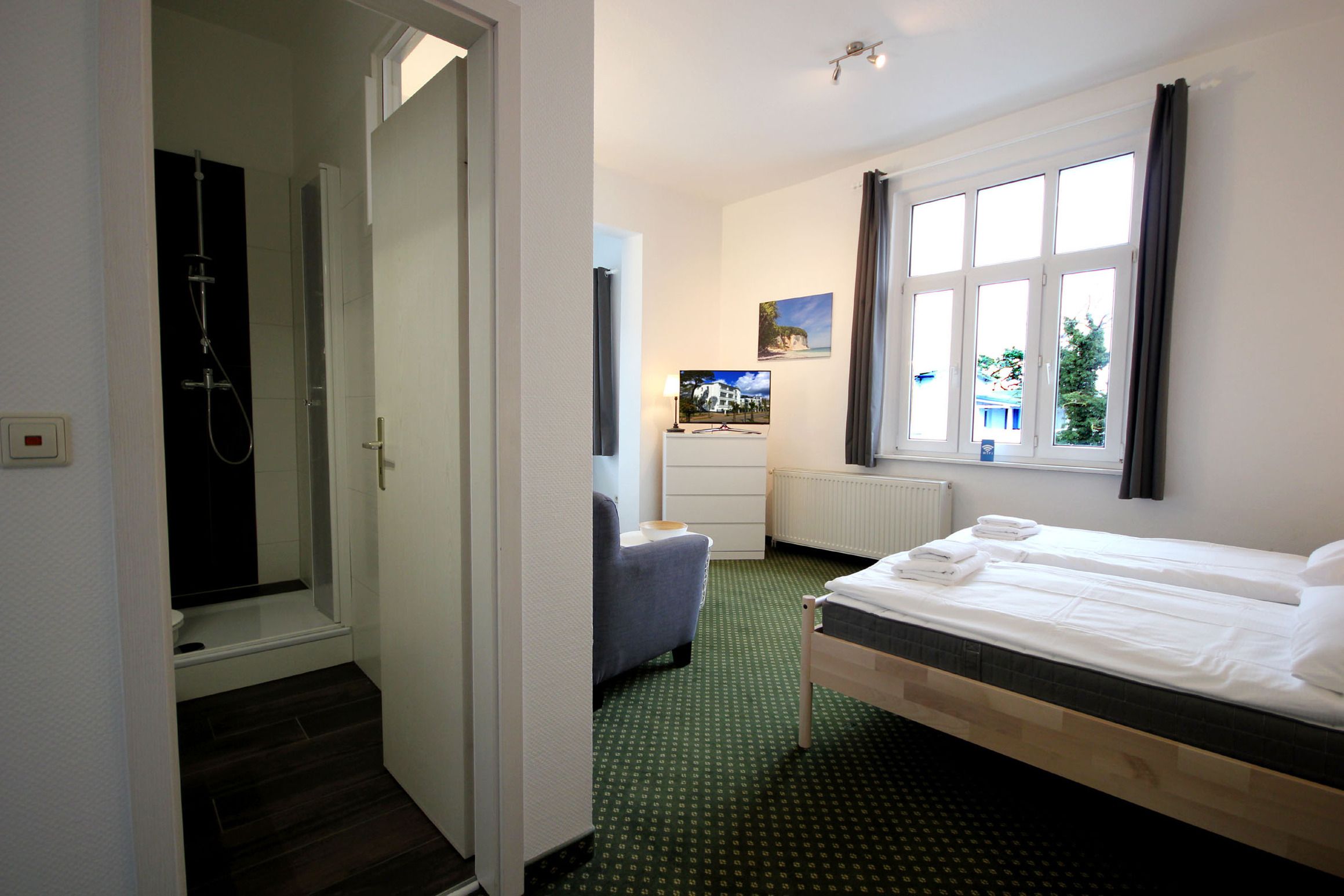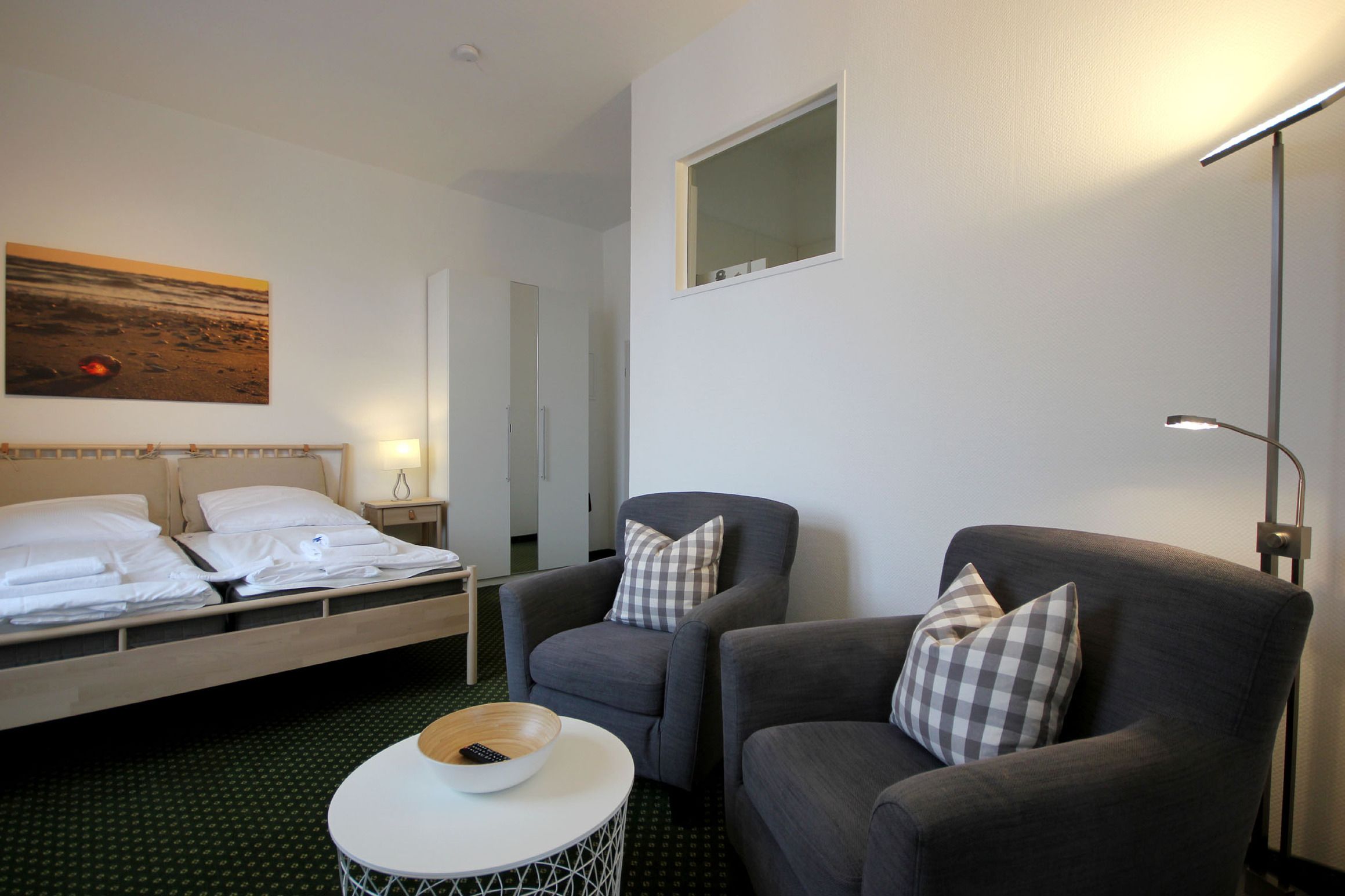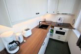Diese freundliche Wohnung ist aufgeteilt in einen kombiniertem Wohn- und Schlafbereich, einer separaten Küche sowie ein modernes Duschbad mit Waschtisch und WC. Der Schlaf- und Wohnraum begrüßt Sie mit einem Flachbild-TV, zwei gemütlichen Sesseln, einem Doppelbett (1,60m x 2m) sowie einem Kleiderschrank. Die neuwertige Küchenzeile ist mit Kühlschrank mit kleinem Gefrierfach, Cerankochfeld, Nespresso-Maschine, Backofen, Geschirrspüler, Kaffeemaschine, Wasserkocher und Toaster komplett ausgestattet. Vom Essplatz genießen Sie einen schönen Blick bis zur Strandpromenade. Highlights: Kostenfreies WLAN sowie ein wohnungseigener PKW-Stellplatz direkt am Haus.