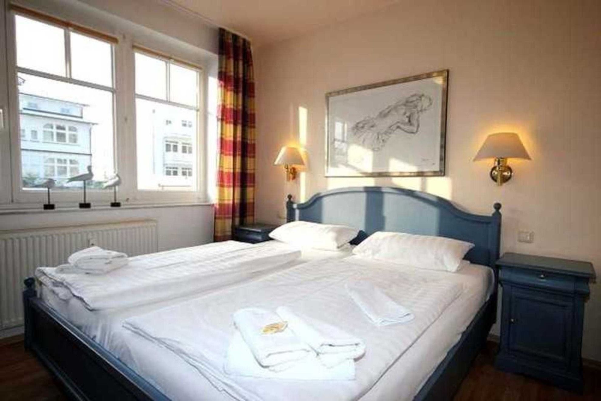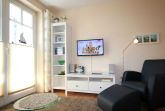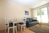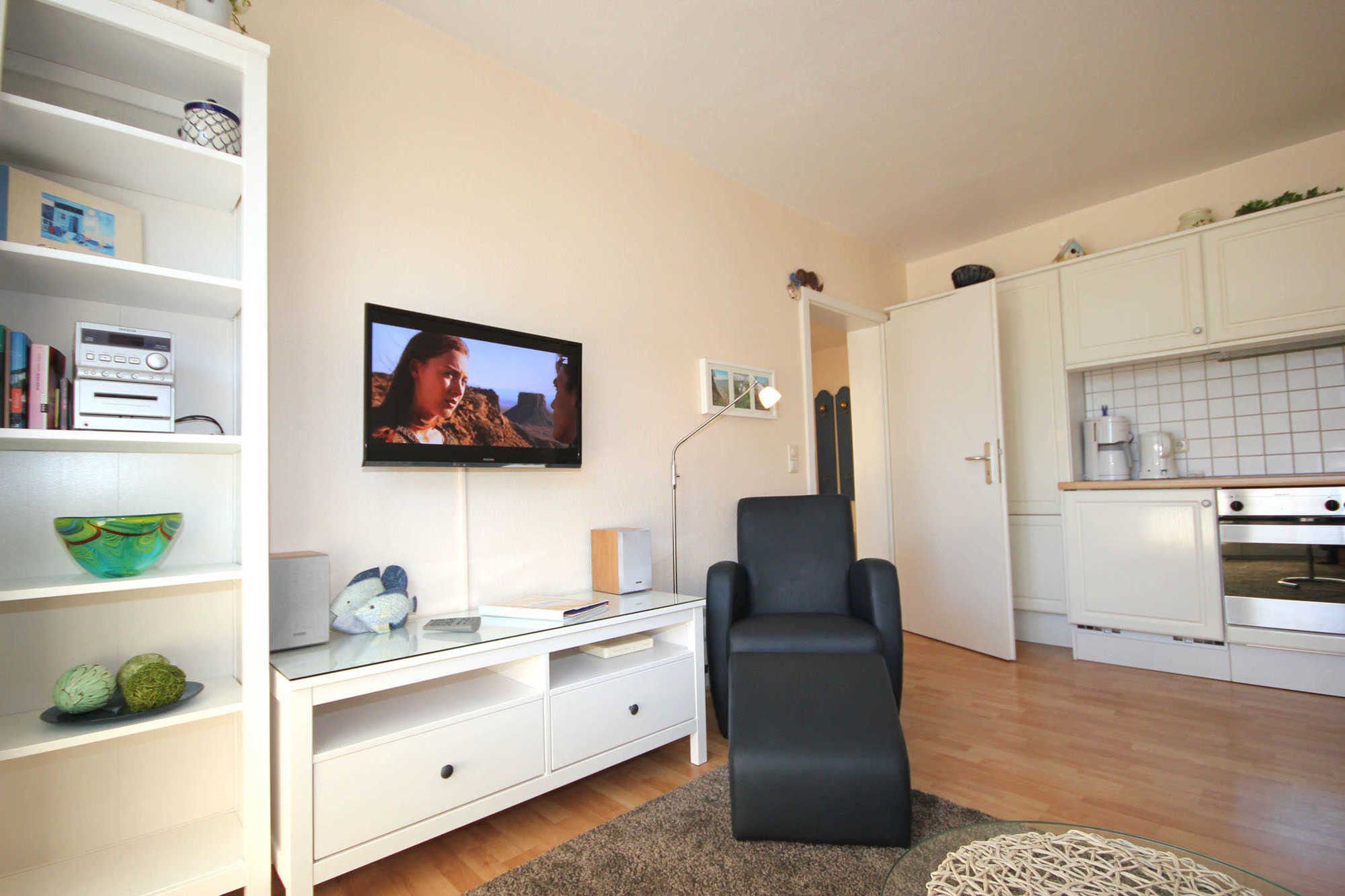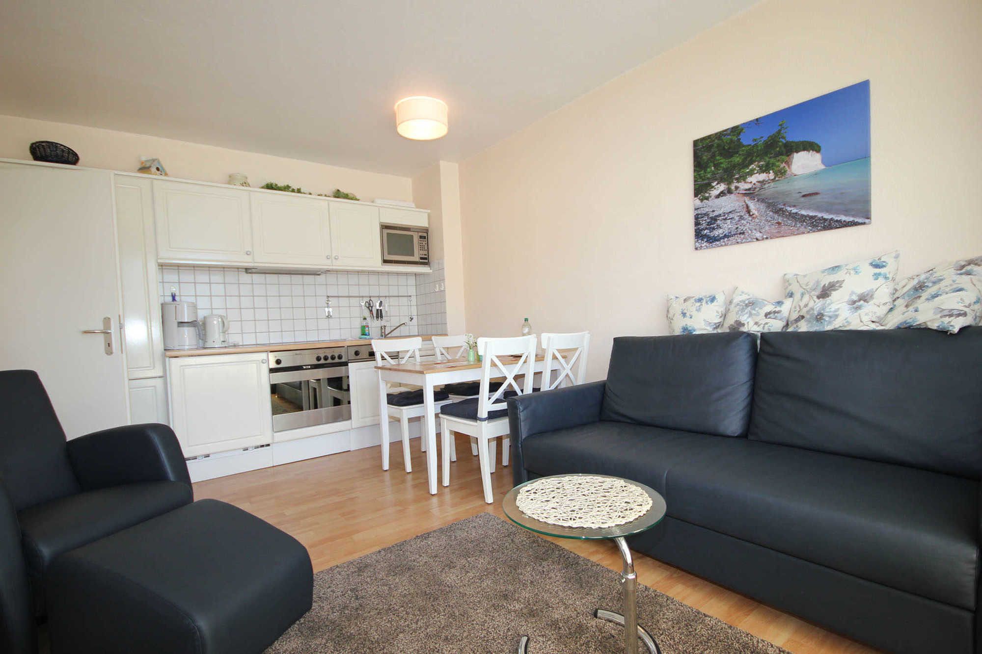 Dem hellen Wohnraum schließt sich die weiße Wohnküche und der Balkon an. Im separaten Schlafraum finden Sie ein Doppelbett und einen Kleiderschrank. Vom vorgelagerten Flur aus erreichen Sie das geräumige Duschbad mit Kosmetikspiegel und Fön. Im Wohnraum gibt es einen Essbereich und eine gemütliche Sitzecke mit Schlaffunktion sowie ein Flachbildfernseher und eine Musikanlage mit CD-Player. Die Küche verfügt über einen Backofen, eine Mikrowelle, Kühlschrank, Geschirrspüler, Kaffeemaschine, Toaster und Wasserkocher.