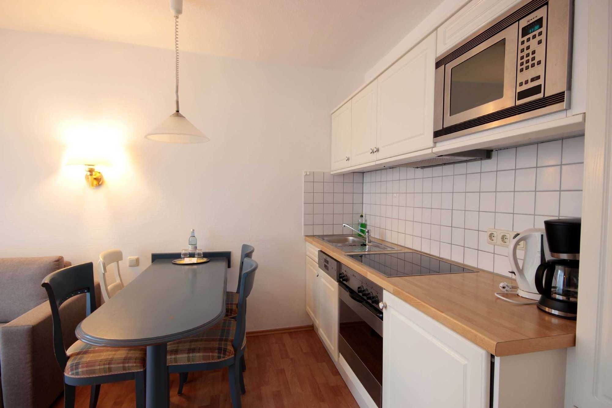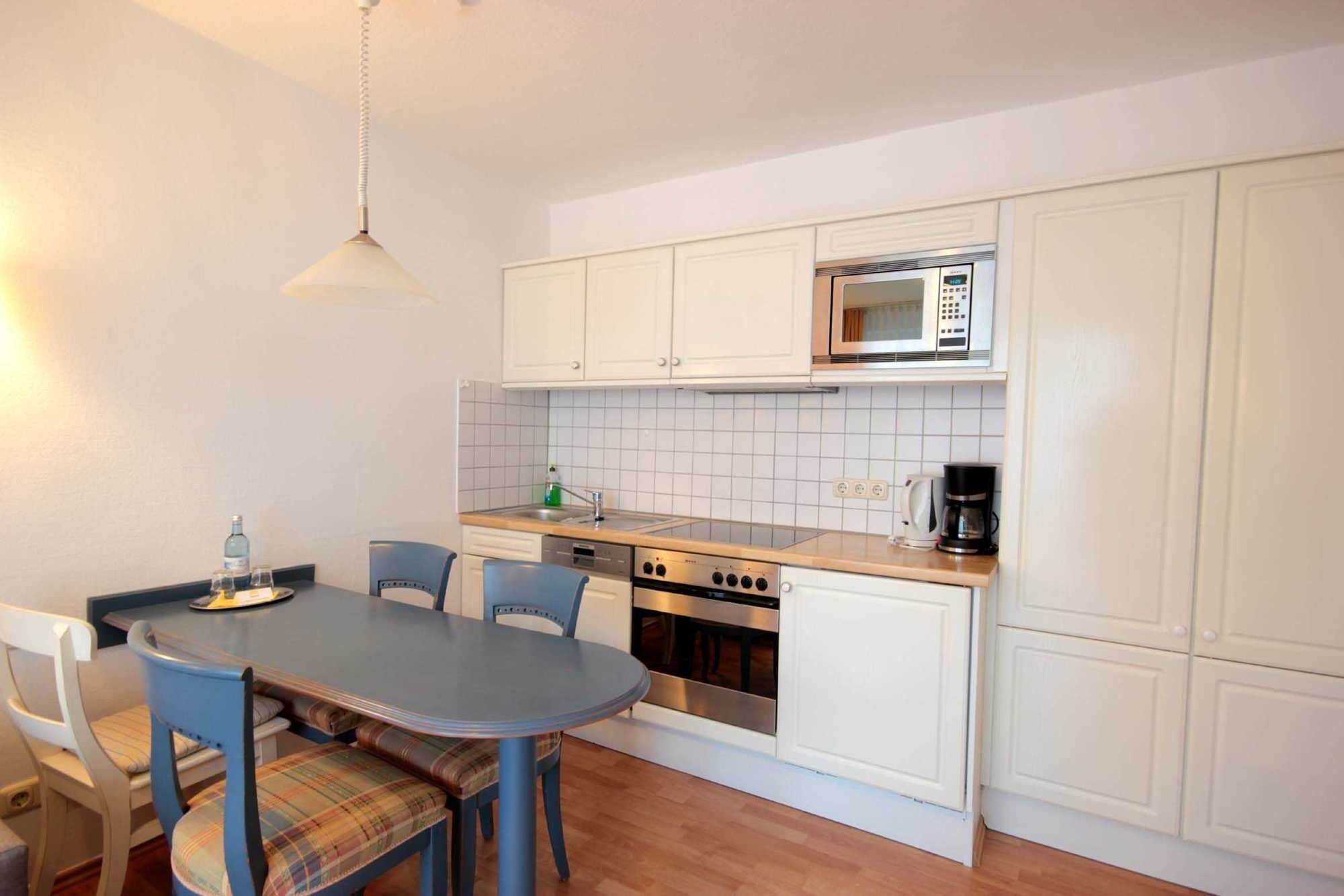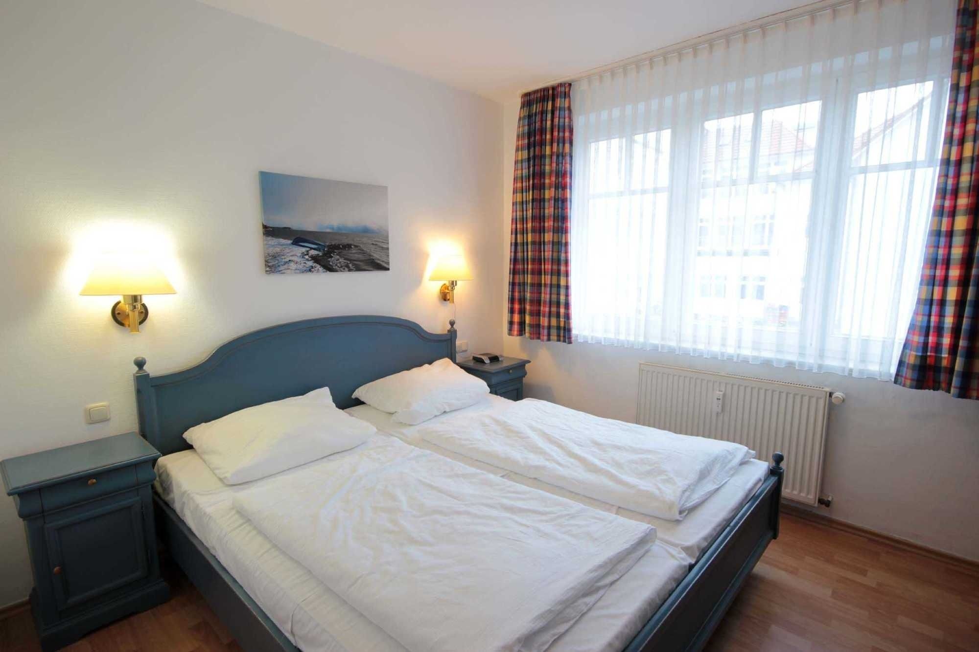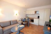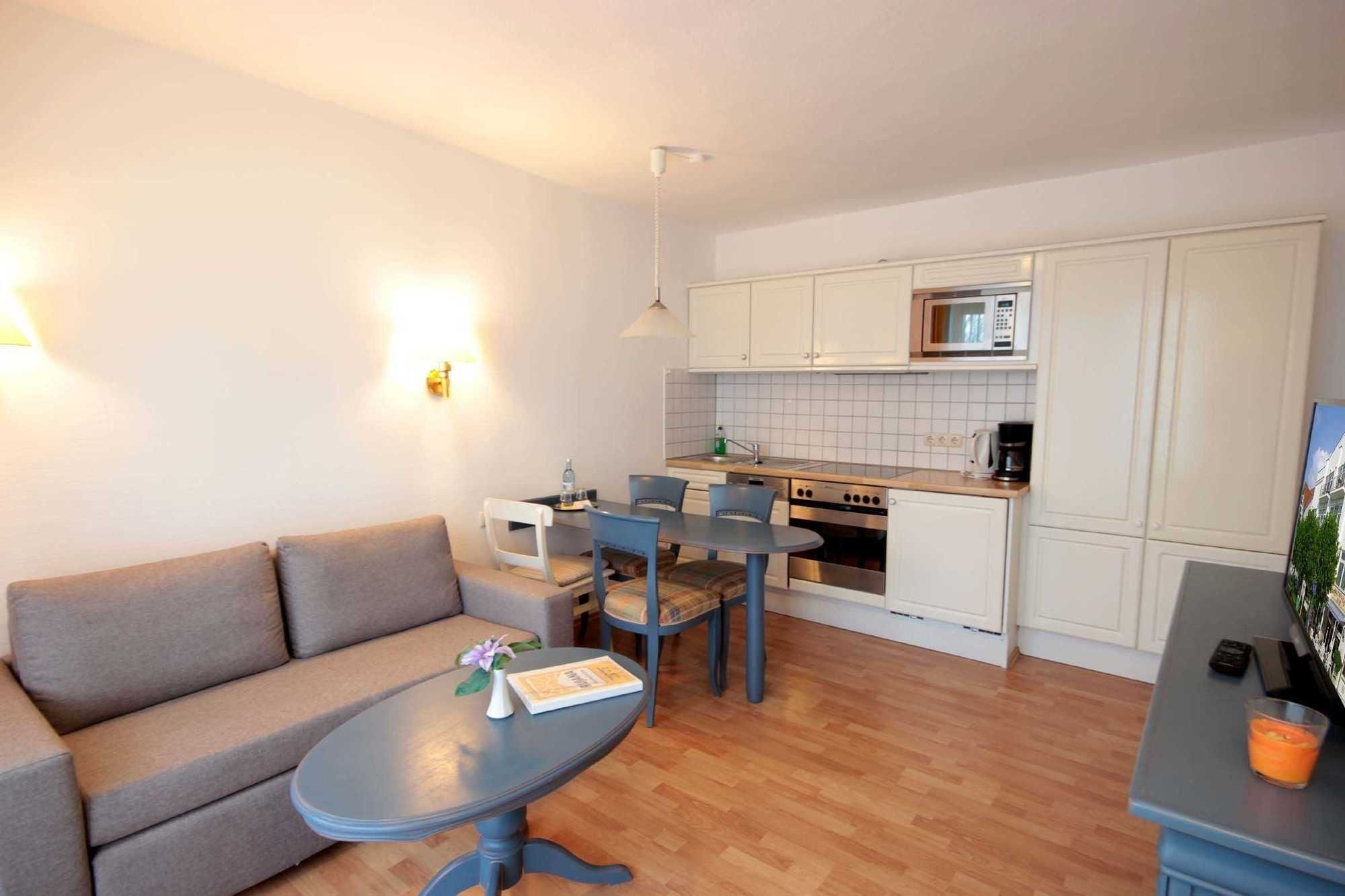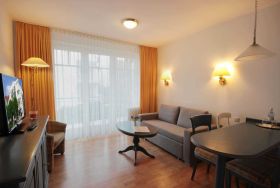 Dem hellen Wohnraum schließt sich die weiße Wohnküche und der Balkon an. Im separaten Schlafraum finden Sie ein Doppelbett und einen Kleiderschrank. Vom vorgelagerten Flur aus erreichen Sie das geräumige Duschbad. Im Wohnraum gibt es einen Essbereich und eine gemütliche Sitzecke mit Schlaffunktion sowie einen Fernseher, eine Stereo-Anlage sowie einen kostenfreien W-Lan-Zugang. Die Küche verfügt über einen Backofen, eine Mikrowelle, Kühlschrank, Geschirrspüler, Kaffeemaschine, Toaster und Wasserkocher. Ein PKW-Stellplatz steht Ihnen auf dem Parkplatz Zentrum (ca. 10 Gehminuten) zur Verfügung.
