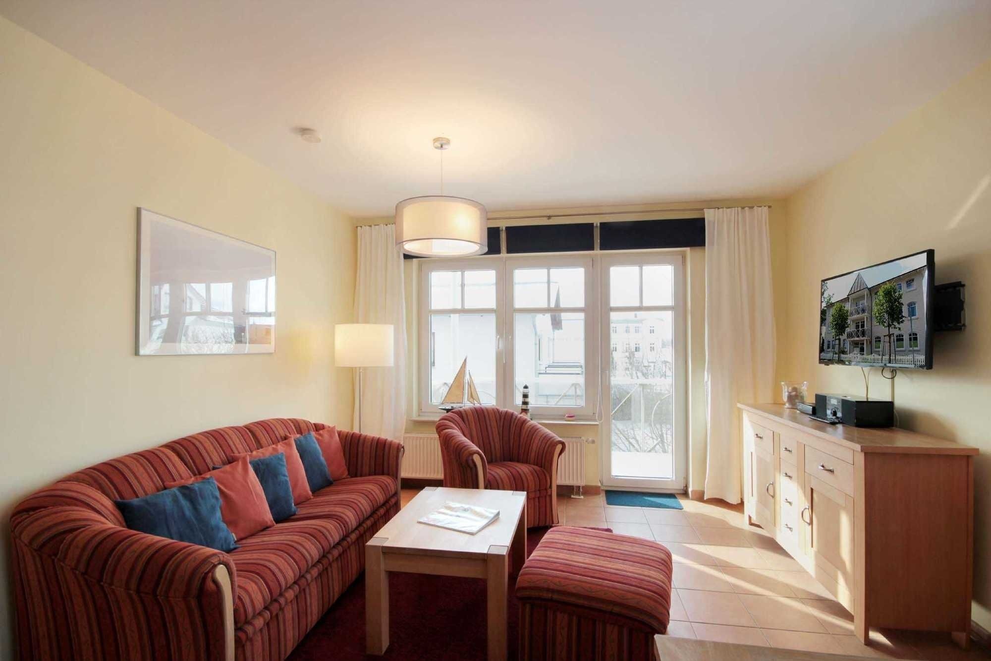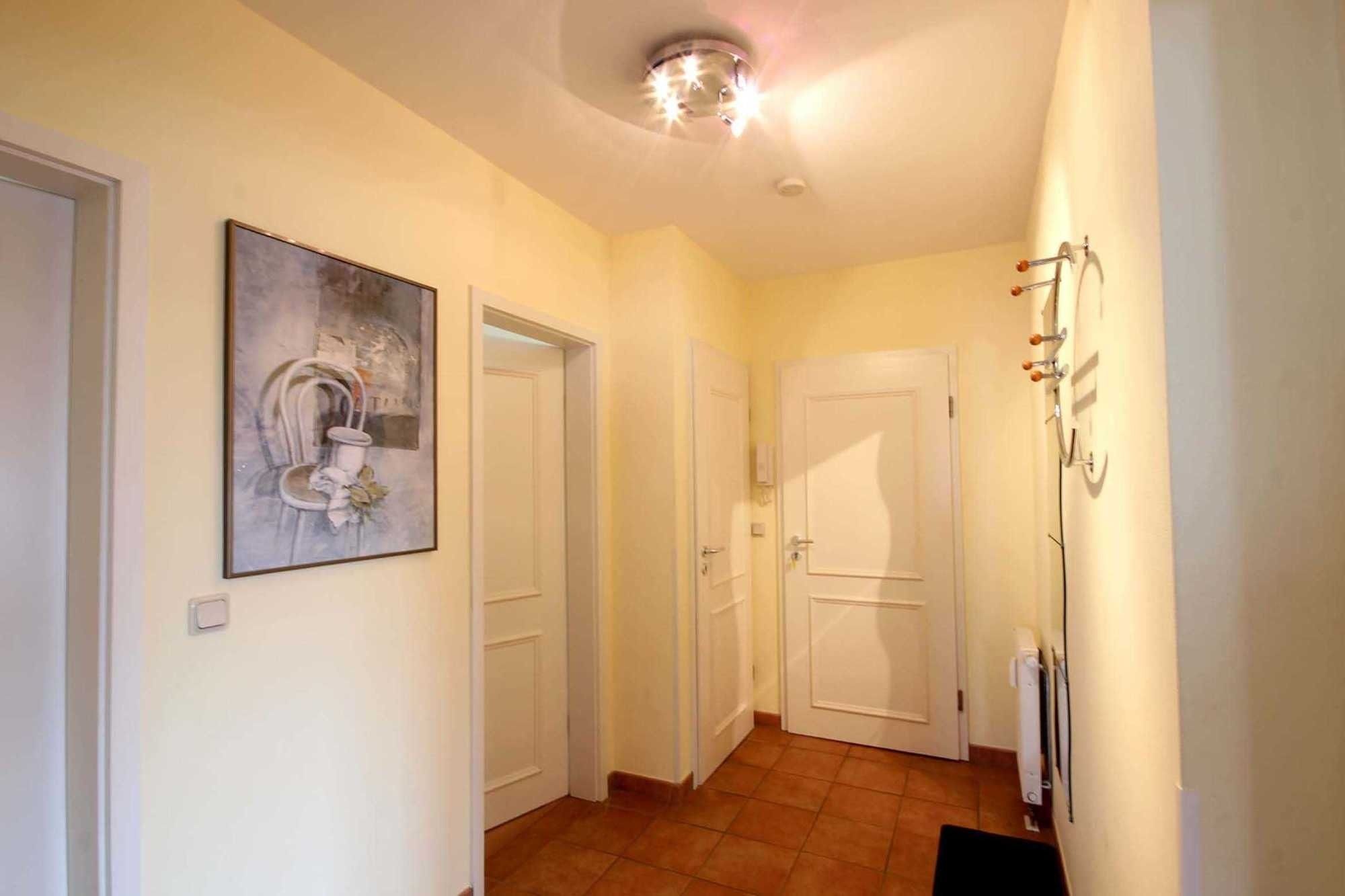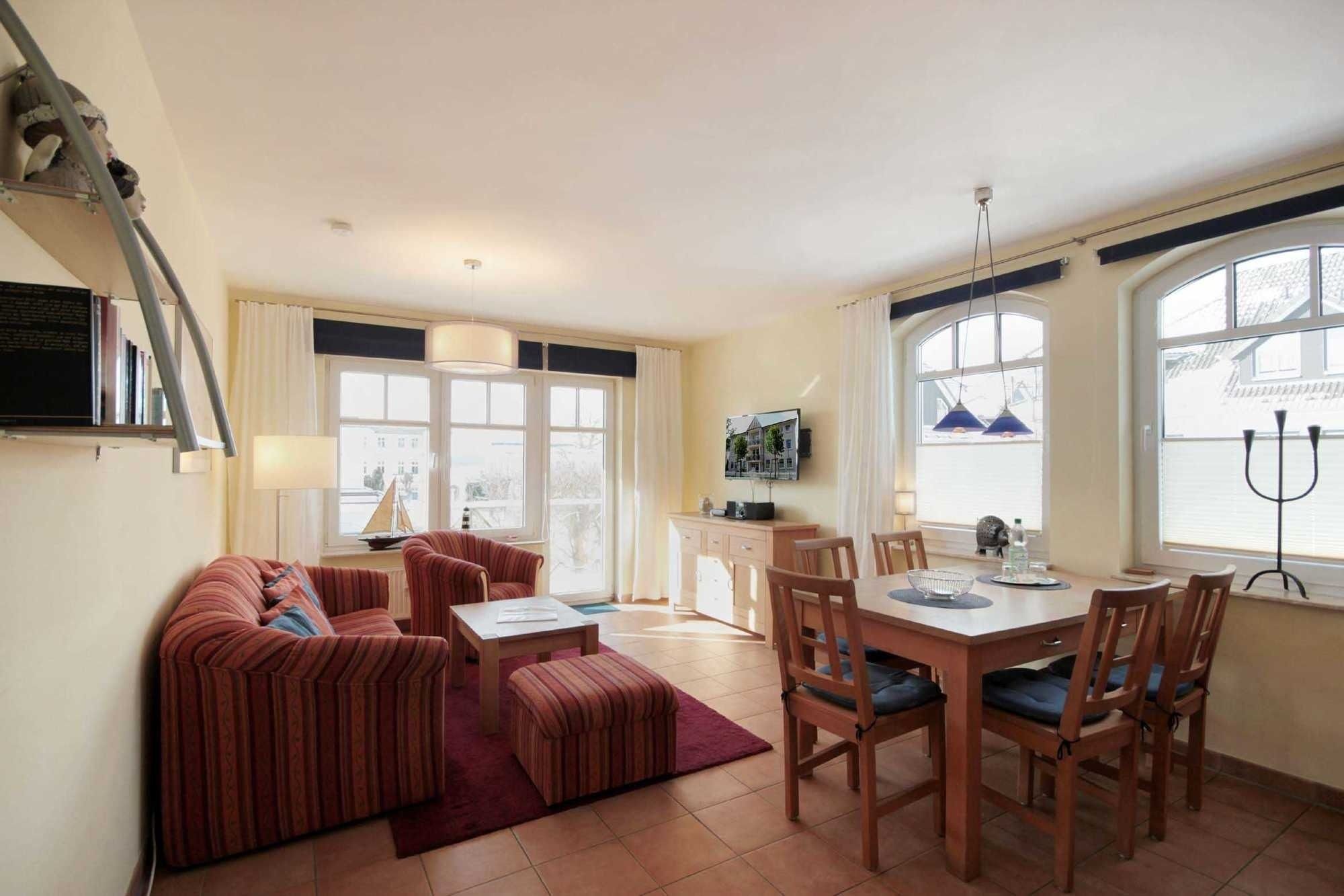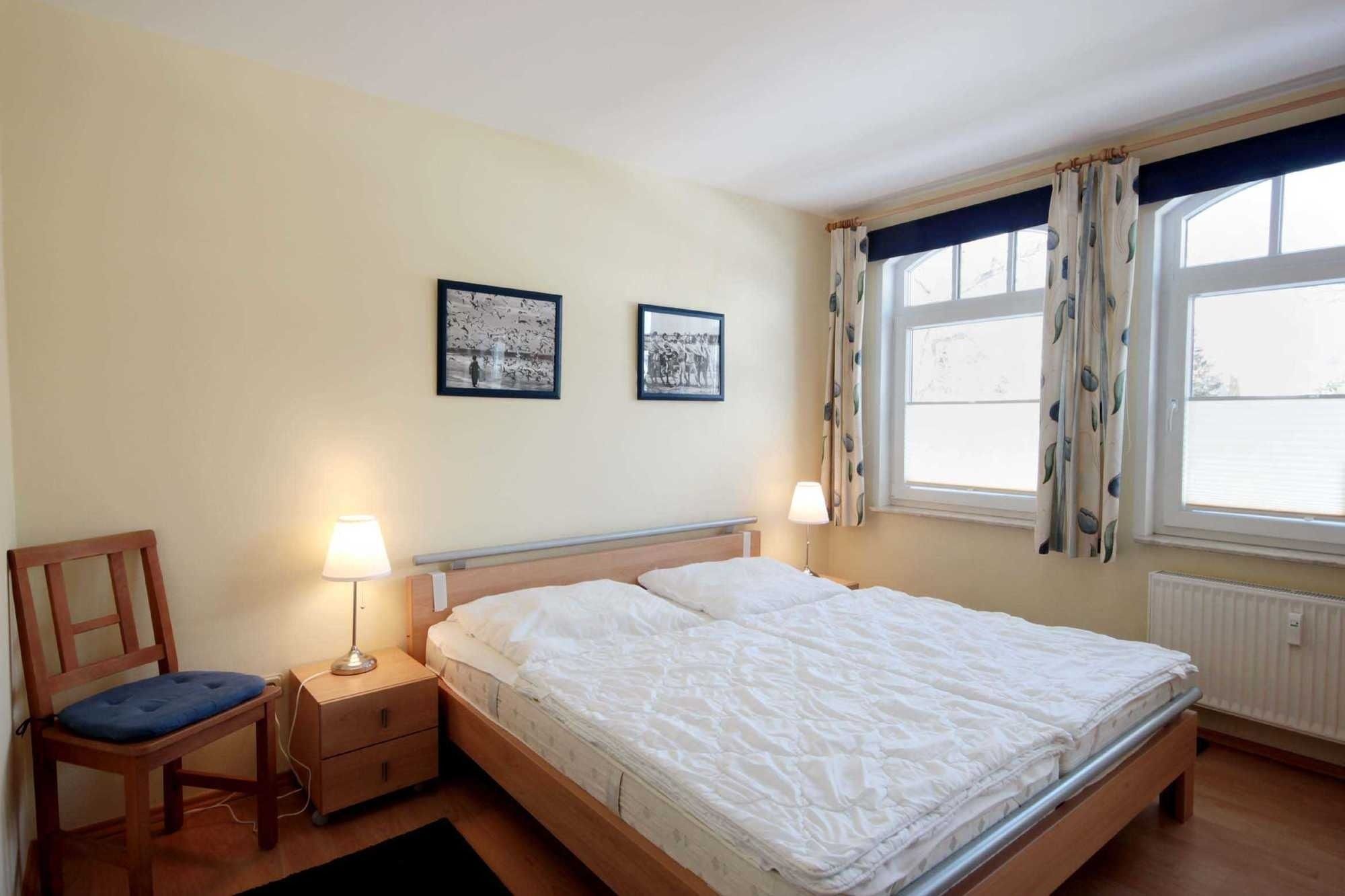 Ihre Ferienwohnung 90578 (Nichtraucher) hat eine Größe von ca. 58 qm und ist für 6 Personen eingerichtet. Sie befindet sich im 1. Obergeschoß, mit Wohnzimmer und sonnigem Balkon auf der Südseite. Der Wohnbereich teilt sich auf in Sitzgruppe mit TV-Gerät und Musikanlage, sowie Küchenzeile mit Geschirrspüler, Mikrowelle, Herd und diversen elektrischen Kleingeräten. Ein Essplatz trennt den Küchen- vom Wohnbereich. Die gemütliche Sitzgruppe kann zur Doppelbettcouch umgebaut werden und dient im Bedarfsfall für 2 Personen als Schlafgelegenheit. Weiterhin verfügt das Appartement über ein großes Schlafzimmer mit Doppelbett und ein 2. Schlafzimmer mit 2 Einzelbetten. Ein Badezimmer mit Waschtisch, Dusche und WC ist ebenfalls vorhanden. Im Keller des Hauses befindet sich eine Sauna sowie ein Abstellraum für Fahrräder oder Kinderwagen. Ab sofort können unsere Gäste einen kostenfreien Internetzugang nutzen. Ihren PKW können Sie im nur 100 m entfernten Parkhaus abstellen. Auf Grund der zentralen innerörtlichen Lage können Sie teilweise den Verkehr hören.