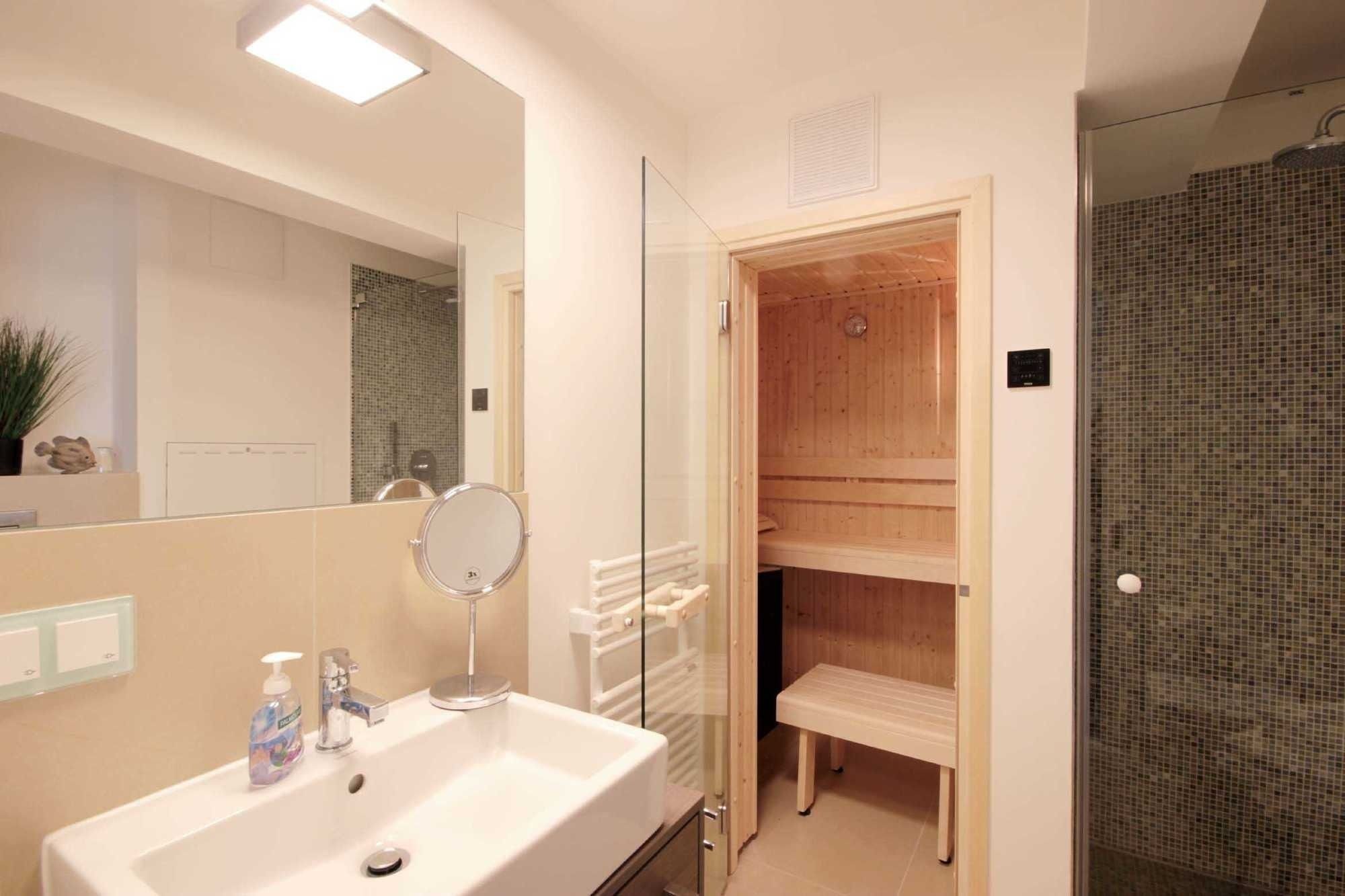 Das erste Badezimmer verfügt über eine Sauna sowie über eine ebenerdige Dusche, Waschtisch, Kosmetikspiegel, Fön und einen Handtuchheiztrockner.