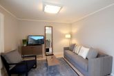Angrenzend ist die schöne Wohnküche mit Theke und Essbereich zu finden. Der stilvoll eingerichtete Wohnbereich ist mit einer gemütlichen Sitzgruppe inkl. einer Schlafcouch für 2 Personen, Radio / Stereoanlage, Flachbild-TV und WLAN ausgestattet.