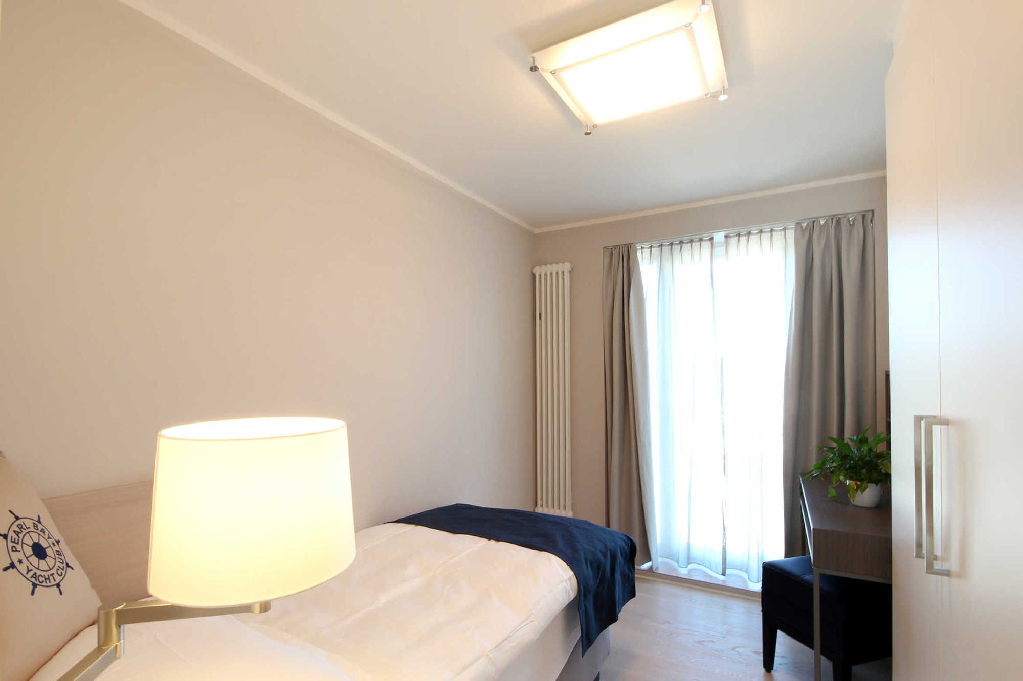Im kleineren Schlafzimmer befindet sich ein Boxspring-Einzelbett (0,9 x 2 m), ein bequemer Sessel, ein Kleiderschrank und ein Schreibtisch.