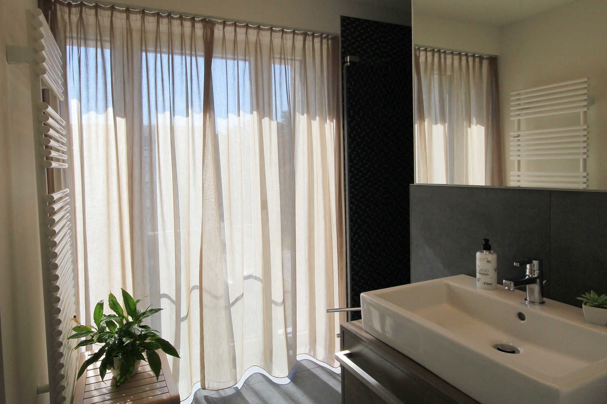 Das Tageslichtbad mit ebenerdiger Regendusche bietet genügend Abstellflächen für Kosmetika, einen Fön und einen Handtuchheiztrockner.