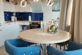 Im offenen Wohn- und Essbereich finden Sie eine moderne Küchenzeile. Dort finden Sie Cerankochfeld, Backofen, Mikrowelle, Geschirrspüler, Kühlschrank (mit Gefrierfach) und viele weitere nützliche Küchenhelfer, welche auch im Urlaub die Möglichkeit der Selbstversorgung bietet. Der Esstisch bietet Sitzgelegenheiten für 4 Personen.