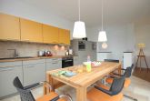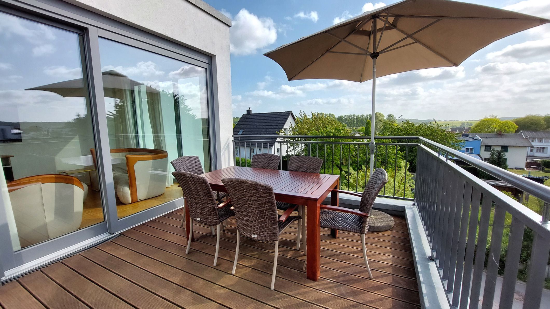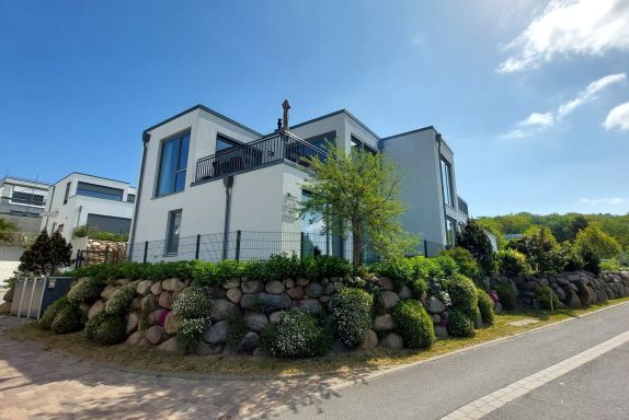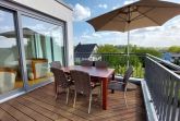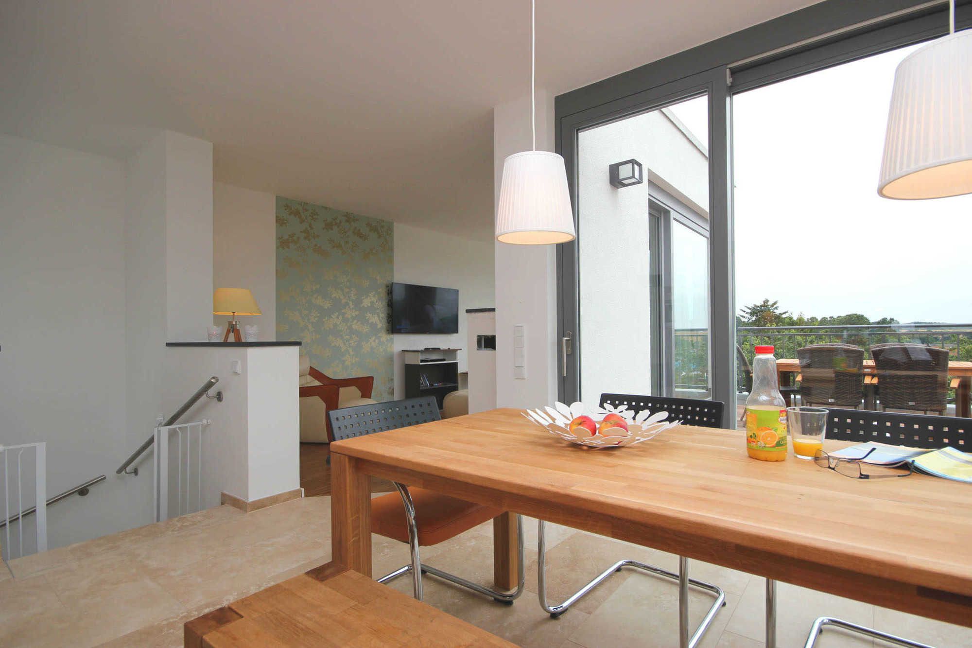 Über eine Treppe gelangen Sie in das Obergeschoss in den hochwertig ausgestatteten Wohnraum mit integrierter und moderner Wohnküche samt großem Esstisch und Zugang zur großen möblierten Dachterrasse. Hier genießen Sie einen weiten Blick über die Dächer von Binz.