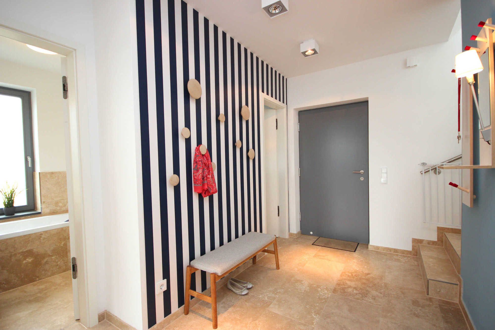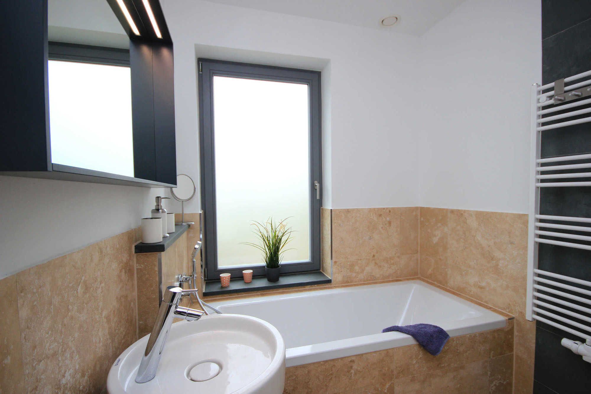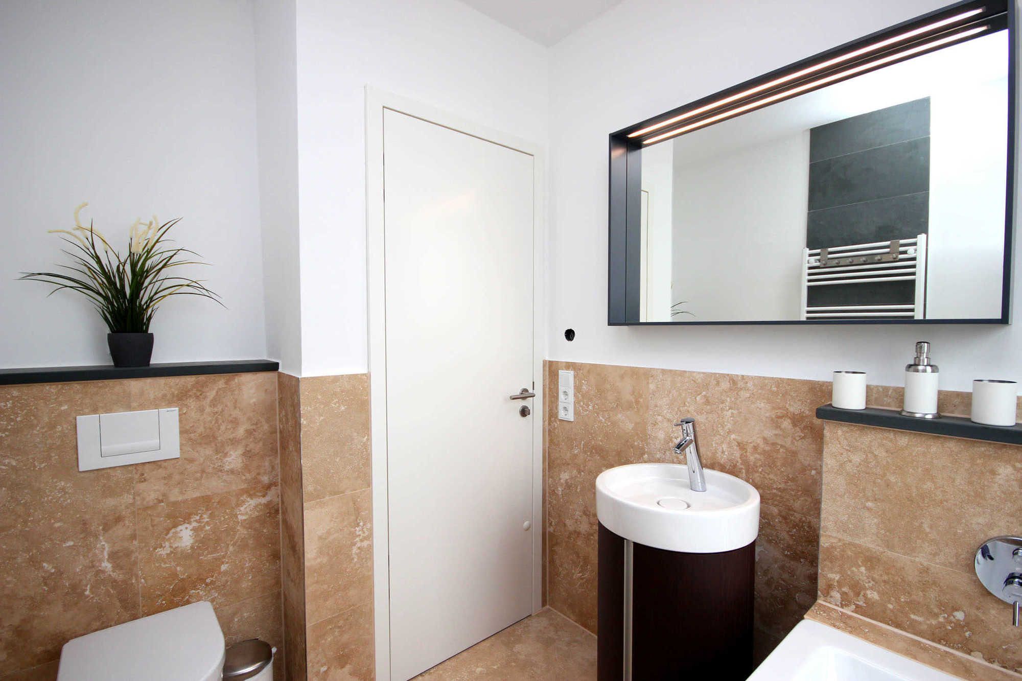 Das erste Bad verfügt über eine Badewanne, Handtuchtrockner, WC und Waschtisch. Im zweiten Bad erwartet Sie eine ebenerdige, großzügige Dusche, Handtuchtrockner, Waschtisch und WC.