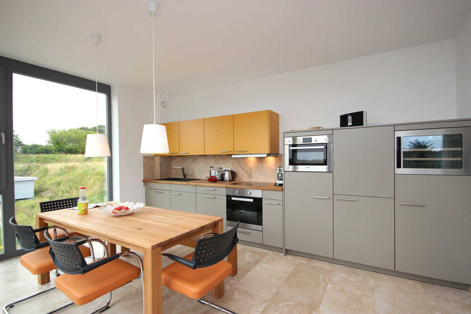 Das Wohnzimmer besticht durch seine offene Bauweise und lädt zum gemeinsamen Verweilen ein, ob zusammen auf dem Sofa oder in der gemütlichen Leseecke. Die technische Ausstattung umfasst einen großen Flachbildfernseher, Blu-ray-Player und einen gebührenfreien WLAN-Zugang. Die erstklassige SieMatic-Küchenzeile ist mit hochwertigen Markengeräten und Eichenholzmöbeln ausgestattet. Unter anderem mit Geschirrspülmaschine, Induktionskochfeld, Backofen, Mikrowelle, Kühlschrank sowie einem Weinkühlschrank.