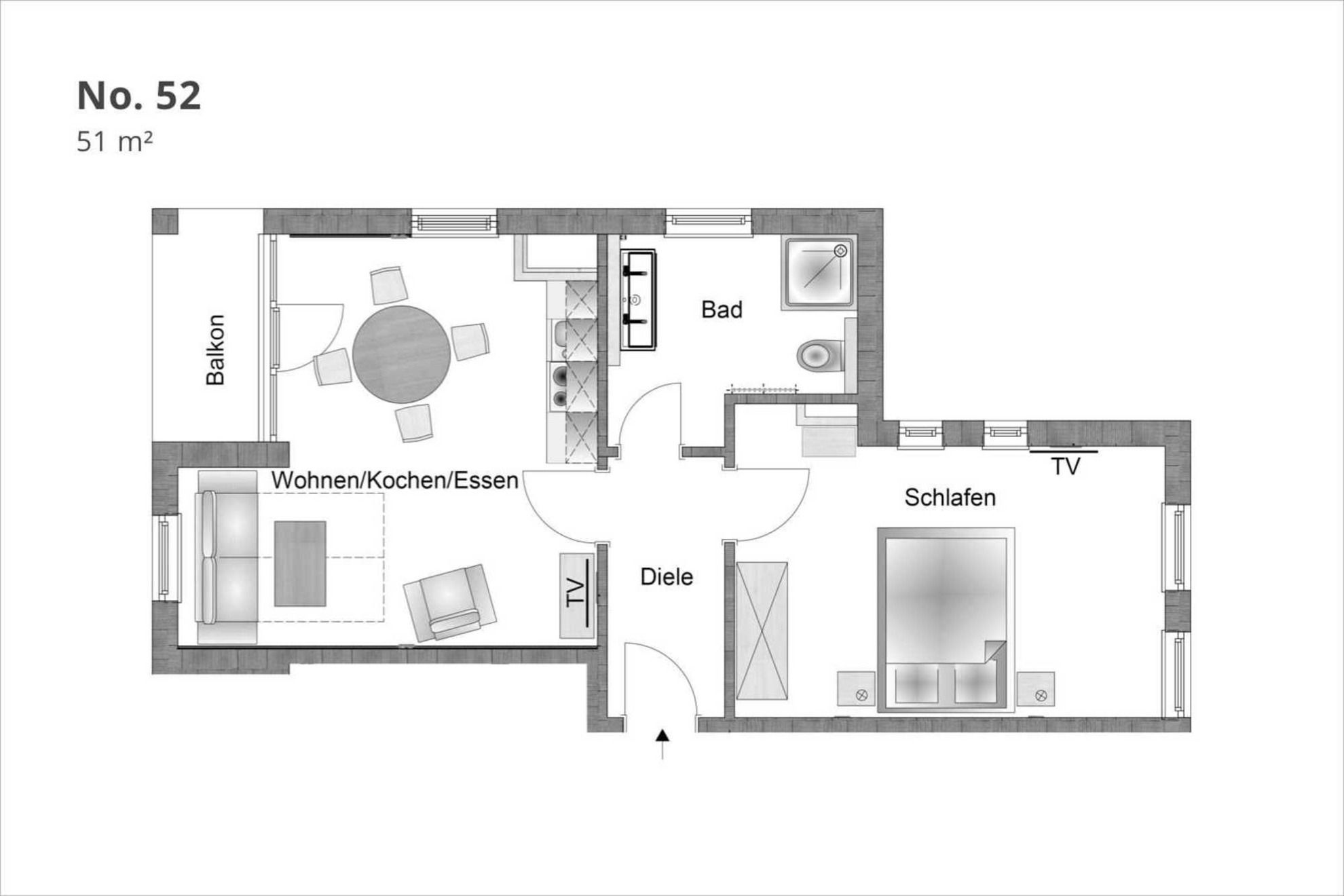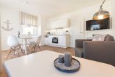 Neben dem Wohnraum mit offener Küche gibt es einen Schlafraum, sowie ein Badezimmer mit Waschtisch, Dusche und WC. Der Schlafraum ist mit einem Doppelbett, TV und einem großen Kleiderschrank ausgestattet. Außerdem finden Sie im komfortablen Wohnbereich neben der Sitzecke mit Schlafsofa für die 3. und 4. Person einen separaten Essplatz, TV mit integriertem Radio. Die moderne Küche ist mit Geschirrspülmaschine, Mikrowelle, Cerankochfeld, Kühlschrank und diversen Kleingeräten ausgestattet.