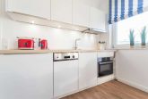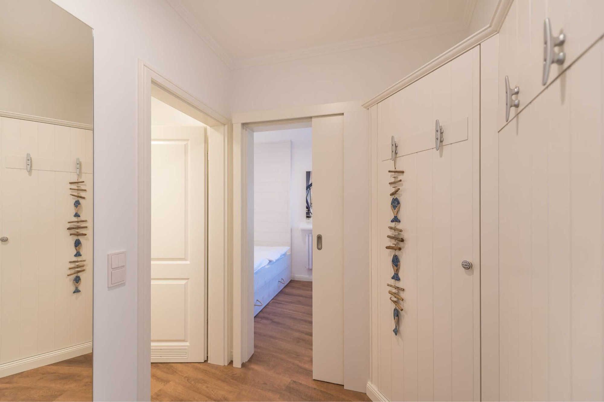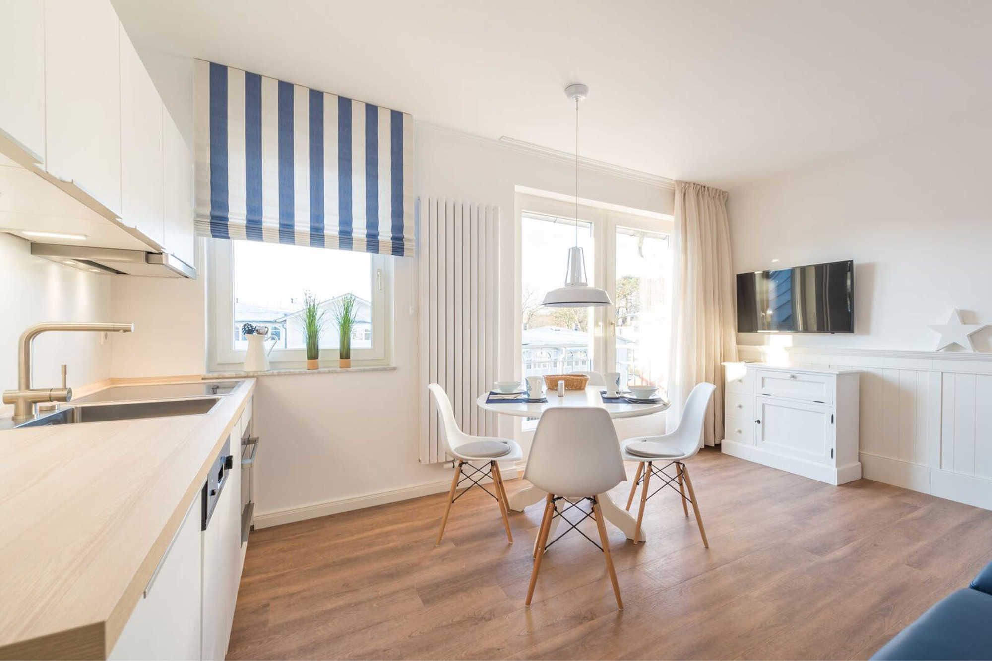 Neben dem Wohnraum mit offener Küche gibt es einen Schlafraum, sowie ein Badezimmer mit Waschtisch, Dusche und WC. Der Schlafraum ist mit einem Doppelbett und einem großen Kleiderschrank ausgestattet. Außerdem finden Sie im komfortablen Wohnbereich neben der Sitzecke mit Schlafsofa für die 3. und 4. Person einen separaten Essplatz, TV mit integriertem Radio und kostenlosem Internetzuganag. Die moderne Küche ist mit Geschirrspülmaschine, Mikrowelle, Cerankochfeld, Kühlschrank und diversen Kleingeräten ausgestattet.