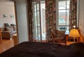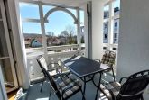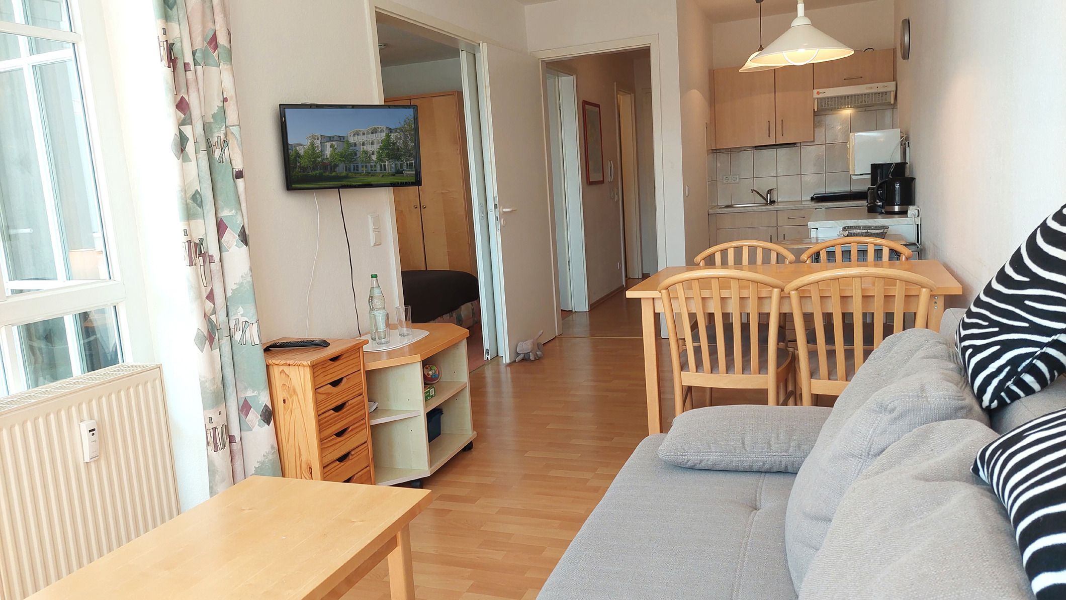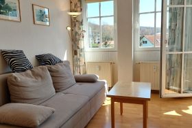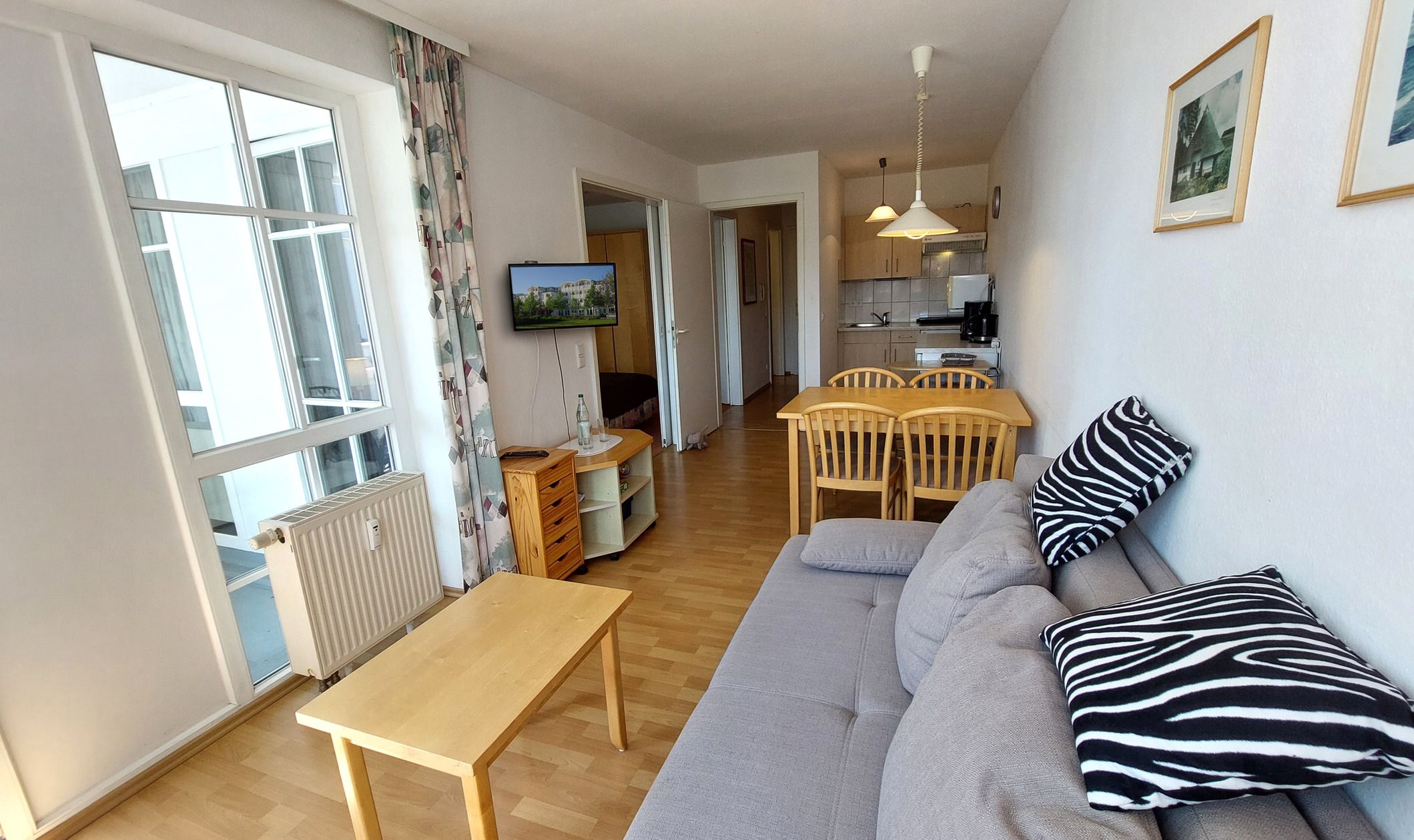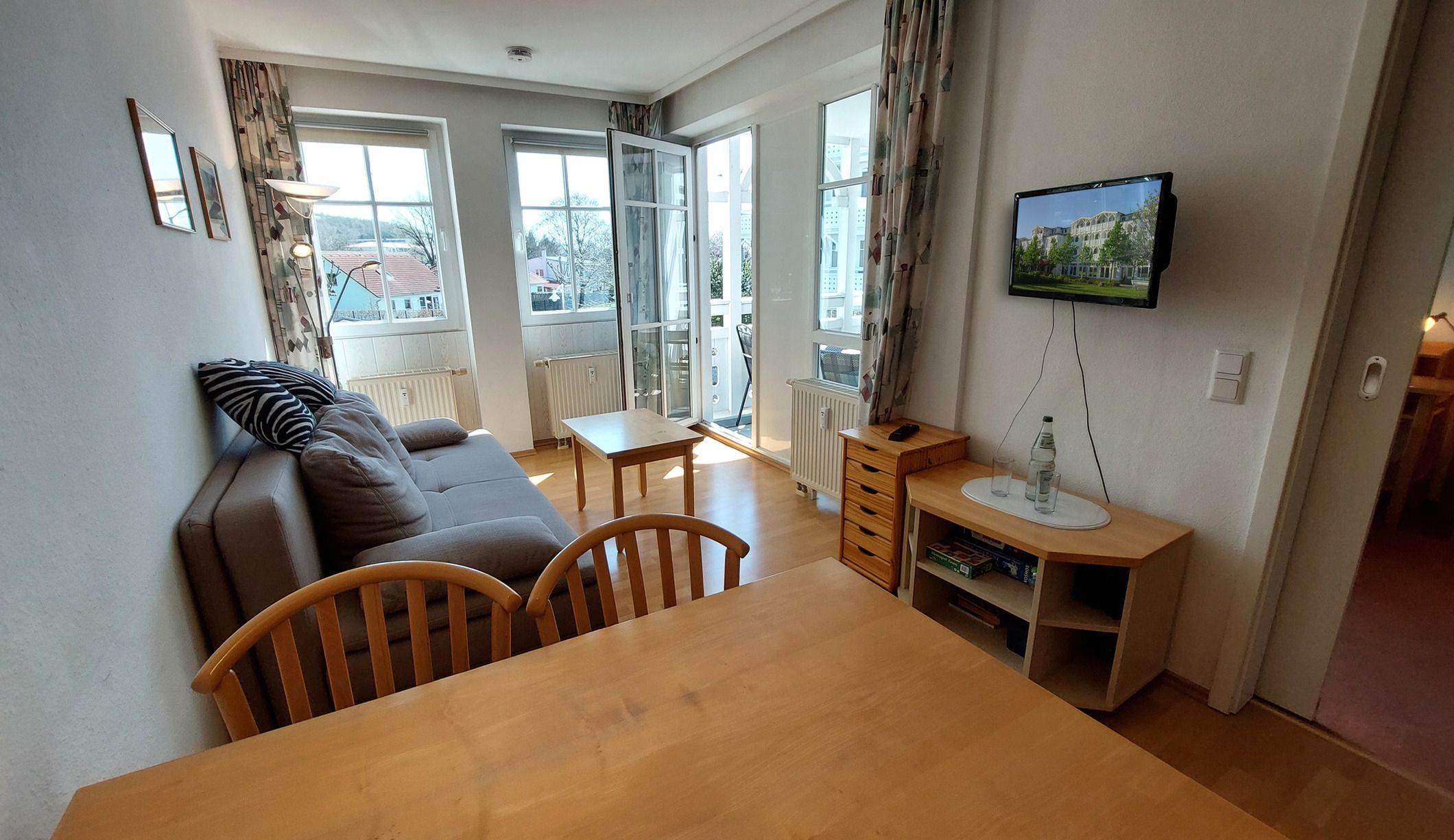 Im Wohnbereich befindet sich ein Schlafsofa samt TV sowie ein weiterer Zugang zum Balkon.