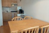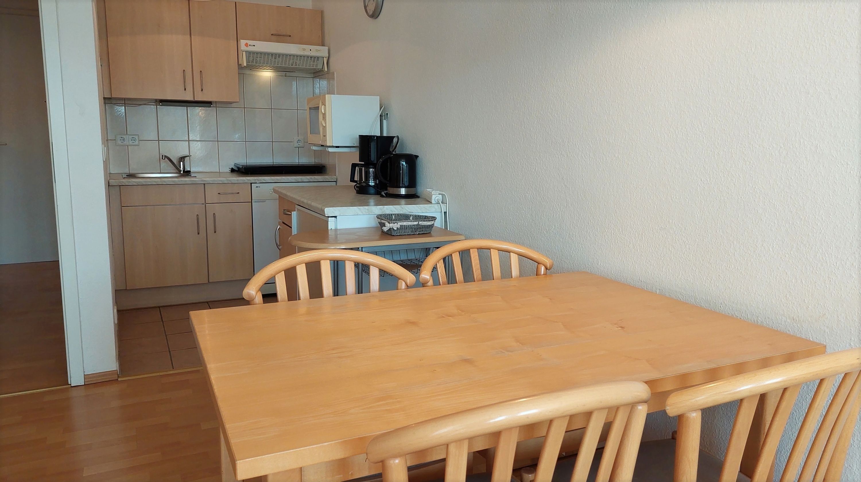 Es gibt einen Esstisch mit vier Sitzgelegenheiten und eine gut ausgestattete Küchenzeile mit 2-Platten-Ceranfeld, Geschirrspüler, Mikrowelle und vielen Küchenutensilien.