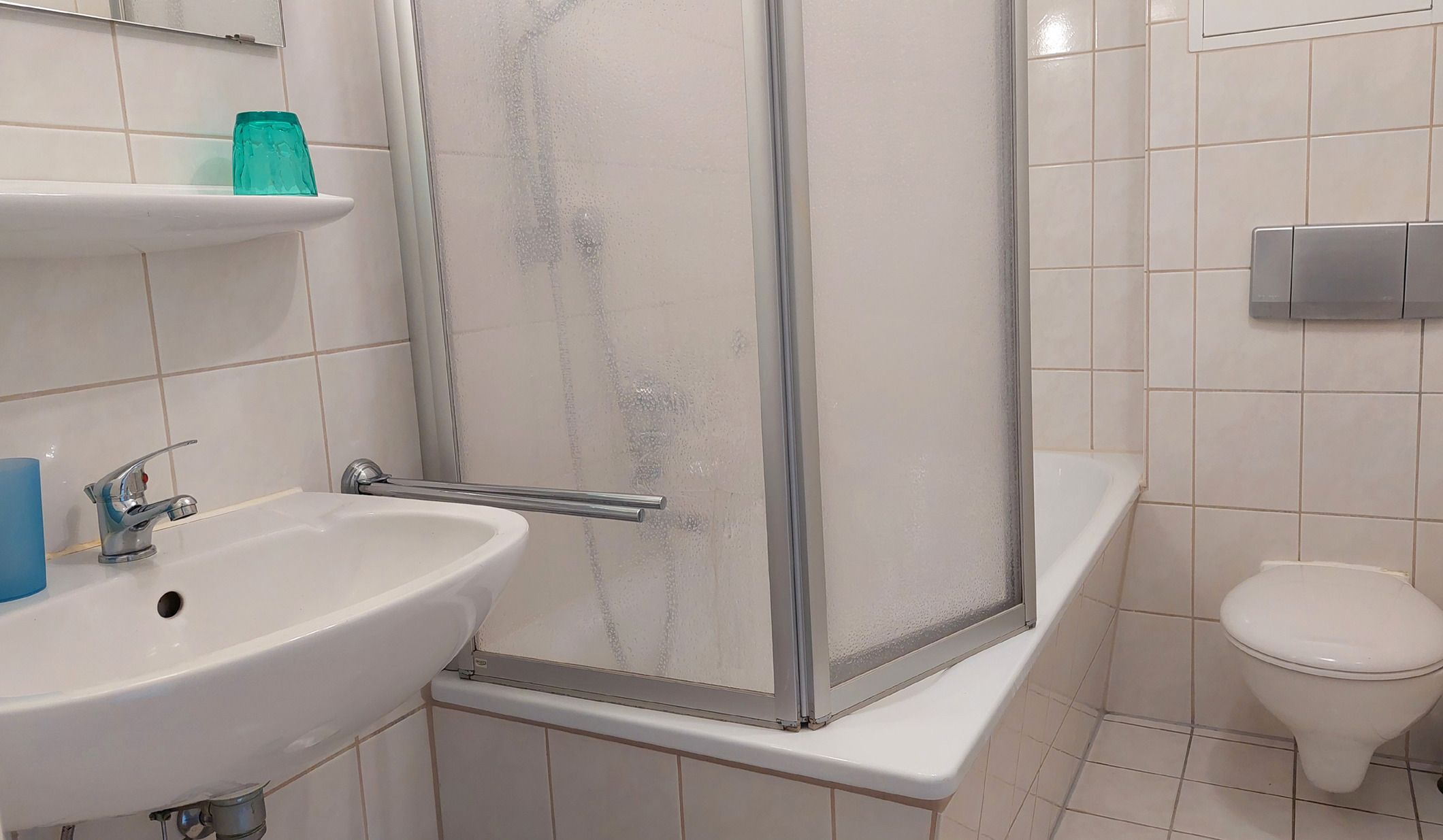 Im angrenzenden Badezimmer finden Sie dann Waschbecken, WC und eine Badewanne (mit Duschfunktion).