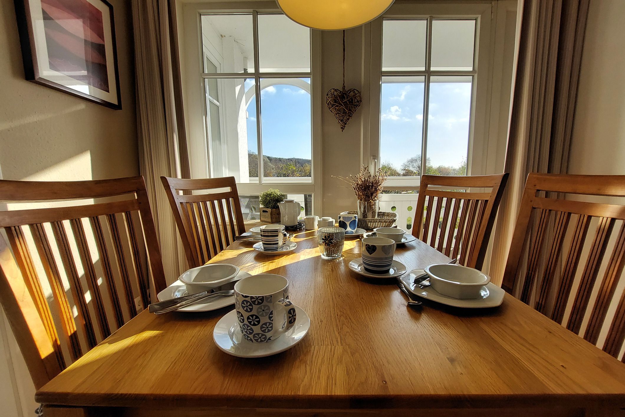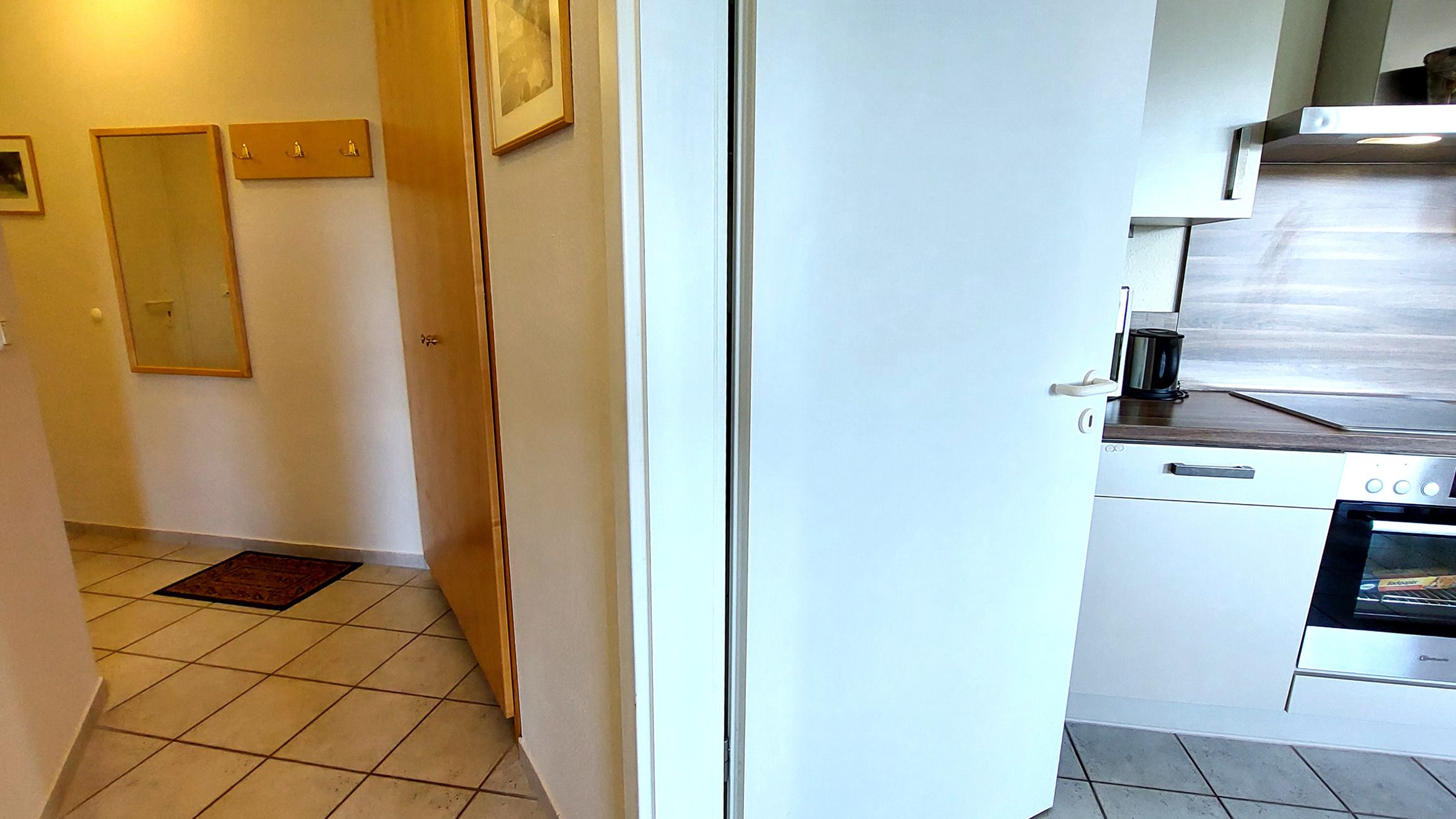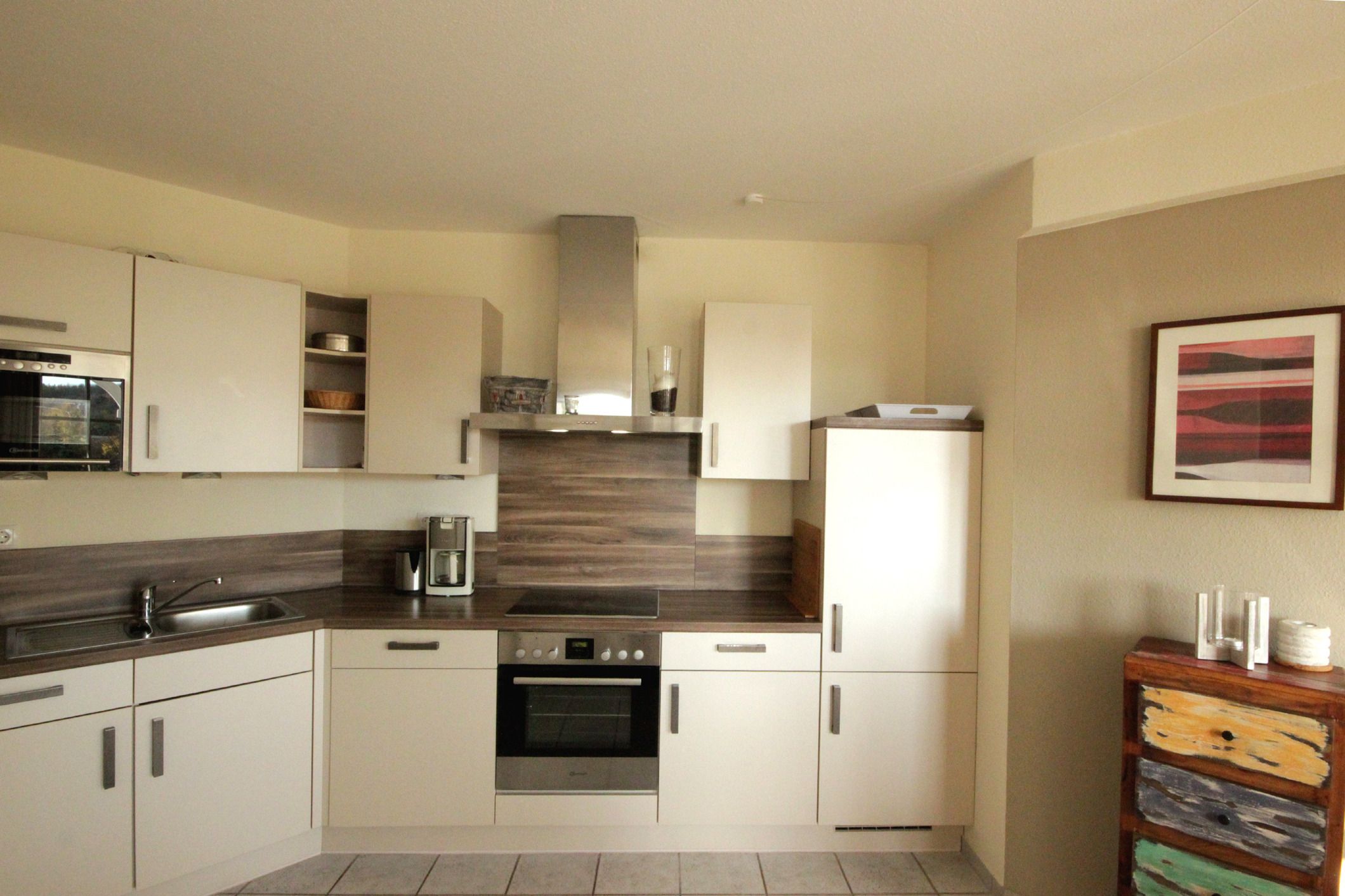 Die attraktive gut ausgestattete Wohnküche mit Cerankochfeld, Backofen, Mikrowelle, Kühl-/Gefrierkombination, Geschirrspüler, Kaffeemaschine, Wasserkocher, Toaster sowie diversen anderen Küchenhelfern lädt zum Kochen und gemeinsamen Essen ein.