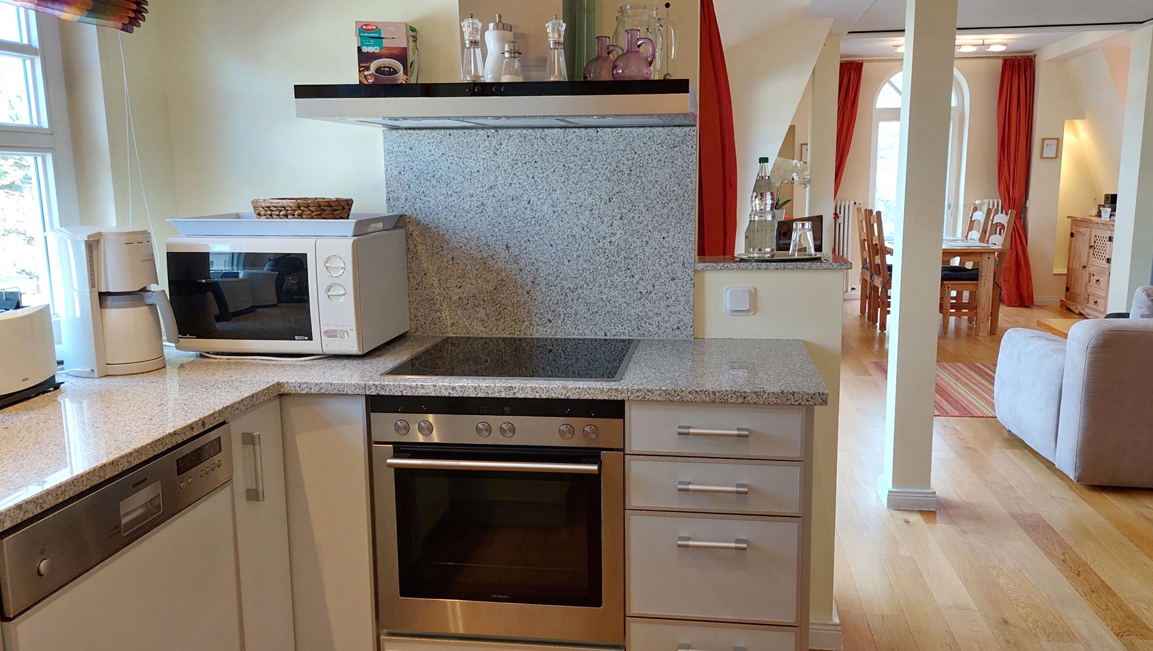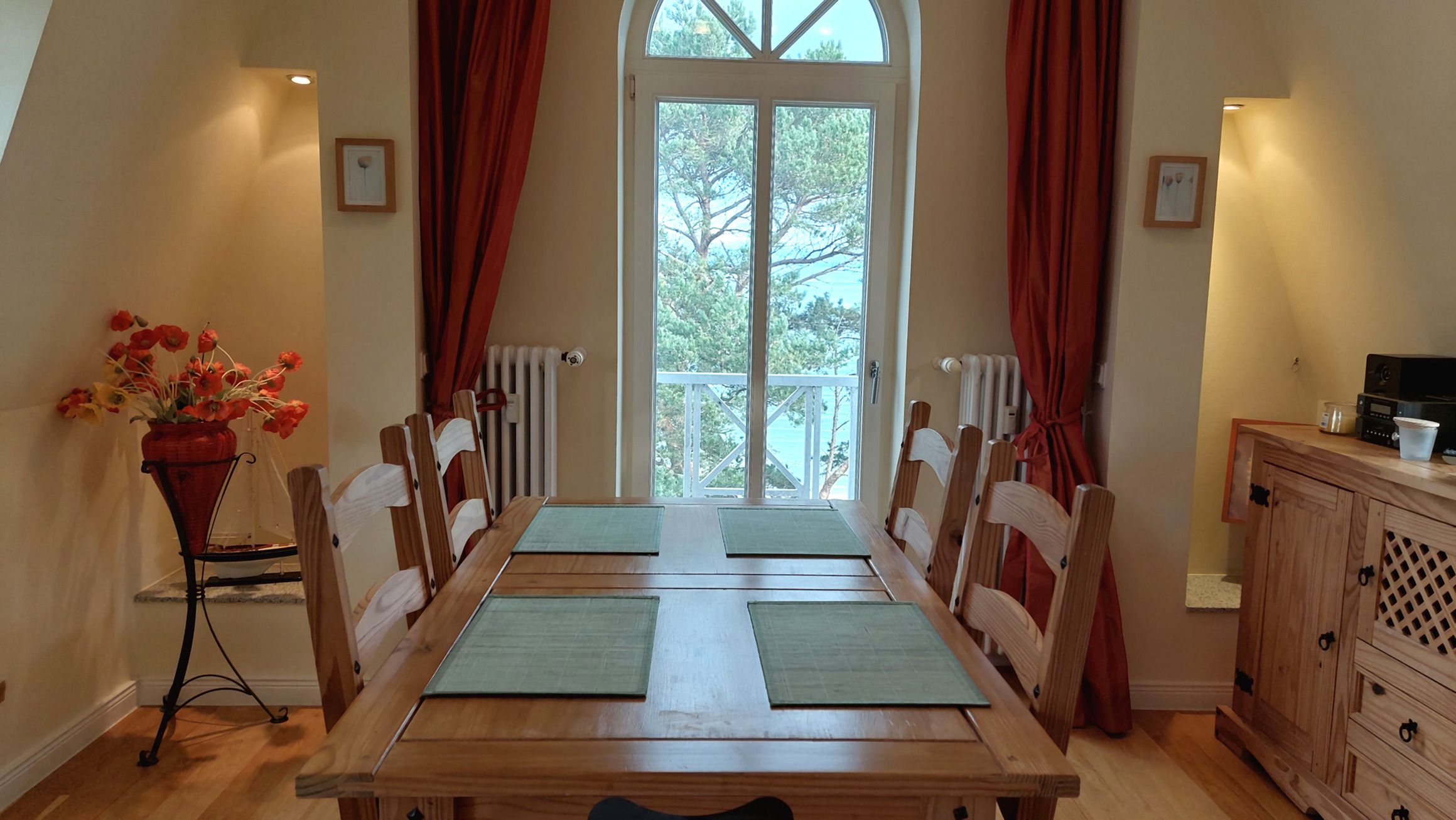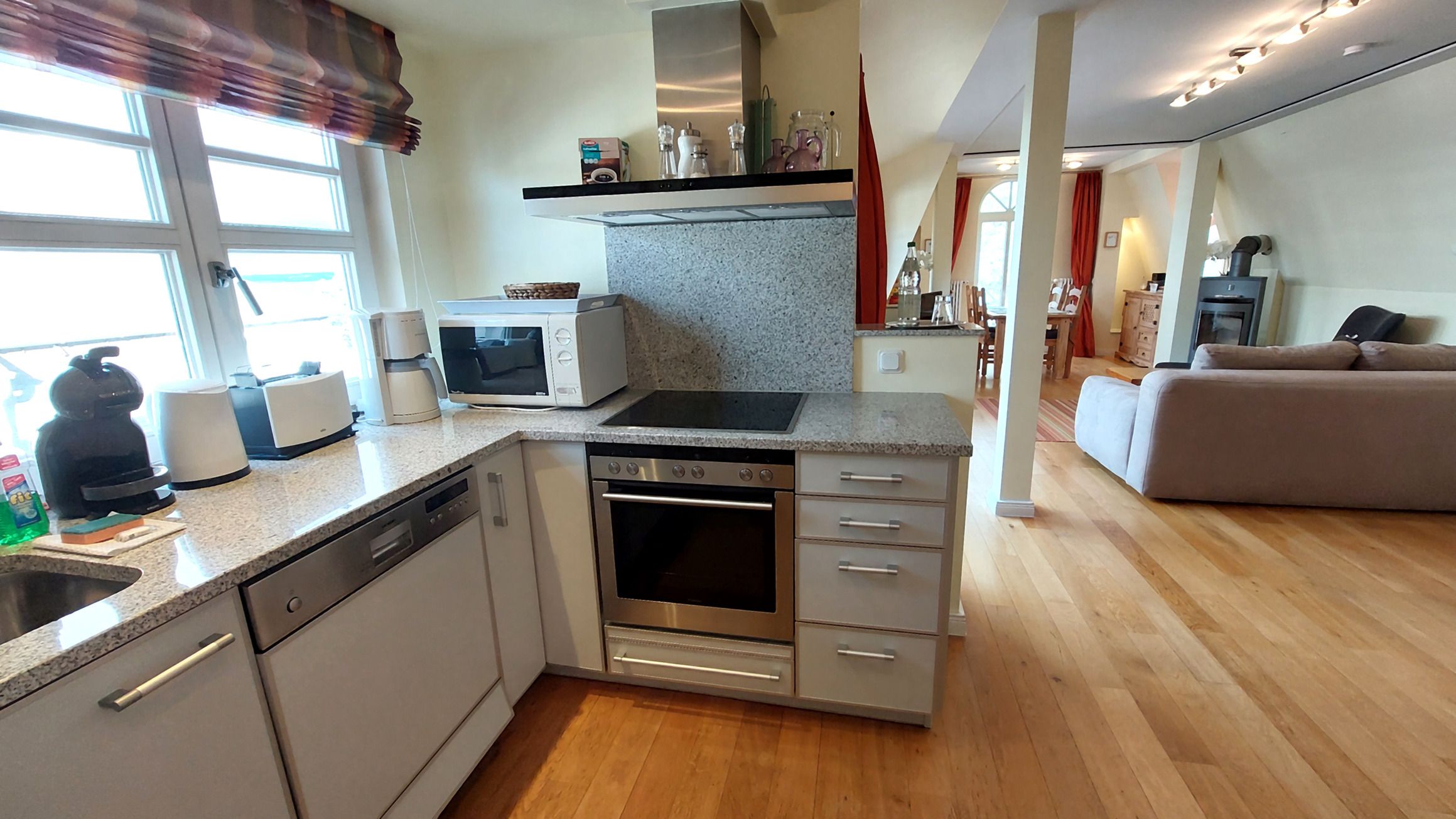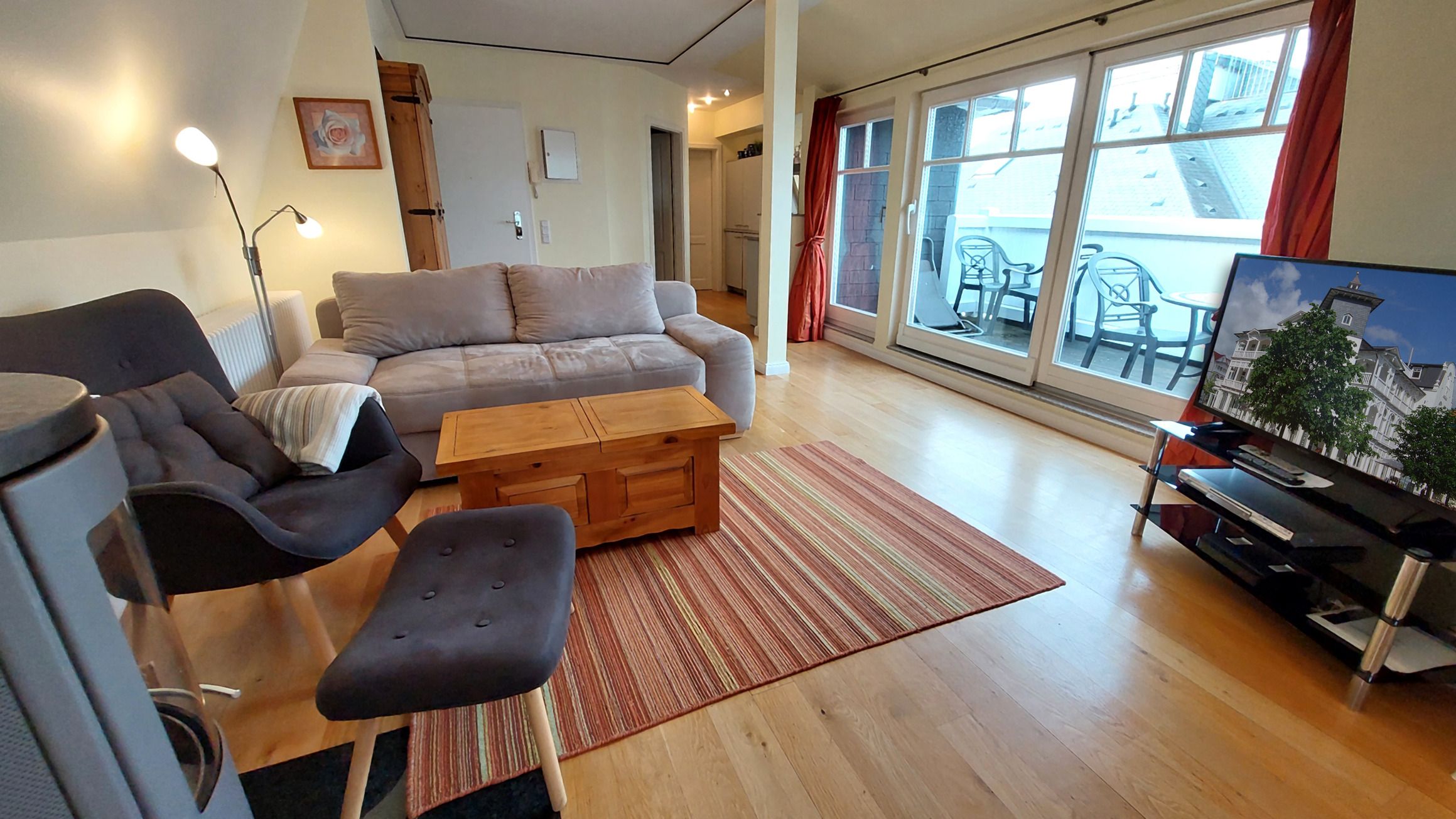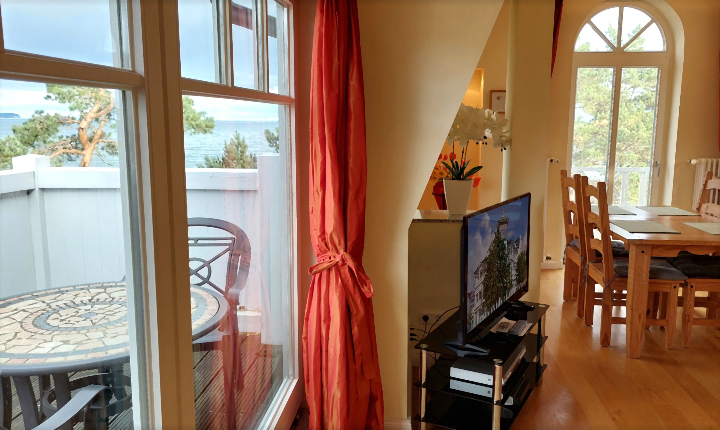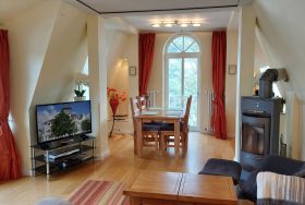 Aus dem Wohnbereich und vom Nordbalkon haben Sie direkte Sicht auf die Ostsee bis zu den berühmten Kreidefelsen der Insel. Das Appartement ist aufgeteilt in einen schönen Wohnraum mit Kaminofen, eine offene moderne Markeneinbauküche mit Granitarbeitsplatte, ein separates Schlafzimmer mit vorgelagertem Balkon zur Sonnenseite und ein Duschbad, mit Waschtisch und WC. Das Wohnzimmer ist mit einem Essplatz und einer Sitzgruppe, die auch zwei Schlafgelegenheiten auf dem Sofa bietet, möbliert. Die technische Ausstattung beinhaltet einen Flachbildfernseher, einen kostenlosen Internetzugang und eine Musikanlage. Die Küche ist mit Kühlschrank, Backofen, Ceranfeld, Geschirrspüler, Mikrowelle und weiteren Elektrogeräten komplett ausgestattet. Im Schlafzimmer finden Sie ein Doppelbett, einen großen Kleiderschrank und ab sofort auch einen Flachbildfernseher .