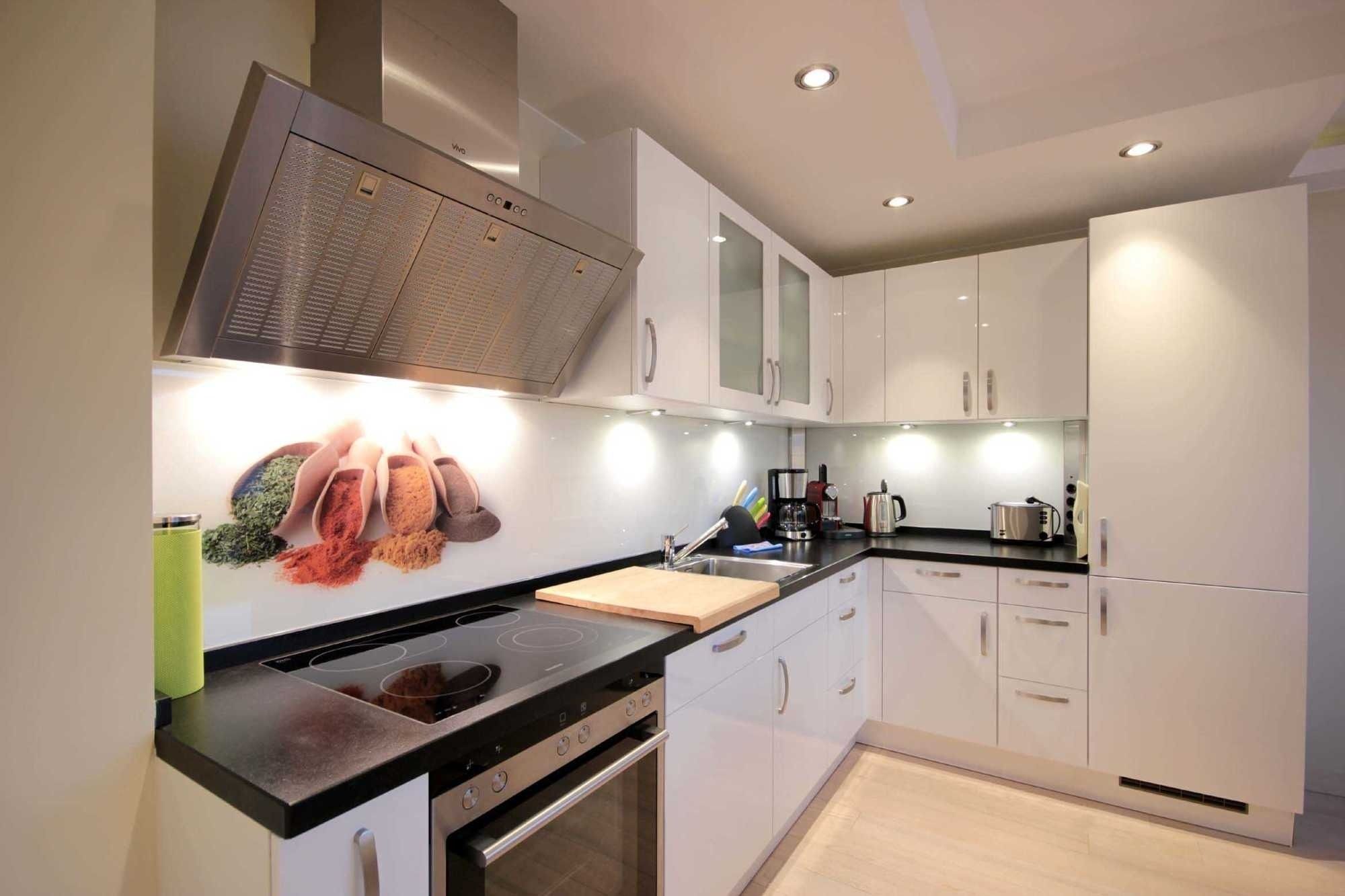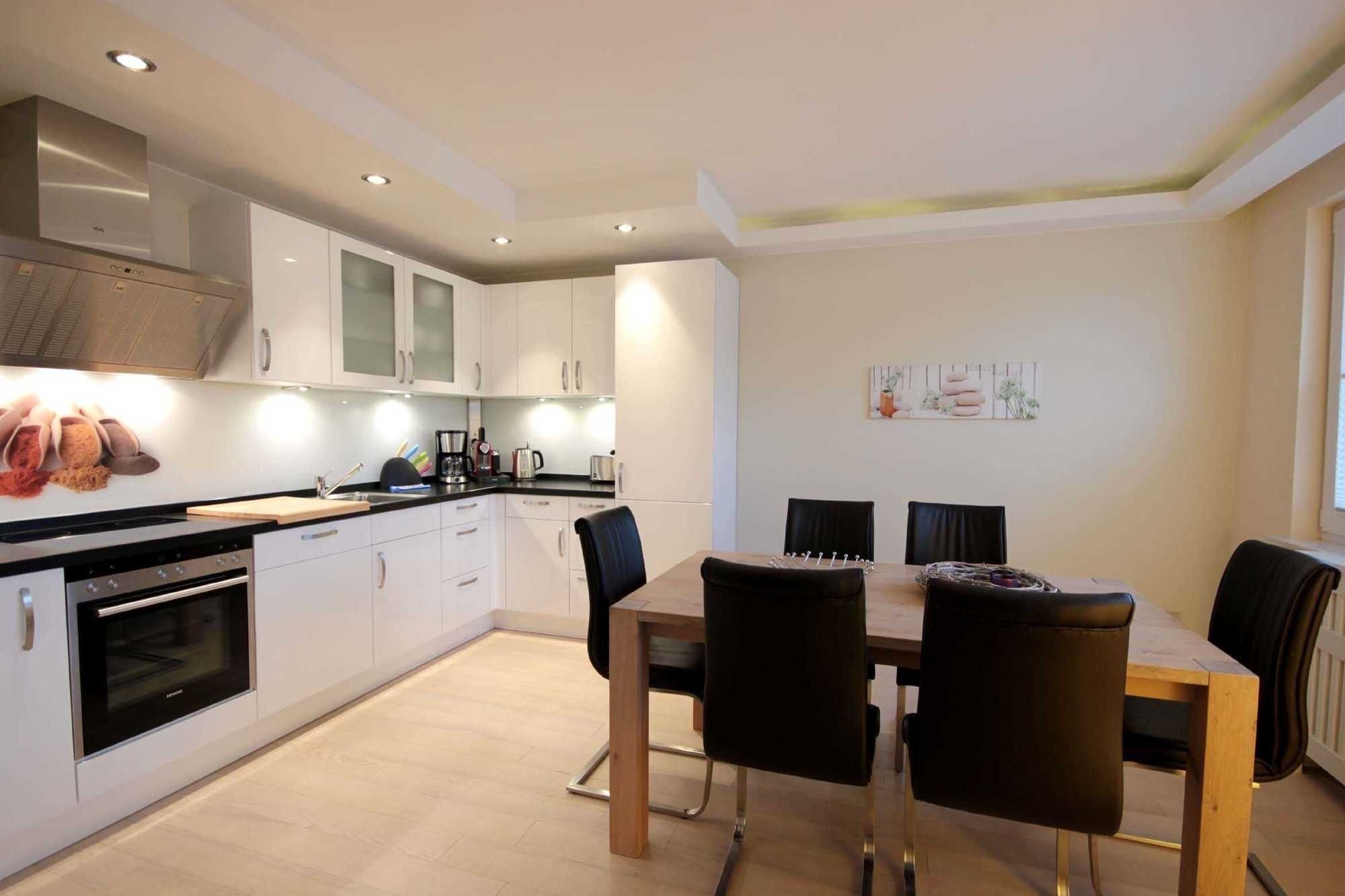 Im großzügigen Wohnbereich erwartet Sie eine bequeme Ledersitzgruppe zum gemeinsamen Verweilen, ein Flachbild-TV, Blue-ray/DVD-Player sowie ein kostenfreier WLAN-Zugang. Die offen gestaltete Winkelküche mit Marken-Einbaugeräten, u.a. mit Geschirrspüler, Backofen, Cerankochfeld, Kühlschrank sowie Kaffeemaschine, Nespressomaschine, Wasserkocher, Toaster bietet Ihnen zudem einen großen Esstisch mit Freischwinger-Stühlen.