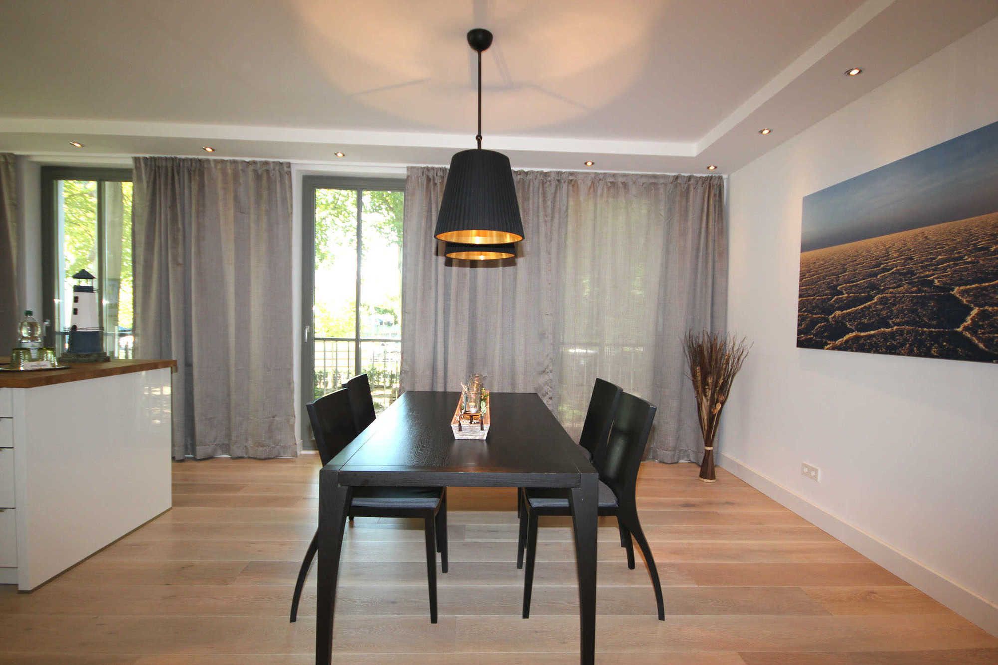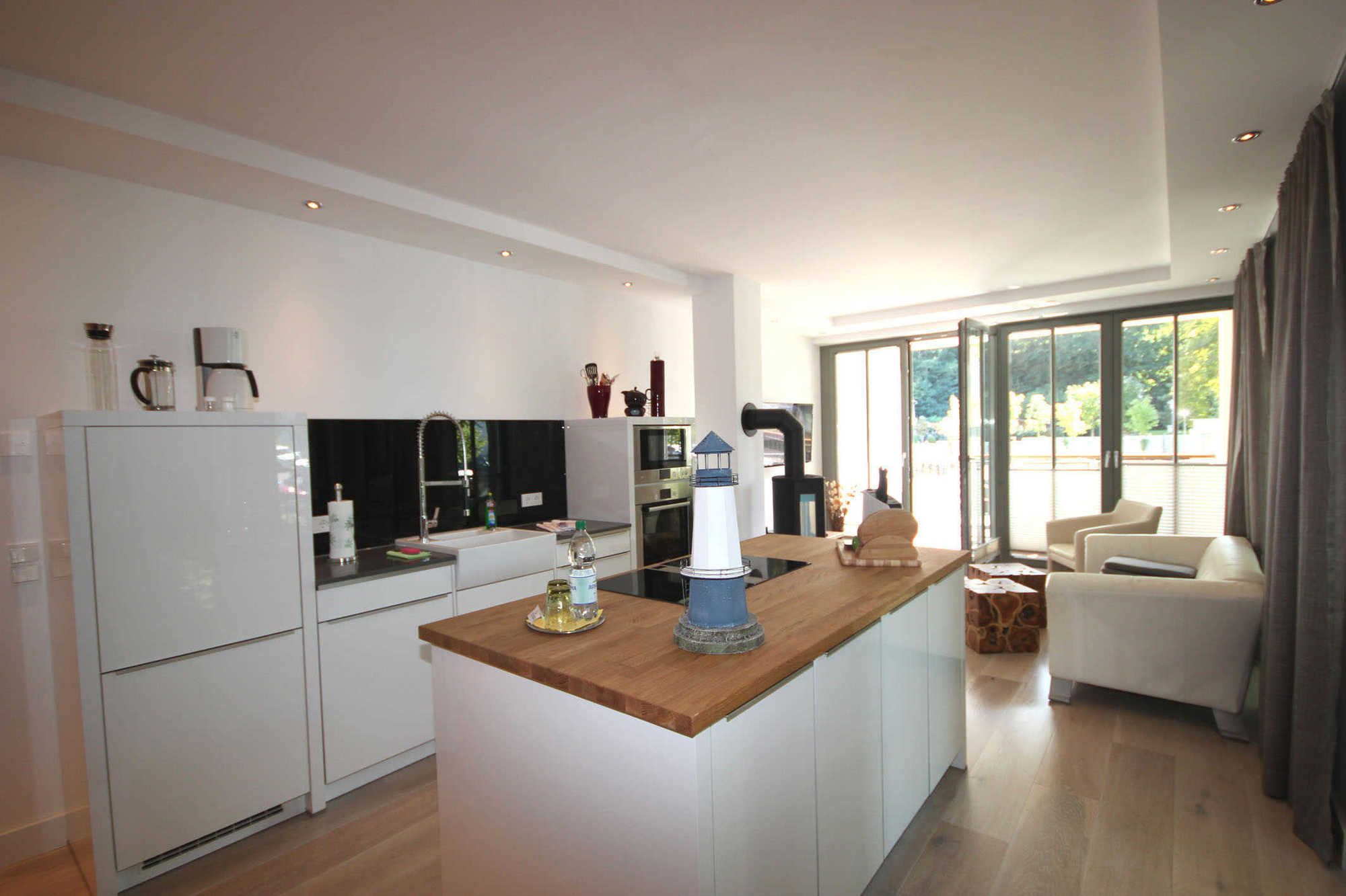 Neben dem hochwertig ausgestattetem Wohnraum mit integrierter und moderner Wohnküche mit Essplatz erwarten Sie zwei großzügige und separate Schlafräume sowie zwei Badezimmer mit Regendusche, Waschtisch und WC. Das Wohnzimmer besticht durch seine offene Bauweise und lädt zum gemeinsamen Verweilen ein. Die technische Ausstattung umfasst einen Flachbildfernseher, eine Musikanlage und einen gebührenfreien W-Lan Zugang. In beiden Schlafräumen befindet sich jeweils ein großes und gemütliches Doppelbett sowie ein Einbaukleiderschrank. Das Hauptschlafzimmer zeichnet sich durch ein eigenen Bad aus. Die hochwertige Inselküche ist komplett mit Geschirrspülmaschine, Ceranfeld, Backofen, Mikrowelle, Kühlschrank mit Gefrierfach und weiteren Küchenhelfern ausgestattet. Als weiteres Highlight können Sie eine Waschmaschine und einen Trockner im Kellerbereich kostenfrei nutzen.