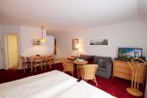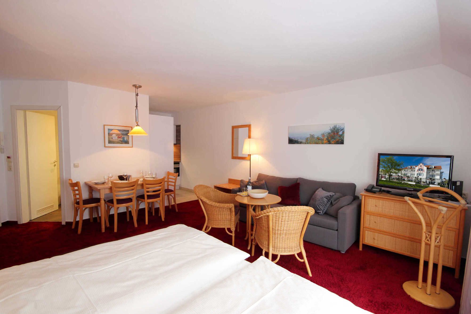 Ihre 1-Zimmer Ferienwohnung 225RB17 befindet sich im 2. Obergeschoss, ist ca. 45 qm groß und für bis zu 4 Personen gut geeignet. Das Appartement erreichen Sie mit dem Aufzug bis zur 2. Etage, dann über eine Treppe eine halbe Etage runter. Neben dem kombinierten Wohn- und Schlafraum mit Doppelbett sowie Schlafsofa, auf dem die 3. und 4. Person gut schlafen können, gehört ein Essbereich, Flachbild TV sowie WLAN zur Nichtraucherwohnung. Vom Balkon haben Sie einen seitlichen Blick auf die Strandpromenade und zur Binzer Seebrücke. Ebenfalls können Sie eine voll ausgestattete integrierte Küchenzeile mit Geschirrspüler, Nespresso-Maschine, Backofen, Mikrowelle, Wasserkocher, Toaster und Kaffeemaschine nutzen. Das Badezimmer erwartet Sie mit Waschtisch, WC und Dusche. Haustiere sind herzlich willkommen.
