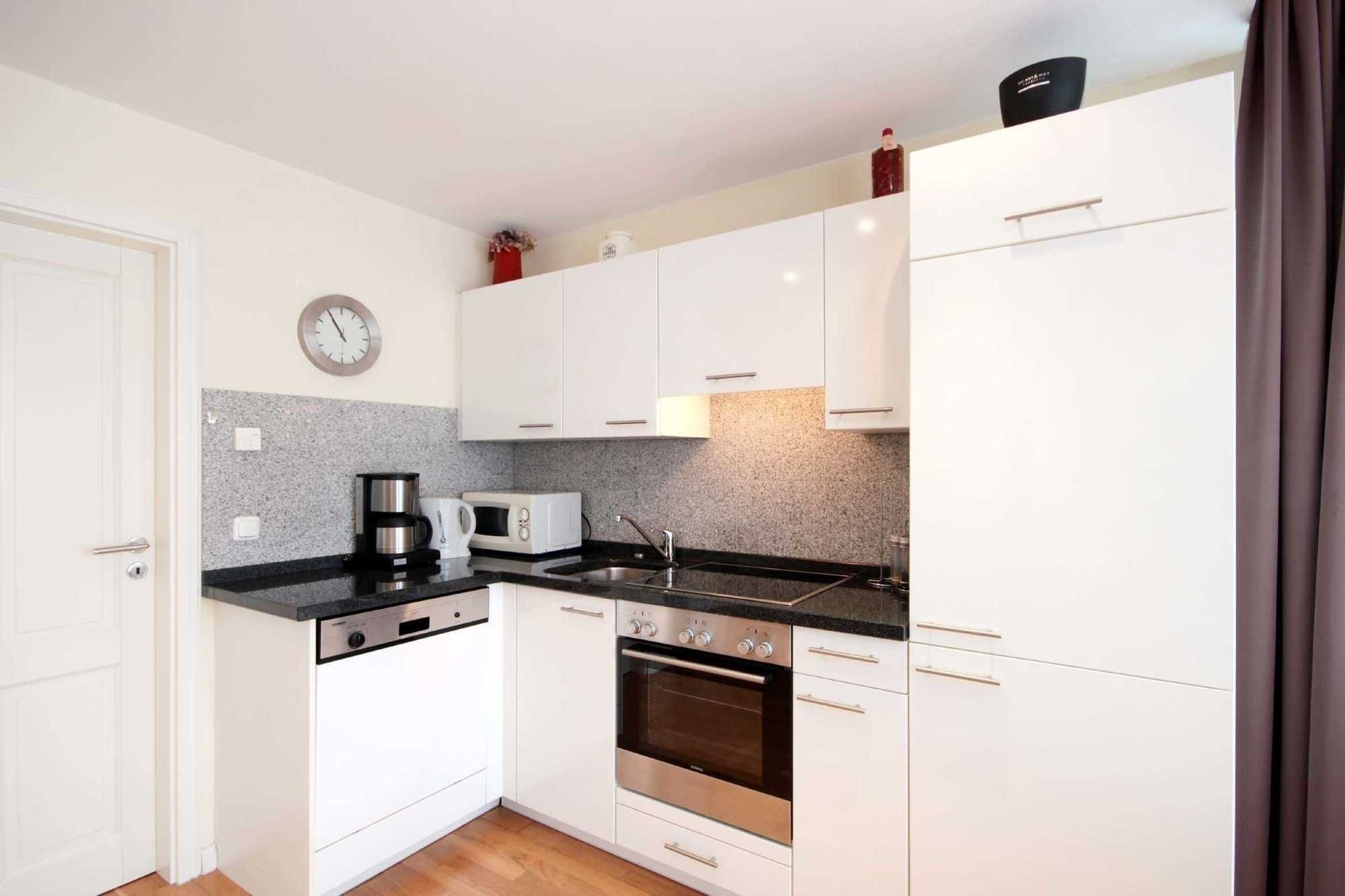 Die Ferienwohnung ist aufgeteilt in einen gemütlichen Wohnraum mit Kaminofen, eine offene moderne Markeneinbauküche mit Granitarbeitsplatte, ein Schlafzimmer und ein Duschbad mit Waschtisch, Fön und WC. Das Wohnzimmer ist mit einem Essplatz und einer Sitzgruppe, die auch eine Schlafgelegenheit für die 3.und 4. Person bietet, möbliert. Die technische Ausstattung beinhaltet ein modernen Smart-TV und eine Musikanlage. Die Küche ist mit Kühlschrank, Mikrowelle, Backofen, Ceranfeld, Geschirrspüler und weiteren Elektrogeräten komplett ausgestattet. Das Schlafzimmer verfügt über ein Doppelbett und einen Kleiderschrank.
