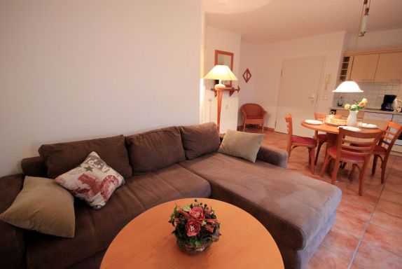 Neben dem Wohnraum mit offener Küche erwartet Sie ein separater Schlafraum sowie ein Badezimmer mit Dusche, Waschbecken und WC. Der Schlafraum ist mit einem bequemen Doppelbett und einem großen Kleiderschrank ausgestattet. Im Wohnraum können auf dem ausziehbaren Sofa zwei weitere Personen schlafen. Außerdem finden Sie im komfortablen Wohnbereich neben der Sitzecke einen Flachbild-TV, einen Couchtisch und einen separaten Essplatz. Die Küche ist mit Geschirrspülmaschine, Backofen, 4-Plattenkochfeld, Kühlschrank mit kleinem Gefrierfach, Kaffeemaschine, Toaster, Wasserkocher und diversen weiteren Küchenutensilien ausgestattet. Eine schöne Terrasse zum Verweilen befindet sich angrenzend vor dem Wohnraum.