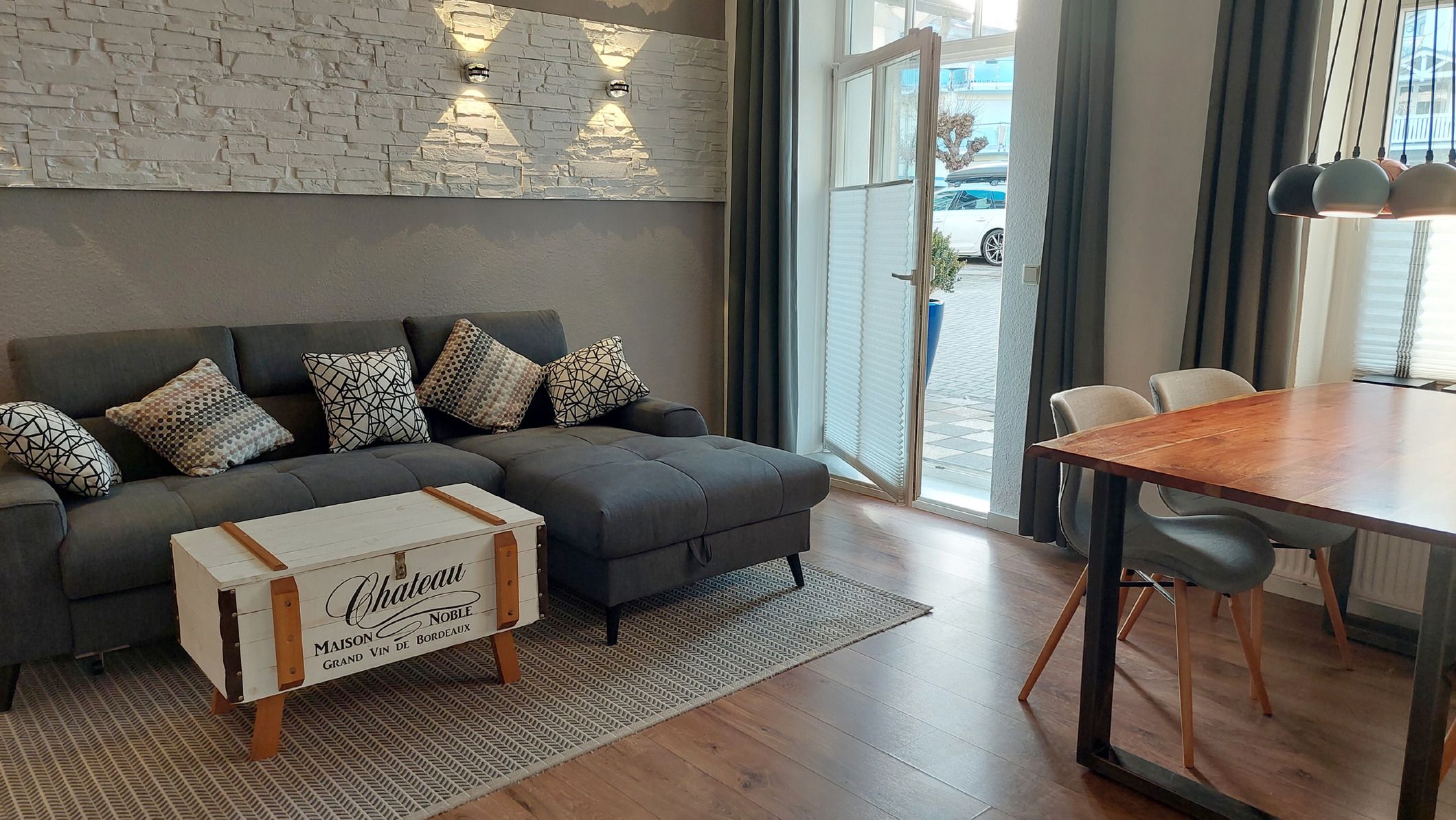 Vom Wohnbereich gelangen Sie zur möbliertem Westterrasse und zur kleinen Südterrasse Richtung Parkplatz und Abendsonne.