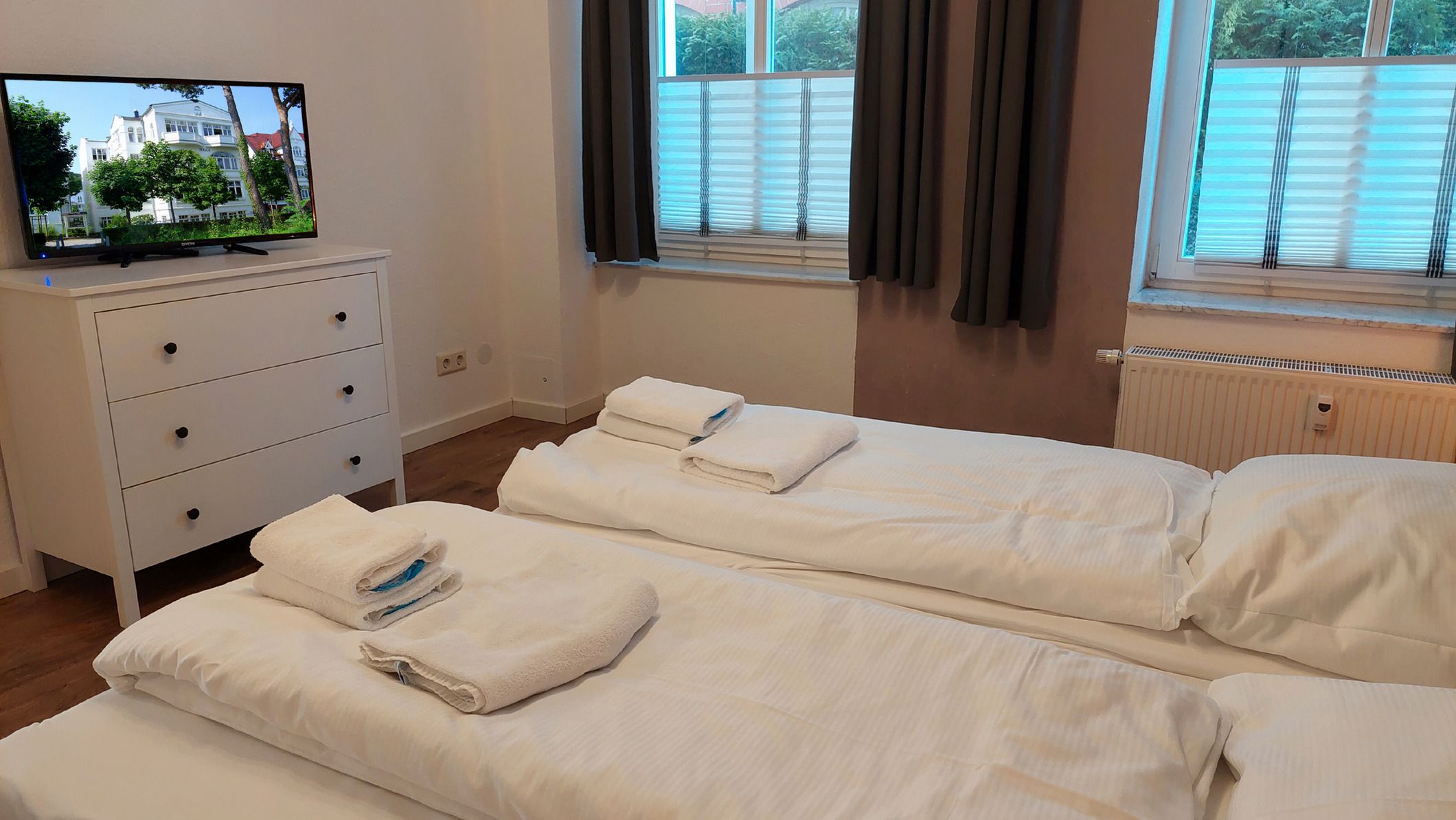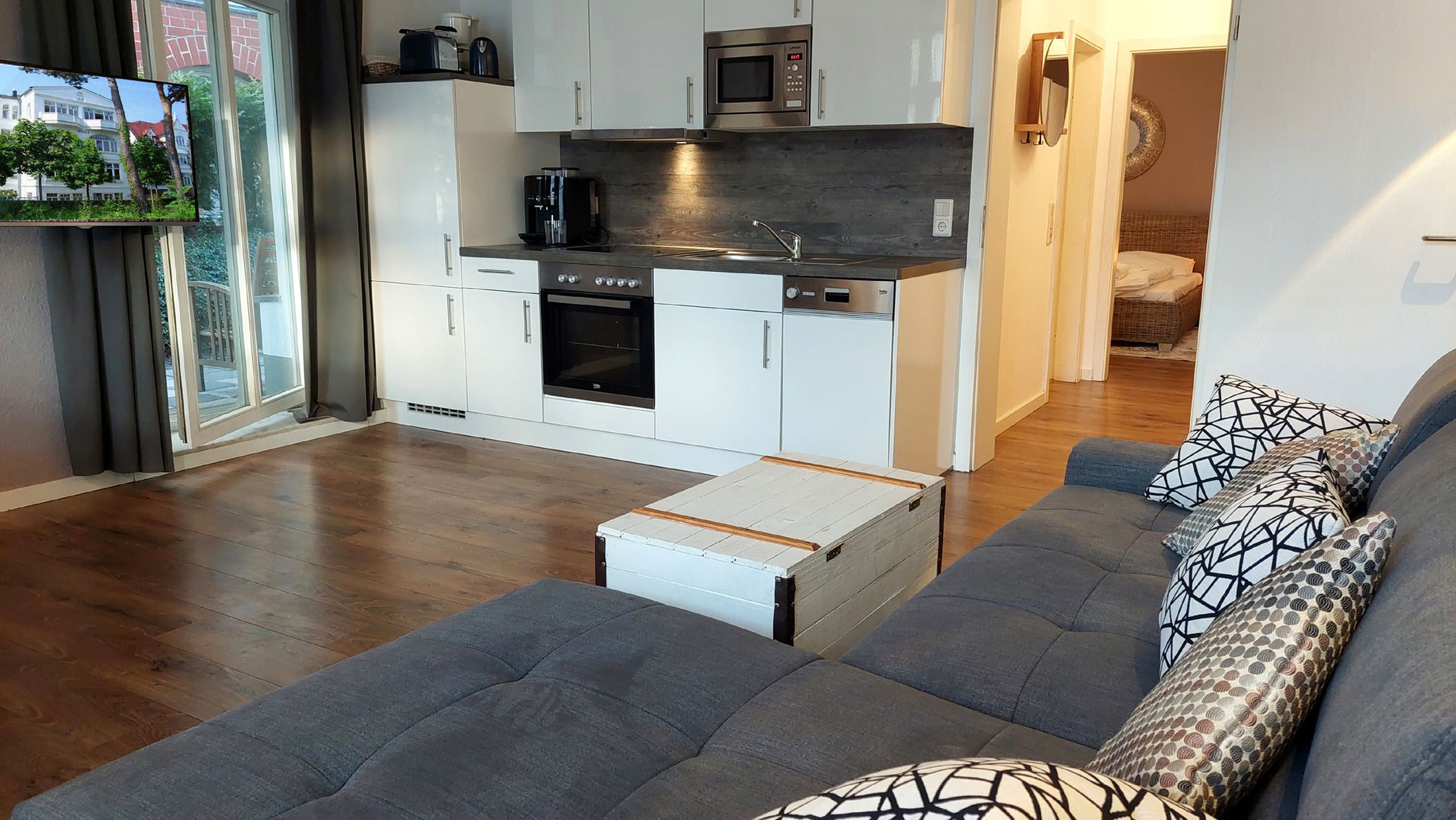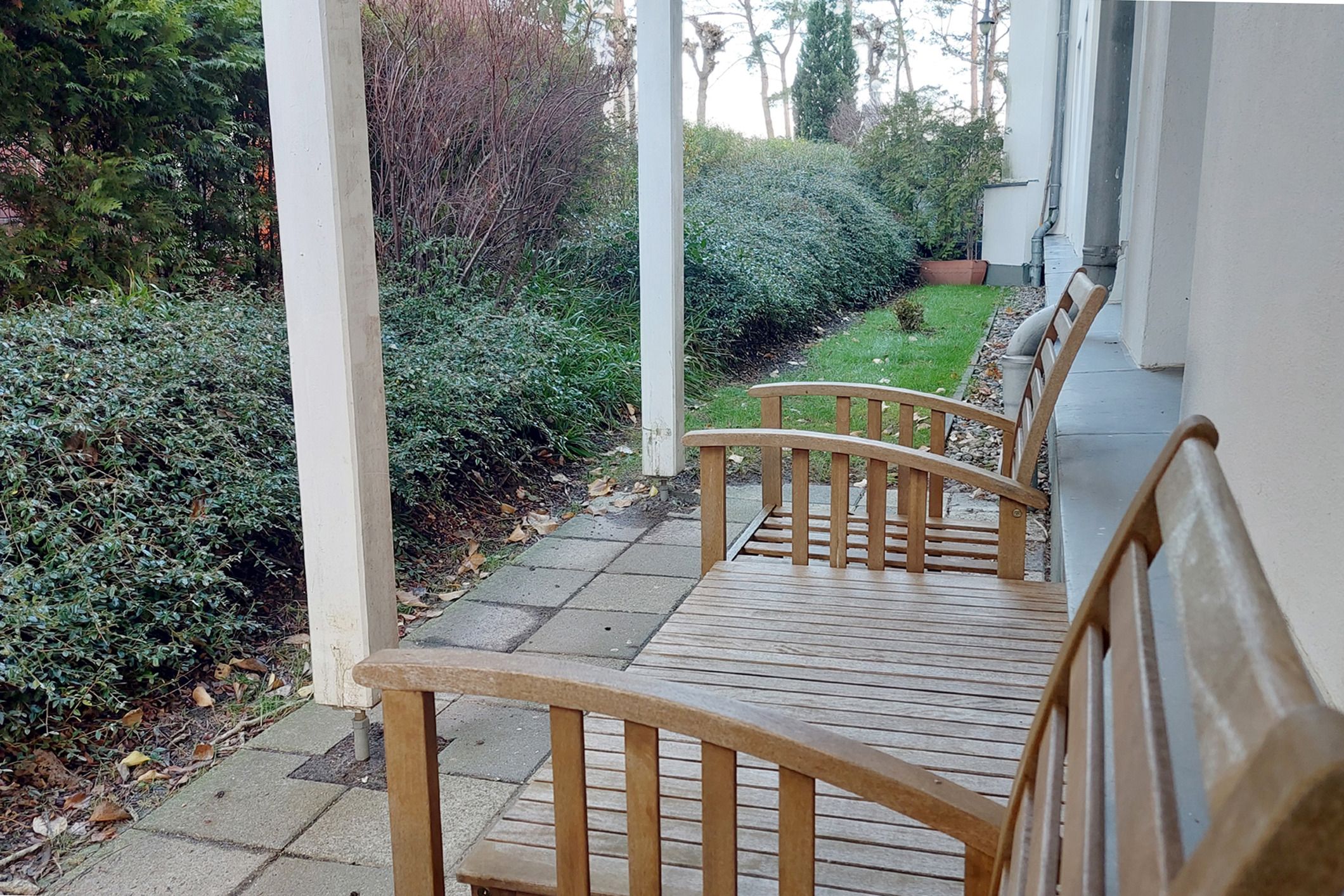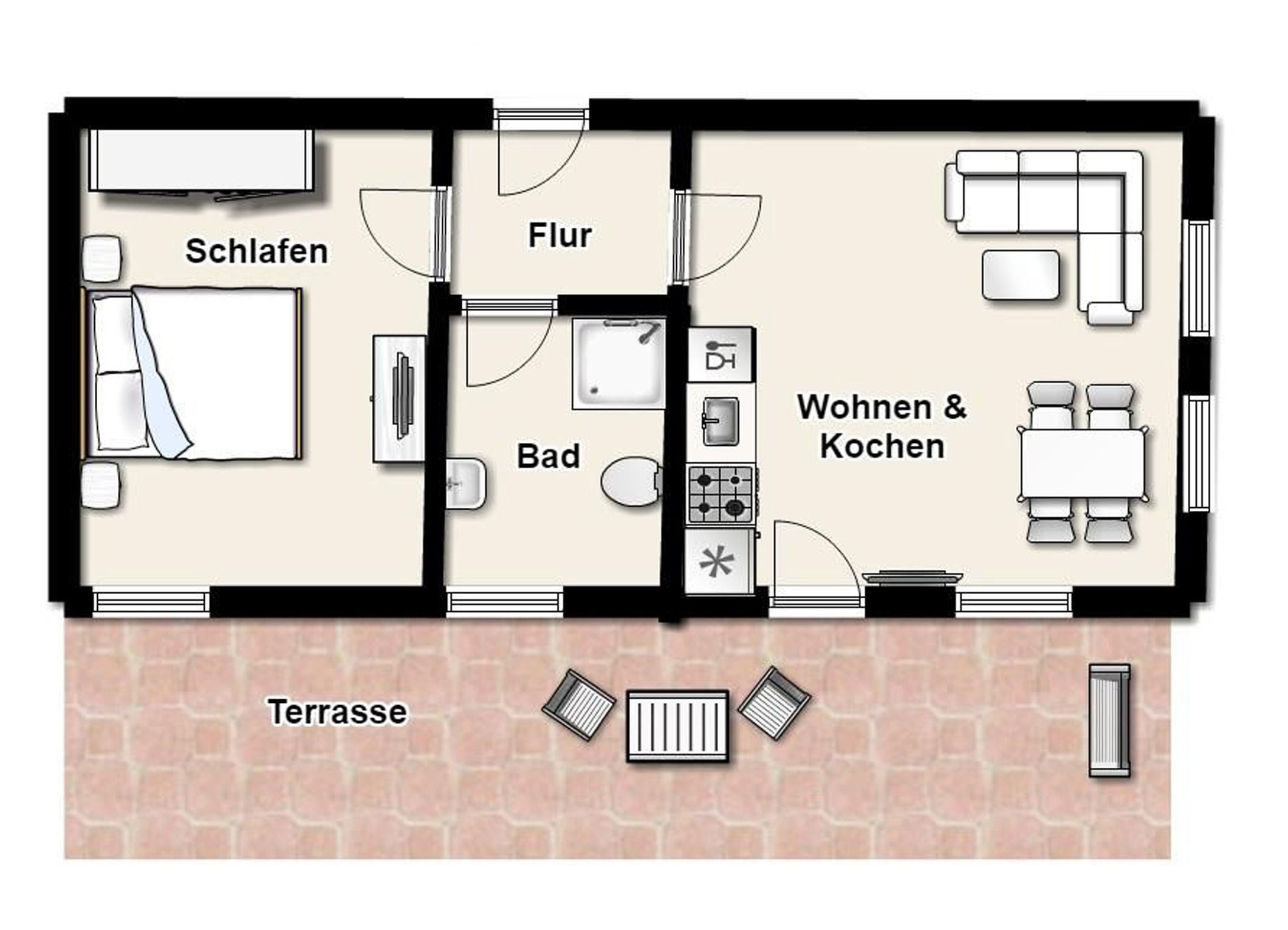 Es erwartet Sie die ebenerdige 2-Raum-Nichtraucherwohnung 30RB4 im Erdgeschoß der Villa Frigga. Sie ist 52 qm groß, verfügt über zwei Terrassen und ist für bis zu 4 Personen ausgelegt.