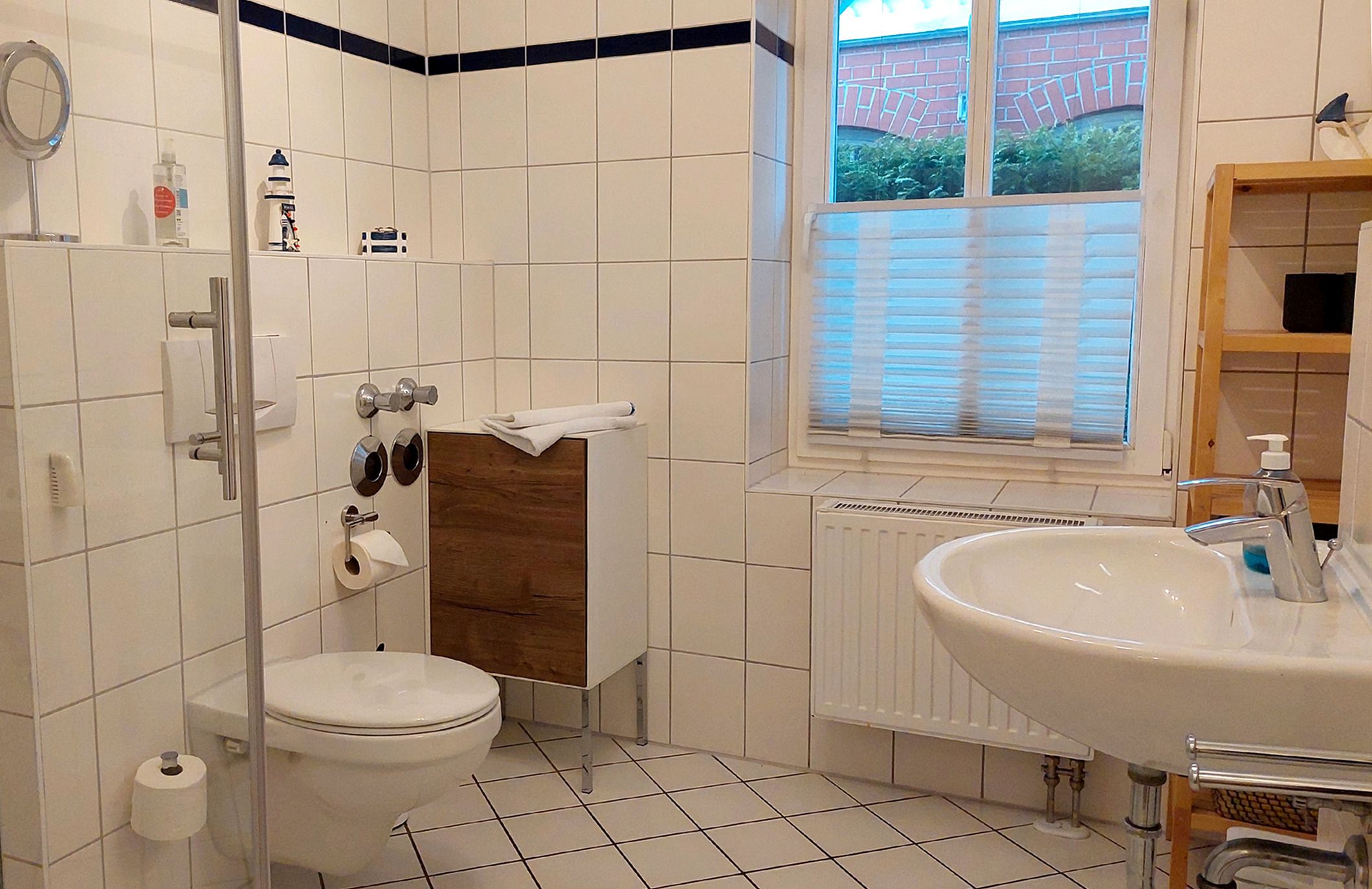 Das Badezimmer verfügt über Dusche, WC, Waschtisch und ausreichend Ablagefläche.