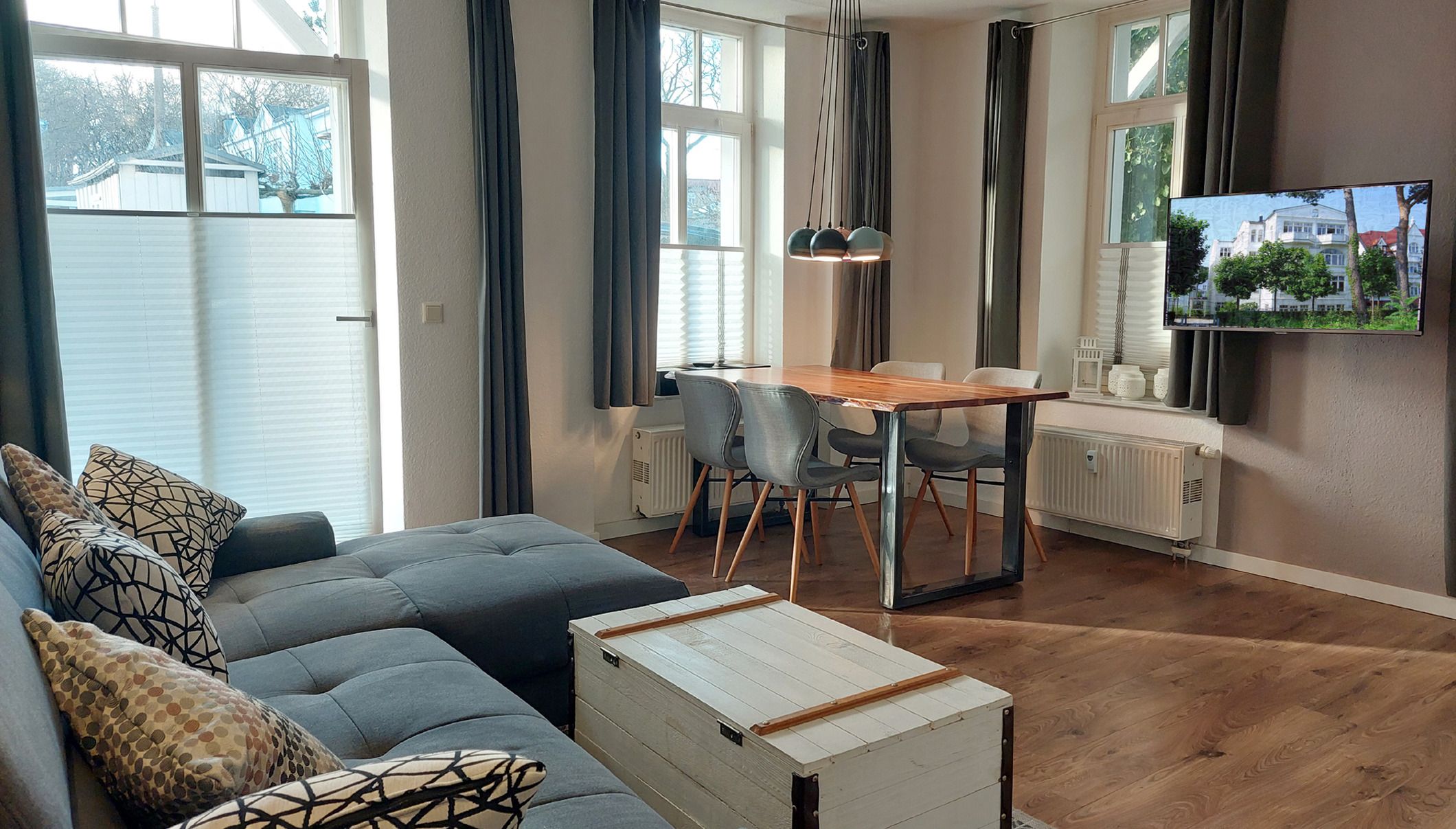 Es gibt kostenfreies WLAN-Netz, eine Stereoanlage und einen großen Flachbild-TV, welcher durch seinen Schwenkmechanismus vom gesamten Wohnbereich einsehbar ist.