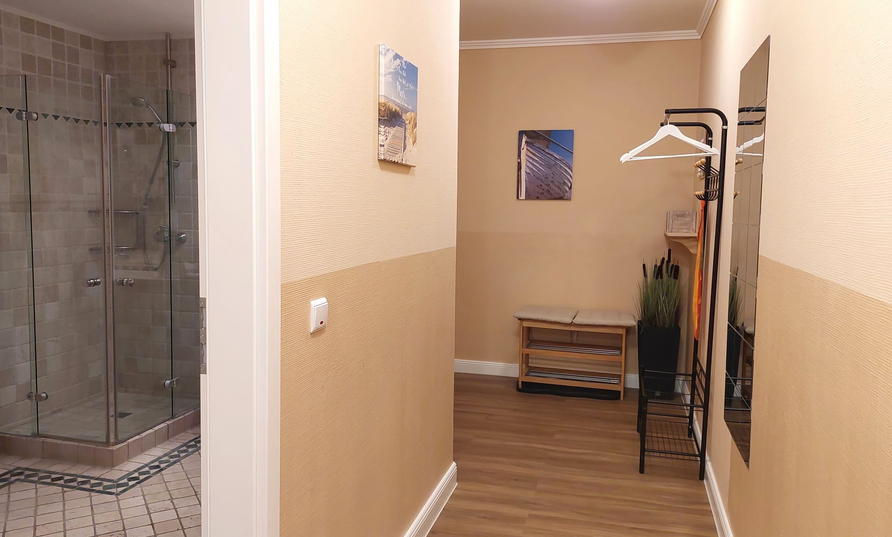 Über den geräumigen Flur samt Garderobe und Sitzgelegenheit gelangen Sie in das Badezimmer, in den Wohnbereich und in beide Schlafzimmer.