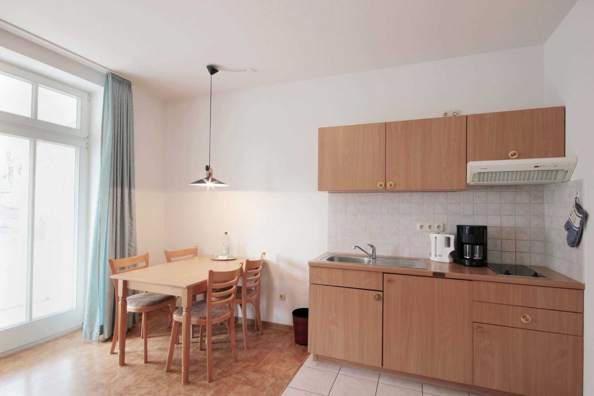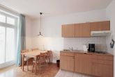 Die Wohnküche ist mit einem Kühlschrank, Kochfeld, Mikrowelle, Kaffeemaschine, Wasserkocher, Toaster und diversen Kleingeräten ausgestattet. Ein sonniger in Richtung Süden gerichteter Balkon schließt sich dem Wohnbereich an.