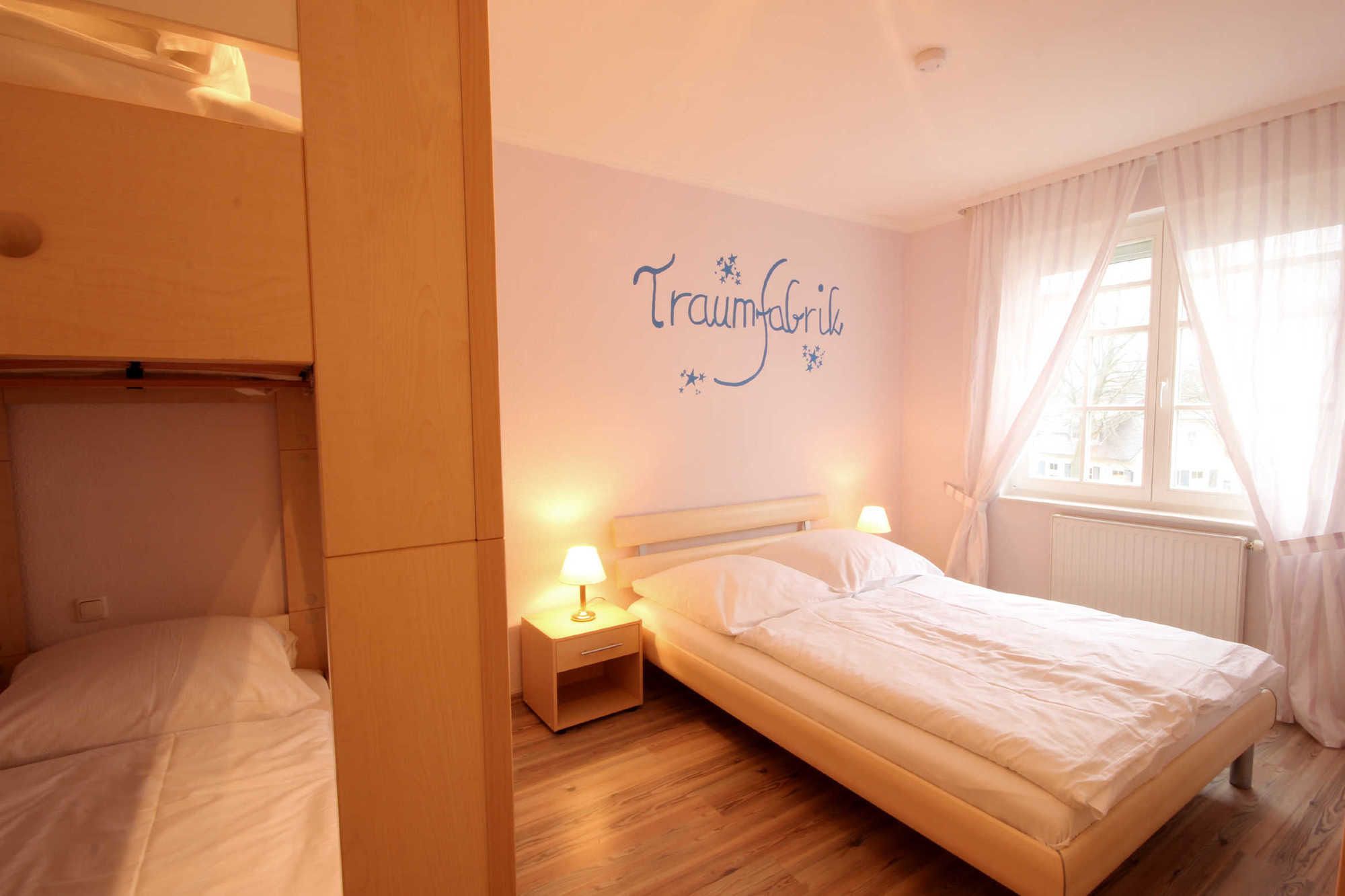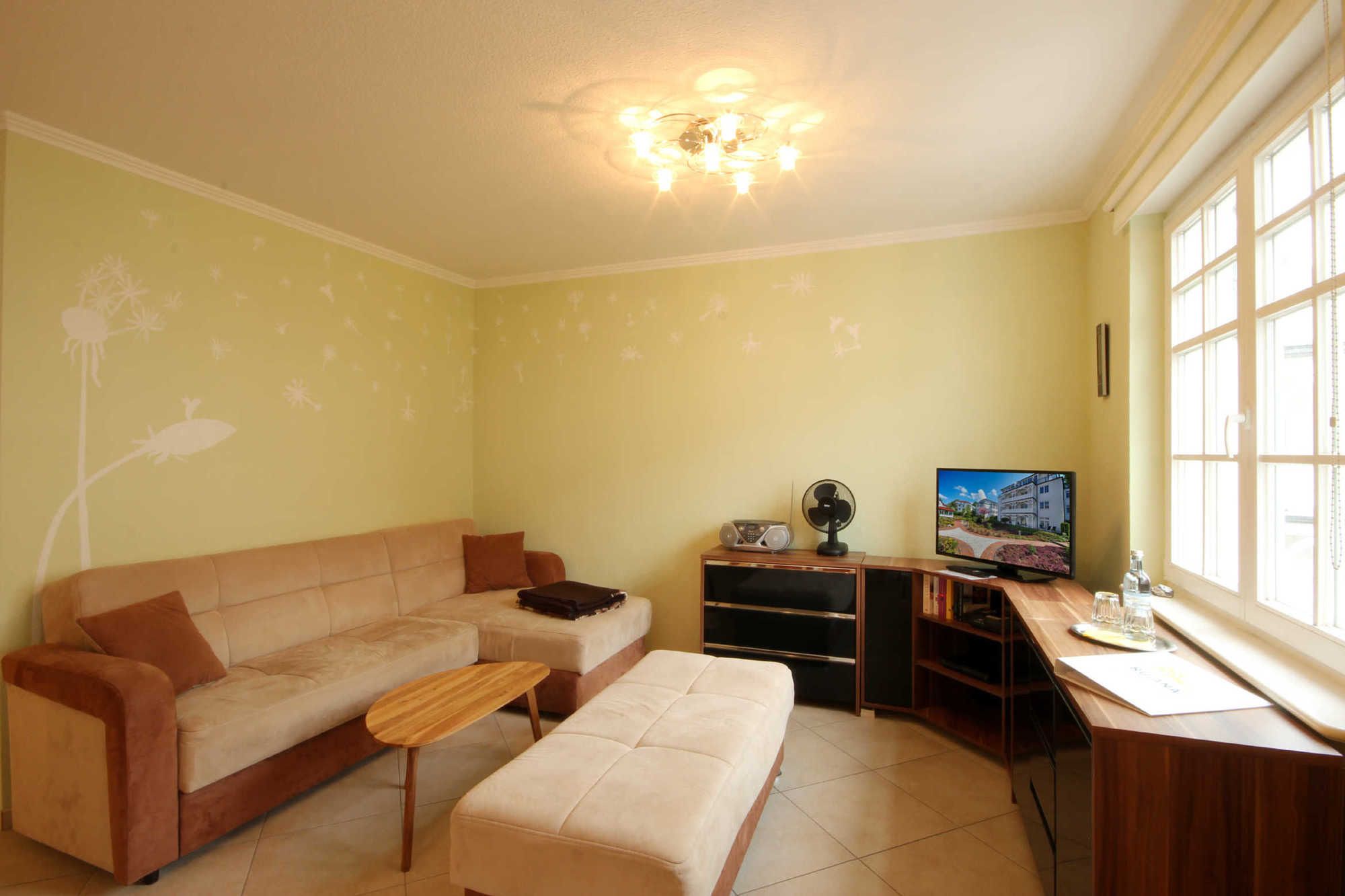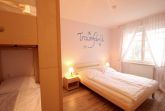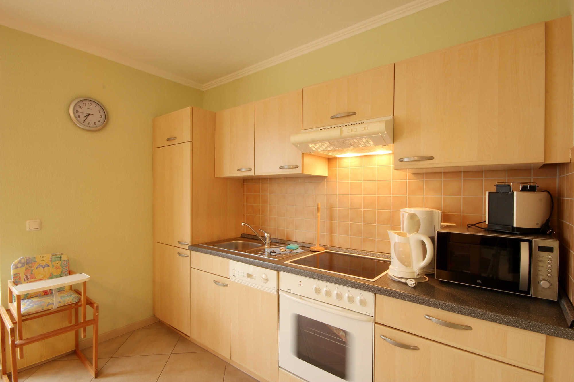 Neben dem gemütlichen Wohnraum mit integrierter Wohnküche gibt es einen Schlafraum sowie ein Badezimmer mit Eckbadewanne, Waschtisch und WC. Der Schlafraum ist mit einem französischen Doppelbett (Breite 140cm/durchgehende Matratze,, einem Doppelstockbett für die 3. und 4. Person sowie einem Kleiderschrank ausgestattet. Außerdem finden Sie im Wohnbereich neben der komfortablen Sitzecke mit TV, DVD-Player mit einer kleinen Auswahl an DVDs, auch einen separaten Essplatz. Die Küchenzeile verfügt über ein Ceranfeld, Backofen, Mikrowelle, Geschirrspüler, Kaffeemaschine, Toaster, Wasserkocher sowie weitere kleine Küchenhelfer. Von dem überdachten Balkon haben Sie einen schönen Blick in die Residenz mit gepflegter Gartenanlage. Ab sofort können alle unsere Gäste einen kostenfreien WLAN-Zugang nutzen.