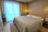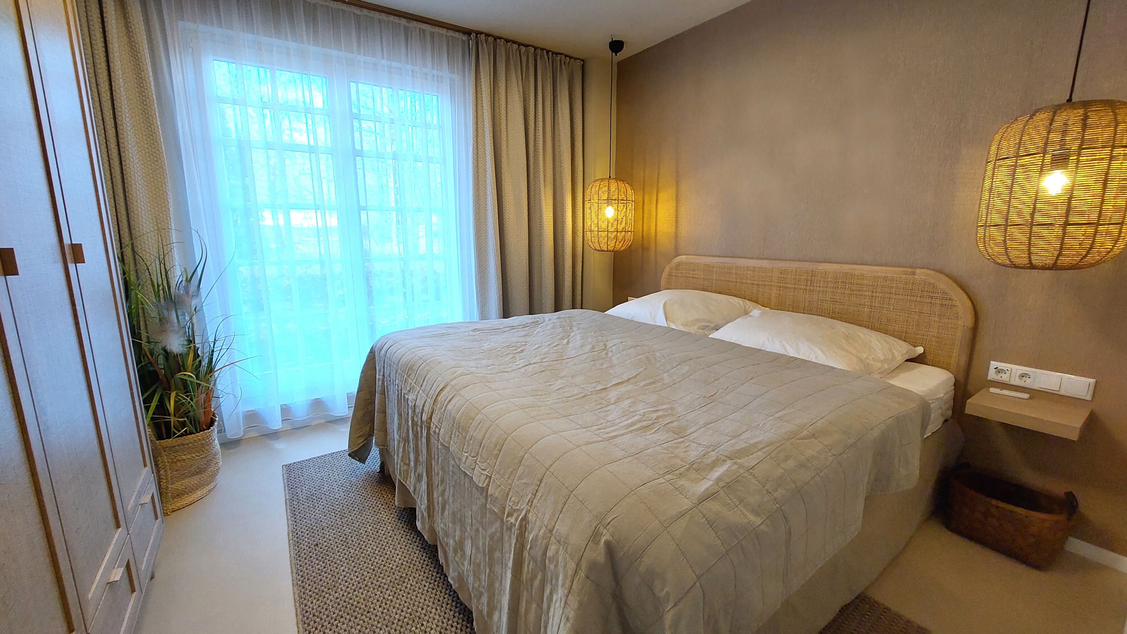 Das Schlafzimmer verfügt über ein Doppelbett samt Nachtischen sowie einen Kleiderschrank und Zugang zur Terrasse.