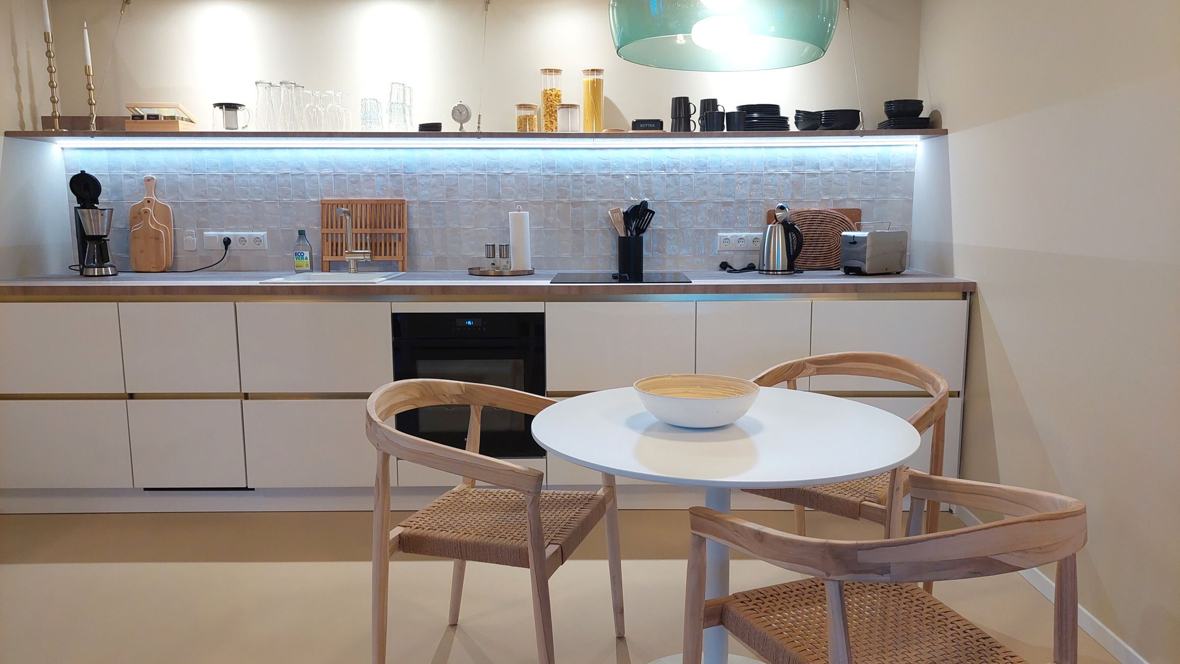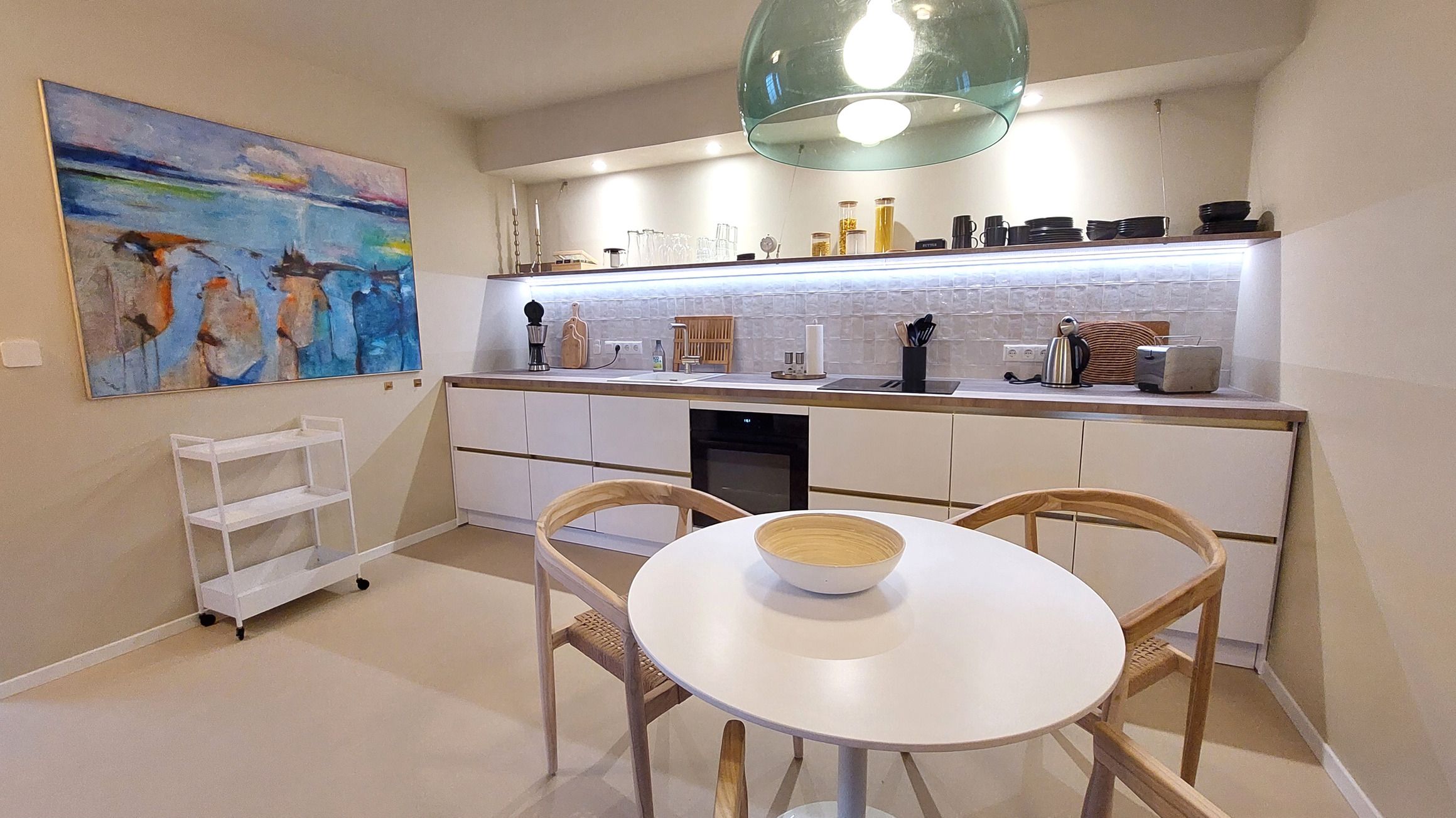 Im großzügigem Wohnbereich befindet sich eine moderne, offene Küchenzeile samt Esstisch für bis zu 3 Personen.