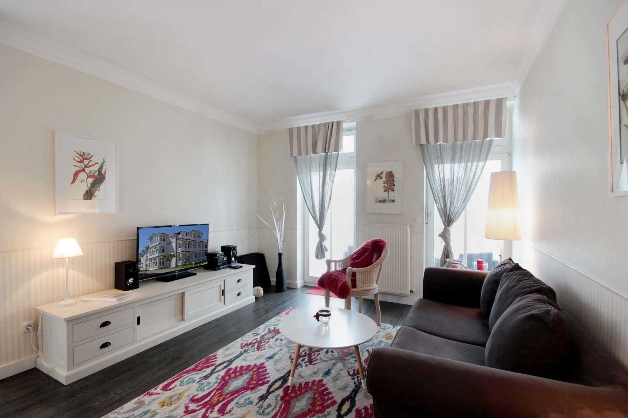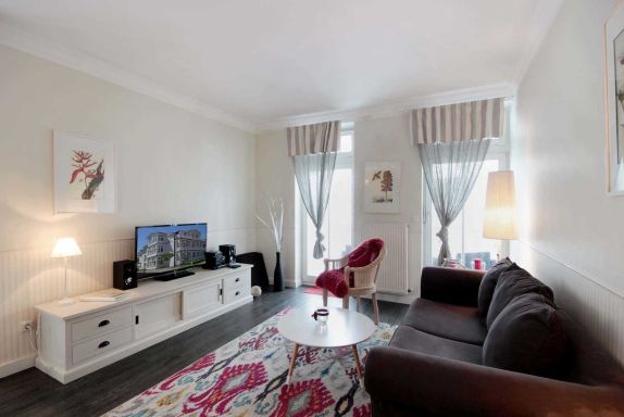 Diese modern ausgestattete 2-Raum-Nichtraucher-Wohnung verfügt über einen großzügigen Wohnbereich mit Schlafcouch, Flachbild-TV, Blu-Ray-Player und eine Musikanlage. Der helle Wintergarten mit Essplatz und die integrierte volleingerichtete Wohnküche mit Geschirrspüler, Backofen, Cerankochfeld, Kaffeemaschine, Wasserkocher und Toaster lädt zum gemeinsamen Essen und Kochen ein. Das Schlafzimmer ist mit einem gemütlichen Doppelbett und einem großen Kleiderschrank ausgestattet. Das hochwertige Badezimmer mit Waschtisch, WC, Dusche und festinstalliertem Fön komplettiert dieses schöne Appartement.