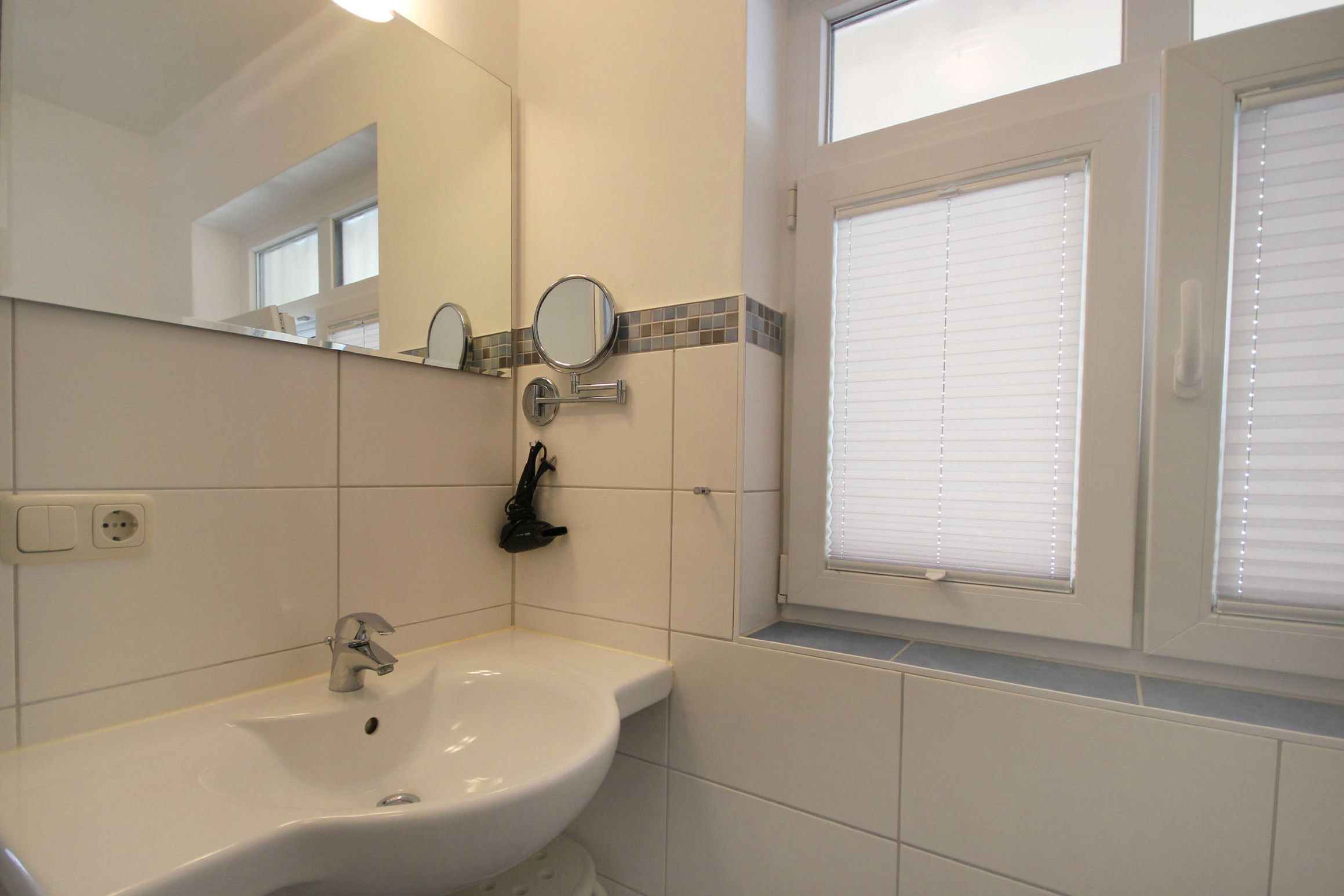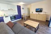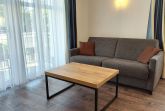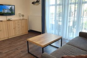 Diese freundliche Wohnung ist aufgeteilt in einen Wohnraum mit kleiner Terrasse und integrierter Küchenzeile, ein Schlafzimmer und ein Duschbad mit Waschtisch und WC. Das Wohnzimmer begrüßt Sie mit einem Schlafsofa und Sessel sowie Flachbild-TV. Das Schlafzimmer verfügt über ein Doppelbett (1,80m x 2m) sowie einen Kleiderschrank. Die Küchenzeile ist mit Backofen, Geschirrspüler, Cerankochfeld, Kühlschrank mit kleinem Gefrierfach, Cerankochfeld, Mikrowelle, Kaffeemaschine, Wasserkocher und Toaster ausgestattet. Highlights: Kostenfreies WLAN sowie ein frei wählbarer PKW-Stellplatz direkt am Haus. Haustiere sind in dieser Wohnung herzlich willkommen.