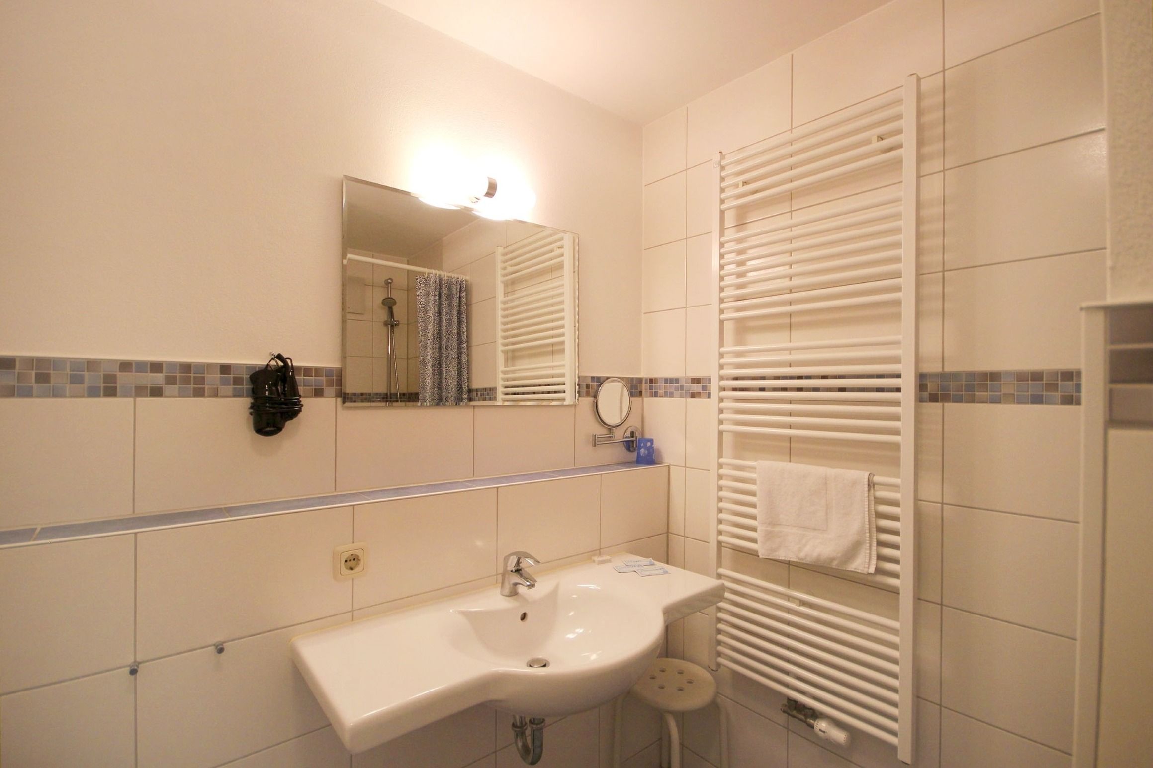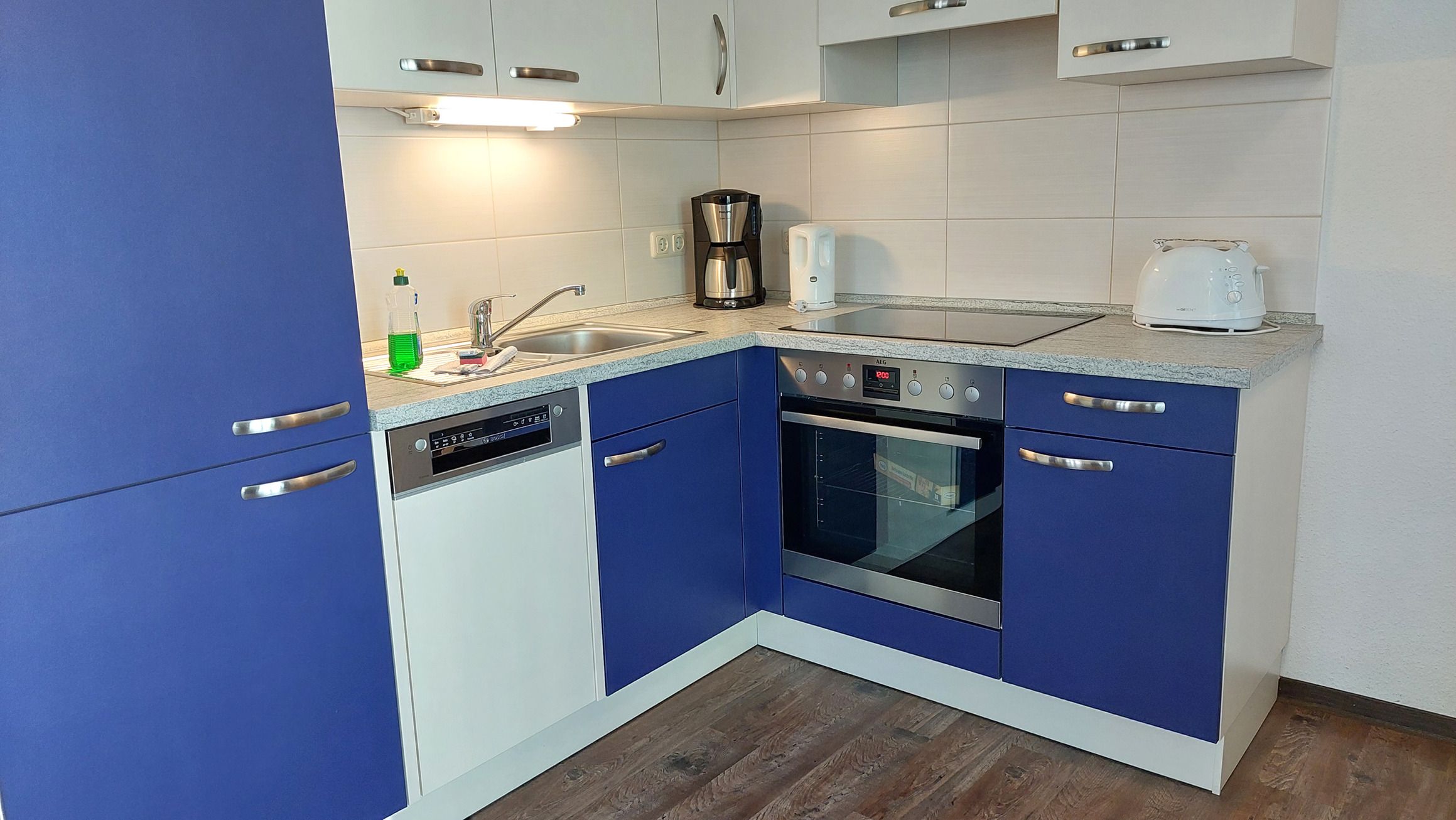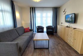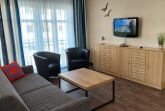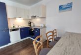 Diese freundliche Wohnung ist aufgeteilt in einen Wohnraum mit Balkon und integrierter Küchenzeile, zwei Schlafzimmer und ein Bad mit Dusche, Waschtisch und WC. Das Wohnzimmer begrüßt Sie mit einem Schlafsofa und Sessel sowie Flachbild-TV. Das Hauptschlafzimmer verfügt über ein Doppelbett (1,80m x 2m) sowie einen Kleiderschrank. Der zweite Schlafraum ebenso mit Balkon begrüßt Sie mit einem Etagenbett, Kleiderschrank und TV. Die Küchenzeile ist mit Backofen, Geschirrspüler, Cerankochfeld, Kühlschrank mit kleinem Gefrierfach, Cerankochfeld, Mikrowelle, Kaffeemaschine, Wasserkocher und Toaster ausgestattet. Highlights: Kostenfreies WLAN sowie ein frei wählbarer PKW-Stellplatz direkt am Haus. Haustiere sind in dieser Wohnung herzlich willkommen.