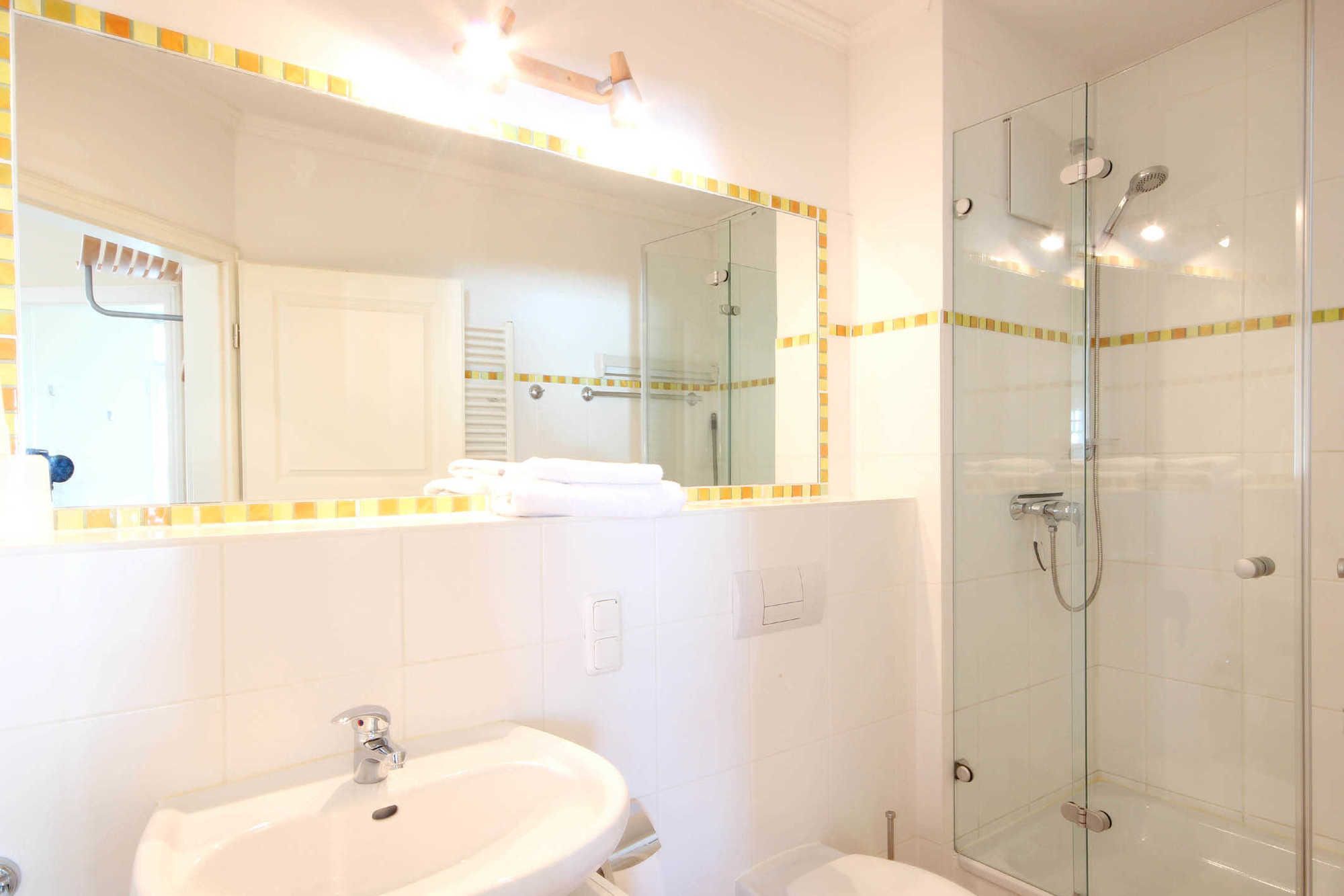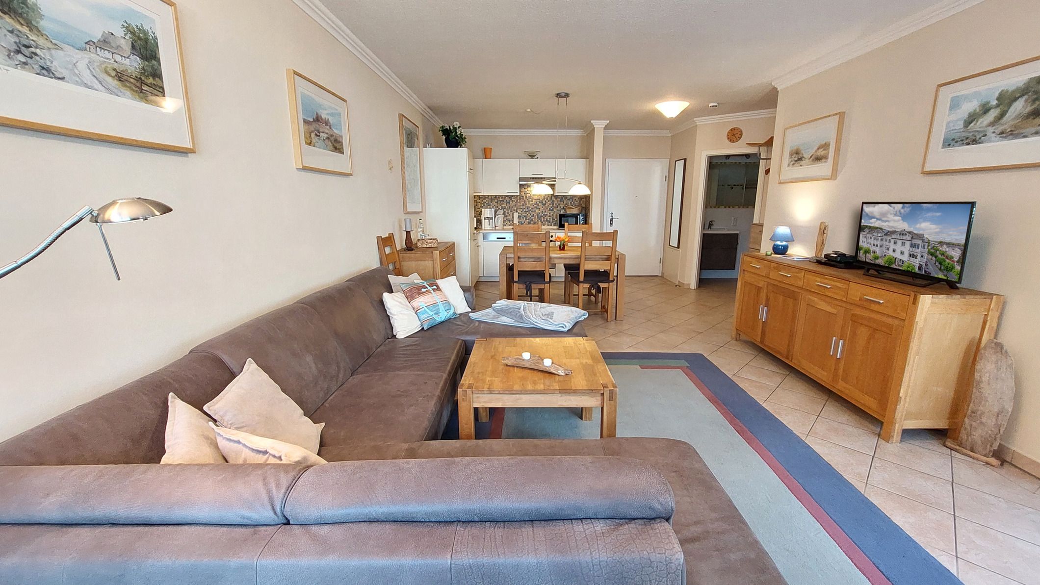 Ihre gemütlich eingerichtete Ferienwohnung 21RB1 befindet sich im 1. Obergeschoss. Die 2-Raum Wohnung mit Wintergarten hat eine Größe von ca. 54 qm und ist mit bis zu 6 Personen belegbar. Neben dem Wohnraum mit integrierter Küche gibt es einen Schlafraum, ein Badezimmer mit Waschtisch, großer Dusche und WC sowie einen Wintergarten. Im Wohnbereich können auf dem Schlafsofa 2 Personen schlafen, im Wintergarten auf dem zweiten Schlafsofa ebenfalls 2 Personen. Sie finden im Wohnraum einen Sitz- und Essplatz, ein Fernsehgerät und eine Stereoanlage. Die Küche mit Geschirrspülmaschine, Backofen, Herd, Kühlschrank, Mikrowelle und diversen Kleingeräten komplettiert die Ausstattung. Eine wohnungseigene Waschmaschine (im Waschraum) steht gebührenfrei zu Ihrer Verfügung. Fahrräder können im Kellerbereich abgestellt werden. Ein Garagenstellplatz ( Duplexparker - 1.50 m hoch ) gehört zur Wohnung. Alle unsere Gäste haben einen kostenfreien W-Lan Zugang in dieser Wohnung.