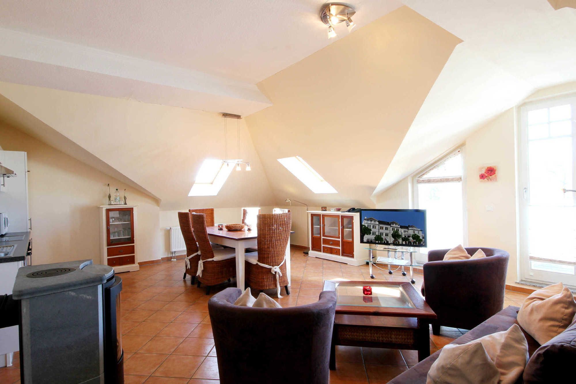 Neben dem Wohnraum mit integrierter Küche gibt es zwei separate Schlafräume, ein Badezimmer mit Waschtisch, Dusche und WC und eine separate Gästetoilette. In den Schlafräumen befinden sich jeweils zwei Betten und ein Kleiderschrank. Im Wohnraum können auf dem großen Schlafsofa zwei weitere Personen schlafen. Wohnung. Die gesamte Wohnung ist mit hochwertigen Möbeln im Landhausstil eingerichtet. Im Wohnraum befindet sich ein schöner Kaminofen, Flachbild-TV und einen kostenlosen WLAN-Zugang. Ein großer Esstisch sowie die Küchenzeile mit Geschirrspülmaschine, Backofen, Herd, Kühlschrank und diversen Kleingeräten komplettiert die Ausstattung.