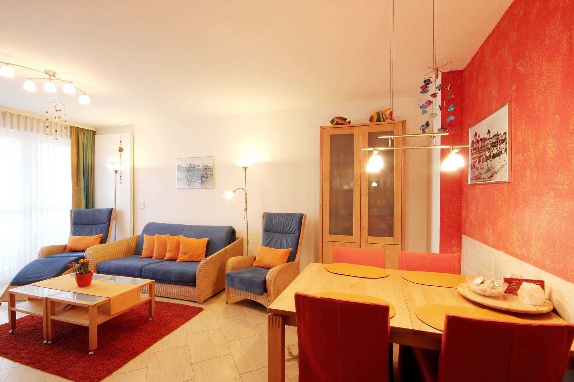 Ihre Ferienwohnung 24RB2 befindet sich im Hochparterre des Hauses. Sie ist ca. 52 qm groß und ideal für 2 Erwachsene und 1 Kind geeignet. Auch kleinere Haustiere bis ca. 12kg sind herzlich willkommen. Der geräumige Balkon lädt Sie zum Verweilen ein. Die liebevoll eingerichtete 2 Raum Wohnung wird auch gern „Muschelwohnung“ genannt, welches sich in maritimen Details widerspiegelt. Im Wohnzimmer befindet sich ein Schlafsofa und ein Essplatz. Zur technischen Ausstattung gehört die kostenfreie W-LAN Nutzung, ein Flachbildfernseher, eine Musikanlage und DVD-Player. Die Küchenzeile befindet sich im Flur der Wohnung bietet Geschirrspüler, Mikrowelle, 4-Plattenherd mit Backofen, Eier- und Wasserkocher sowie einer Kaffeemaschine komfortable ausgestattet. Das Duschbad bietet neben WC, Waschtisch und Handtuchheiztrockner zusätzlich einen fest integrierten Kosmetikspiegel. Im Schlafzimmer befindet neben dem Doppelbett, Nachttischschränkchen auch ein großer Spiegelkleiderschrank. Weiter Highlights sind: der hauseigene Sonnenschirm und Kinderhochstuhl, Wäschetrockner und Bügelbrett. Obendrein steht ein wohnungseigener Parkplatz in der Garage unter dem Haus zur Verfügung.