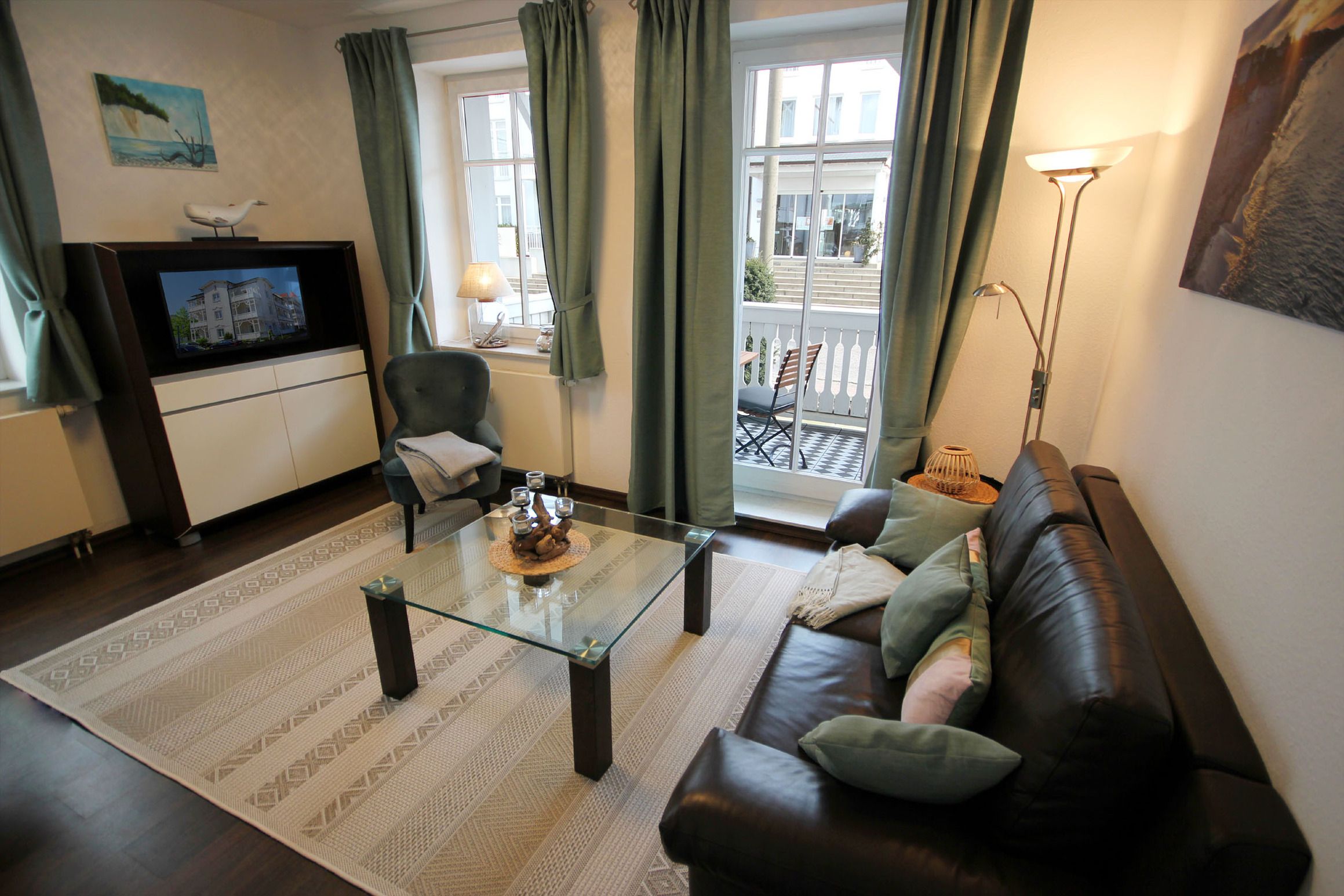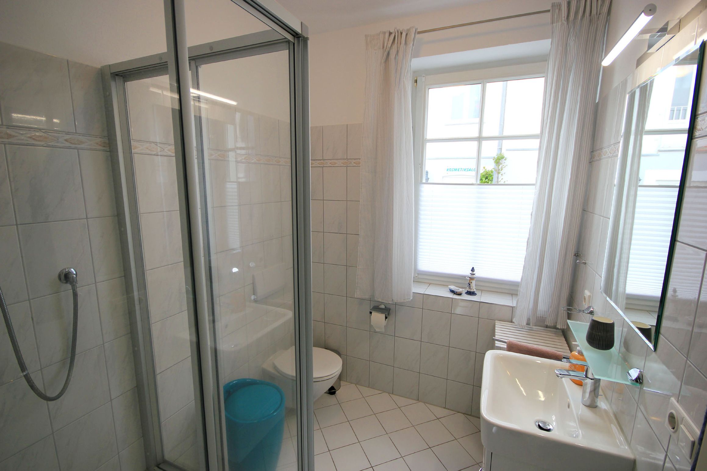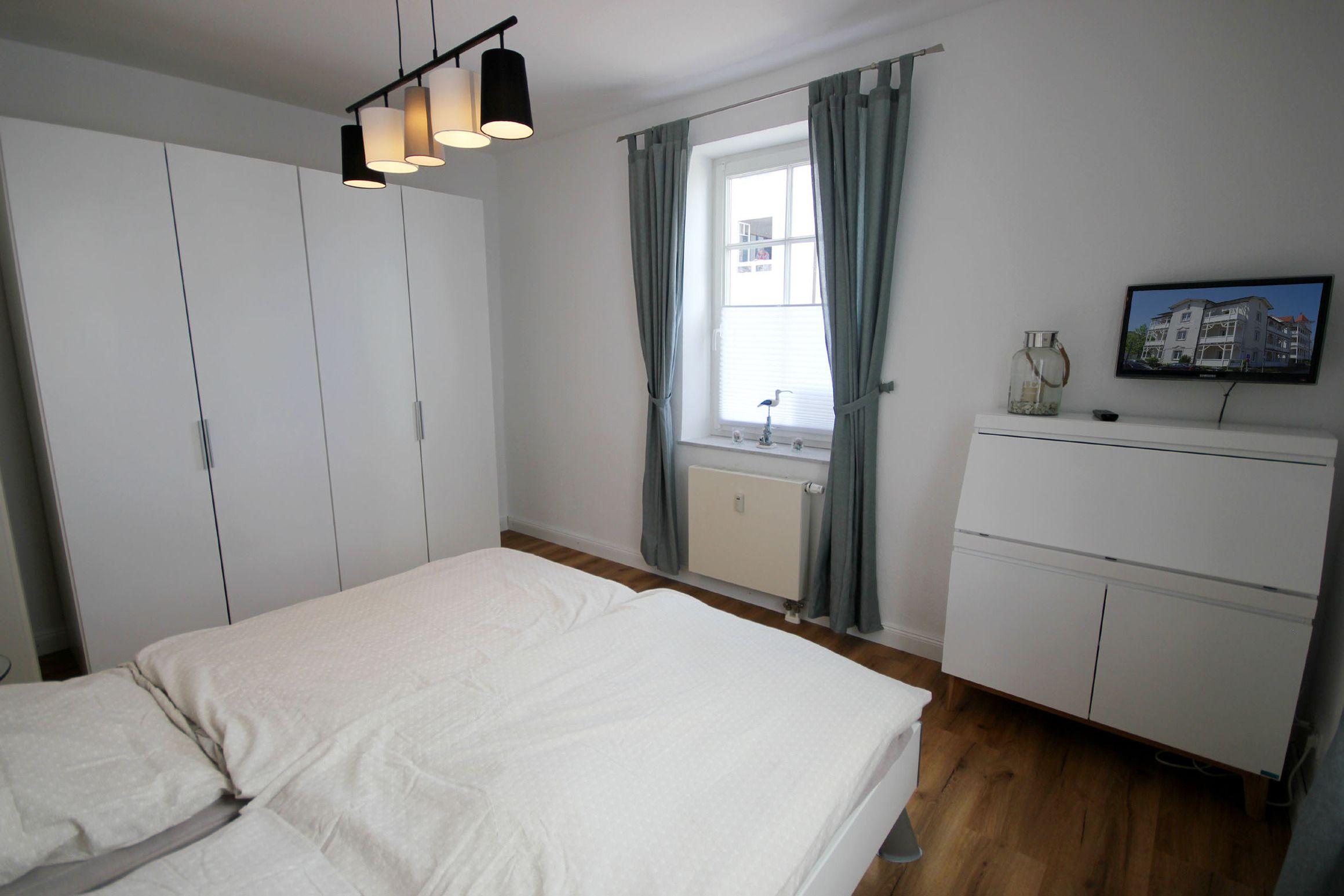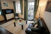 Ihre modern eingerichtete Ferienwohnung 1RB4 liegt im Erdgeschoß der Villa und hat eine große überdachte Terrasse. Das geräumige 2-Raum-Appartement bietet bis 4 Personen Platz für einen angenehmen Aufenthalt. Die Wohnung verfügt über einen Wohnraum mit halboffener Küche und integriertem Essplatz. Die gemütliche Sitzgruppe kann zur Doppelbettcouch umgebaut werden, TV und Radio finden Sie ebenfalls im Wohnbereich. Weiterhin gibt es im Appartement ein großes Schlafzimmer mit Doppelbett, TV und Kleiderschrank sowie ein Badezimmer mit Waschtisch, Dusche und WC. Alle unsere Gäste können einen kostenfreien W-LAN-Zugang nutzen. Ein weiteres Highlight ist der Sekretär mit integriertem 24 Zoll Monitor und Netzwerk-Anschluss im Schlafbereich. Wenn es doch einmal heißt, schnell noch was für die Arbeit erledigen, haben Sie damit die beste Möglichkeit. Ein Münz-Waschtrockner steht Ihnen im Keller des Nachbarhauses zur Verfügung. Den Fahrradabstellraum des Nachbarhauses können Sie ebenfalls nutzen. Ein Kfz-Stellplatz gehört auf dem Parkplatz Zentrum zur Wohnung.