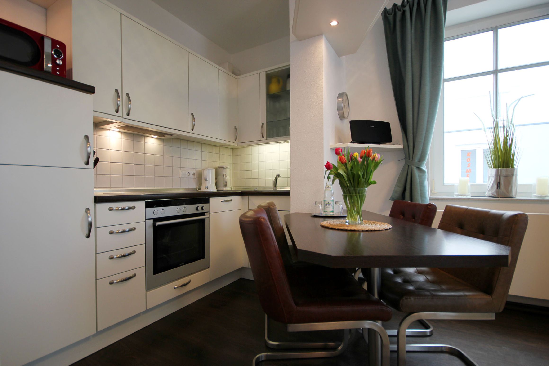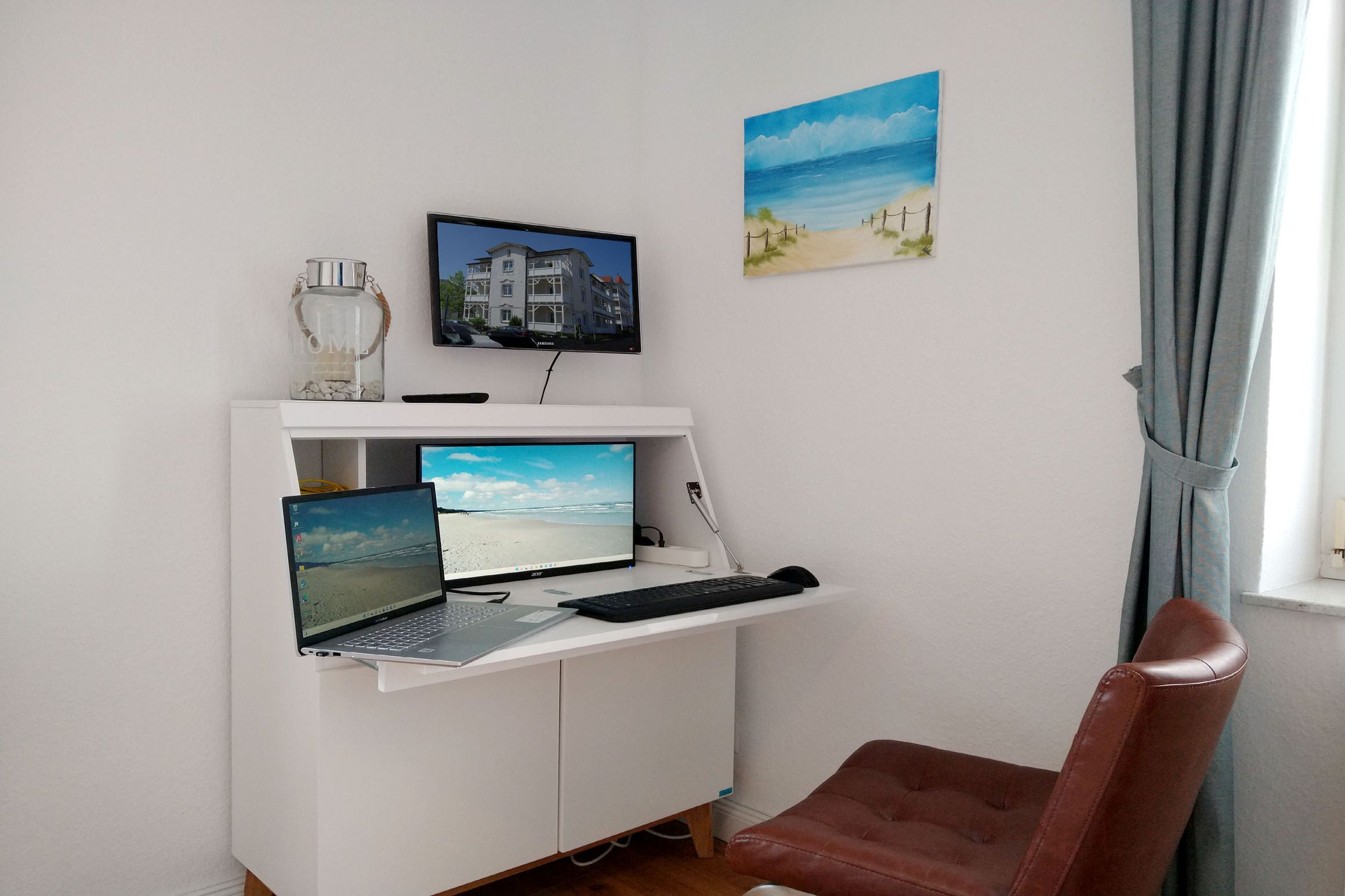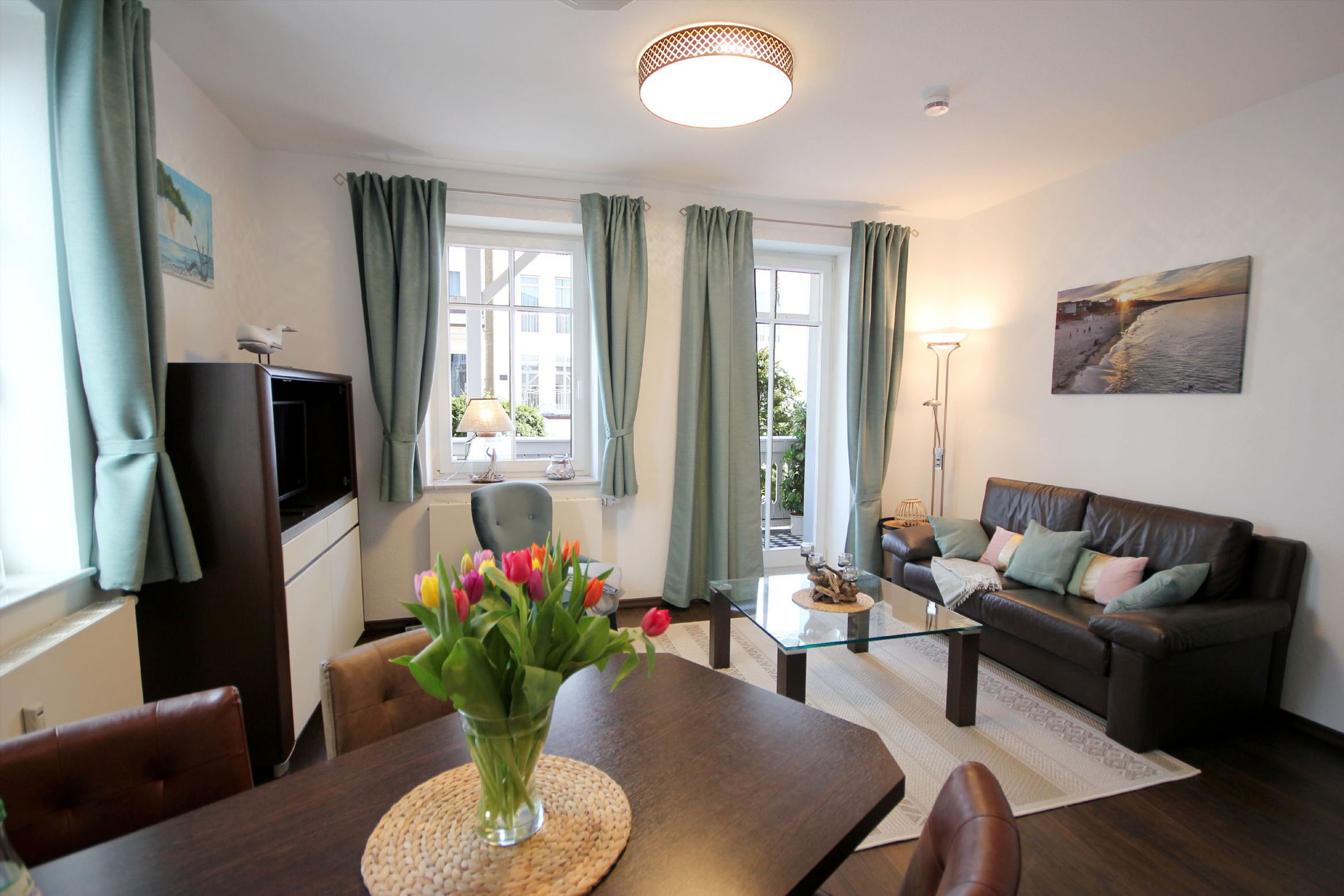 Ihre modern eingerichtete Ferienwohnung 1RB4 liegt im Erdgeschoß der Villa und hat eine große überdachte Terrasse. Das geräumige 2-Raum-Appartement bietet bis 4 Personen Platz für einen angenehmen Aufenthalt. Die Wohnung verfügt über einen Wohnraum mit halboffener Küche und integriertem Essplatz. Die gemütliche Sitzgruppe kann zur Doppelbettcouch umgebaut werden, TV und Radio finden Sie ebenfalls im Wohnbereich. Weiterhin gibt es im Appartement ein großes Schlafzimmer mit Doppelbett, TV und Kleiderschrank sowie ein Badezimmer mit Waschtisch, Dusche und WC. Alle unsere Gäste können einen kostenfreien W-LAN-Zugang nutzen. Ein weiteres Highlight ist der Sekretär mit integriertem 24 Zoll Monitor und Netzwerk-Anschluss im Schlafbereich. Wenn es doch einmal heißt, schnell noch was für die Arbeit erledigen, haben Sie damit die beste Möglichkeit. Ein Münz-Waschtrockner steht Ihnen im Keller des Nachbarhauses zur Verfügung. Den Fahrradabstellraum des Nachbarhauses können Sie ebenfalls nutzen. Ein Kfz-Stellplatz gehört auf dem Parkplatz Zentrum zur Wohnung.