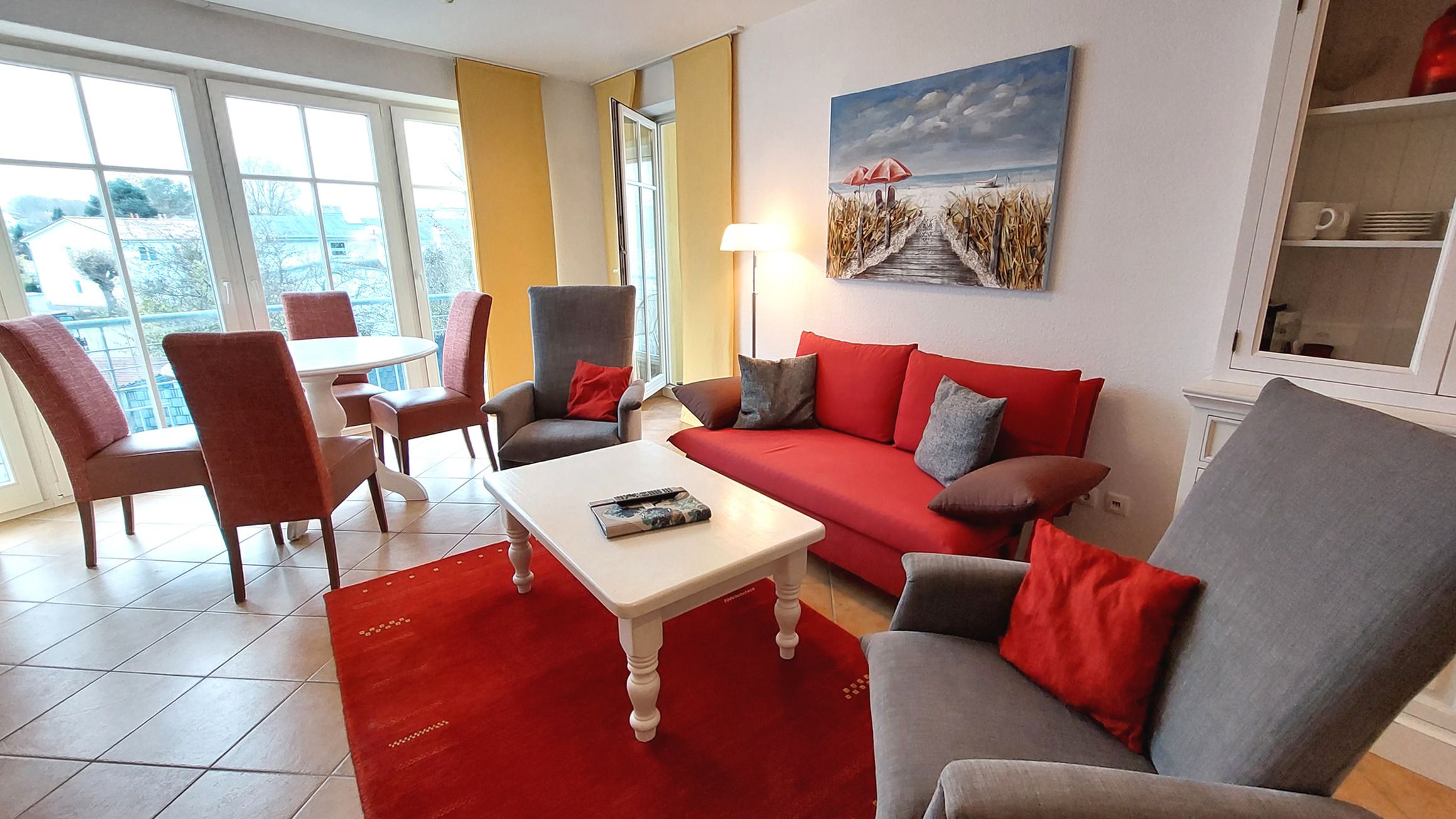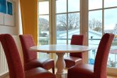 Eine große Fensterfront im Essbereich sorgt für viel natürliches Licht und bietet zudem einen tollen Ausblick. Hier finden bis zu 4 Personen Platz zum Essen. Die gemütliche Sitzlandschaft kann bei Bedarf auch als Schlafgelegenheit für zwei weitere Personen genutzt werden. Für Unterhaltung sorgen ein Smart-TV und ein Internetradio.