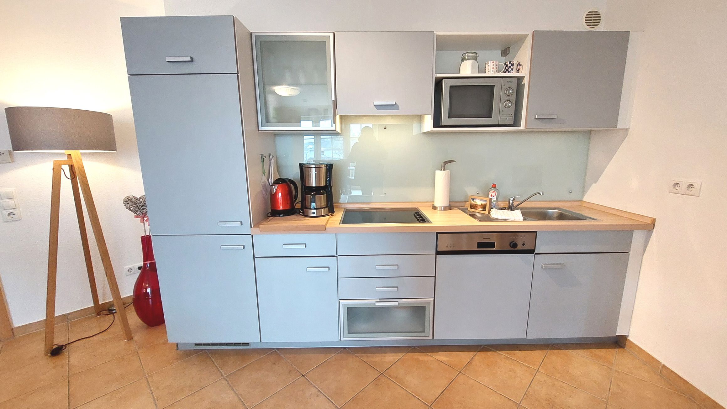 Der kombinierte Wohn-, Ess- und Kochbereich ist modern eingerichtet und bietet ausreichend Platz. Die Küchenzeile verfügt über ein Cerankochfeld, Mikrowelle, Geschirrspüler, Kühlschrank mit Gefrierfach und weitere Küchenhelfer. Im Airfryer der Marke Ninja können Brötchen perfekt aufgebacken werden.